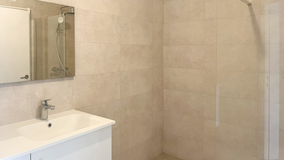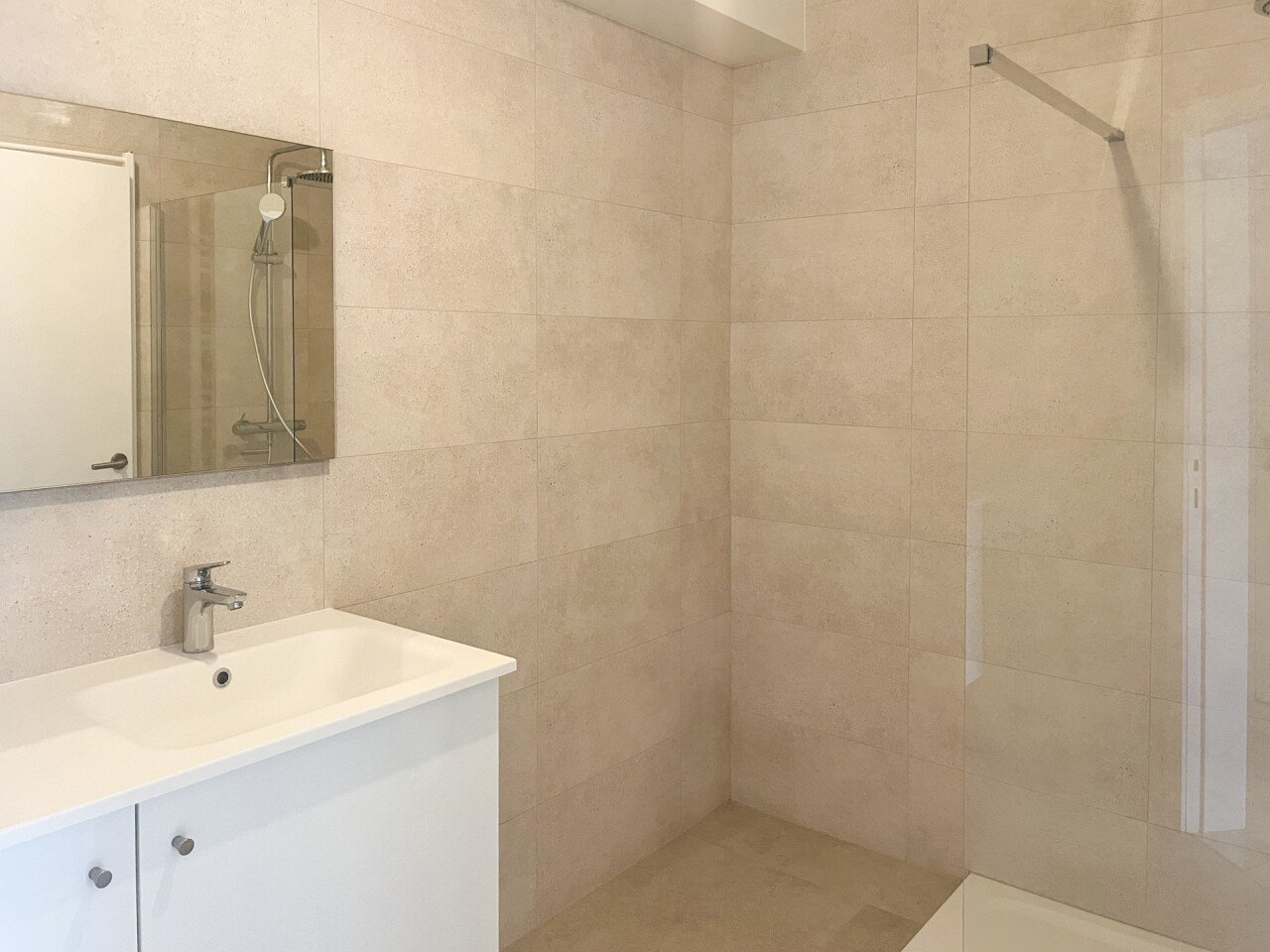 Wanneer we in de richting van de slaapkamers lopen, passeren we een praktische berging en een ruime badkamer. De badkamer werd onlangs volledig gemoderniseerd met een stijlvolle inloopdouche. De twee slaapkamers bevinden zich aan de achterzijde van het appartement.