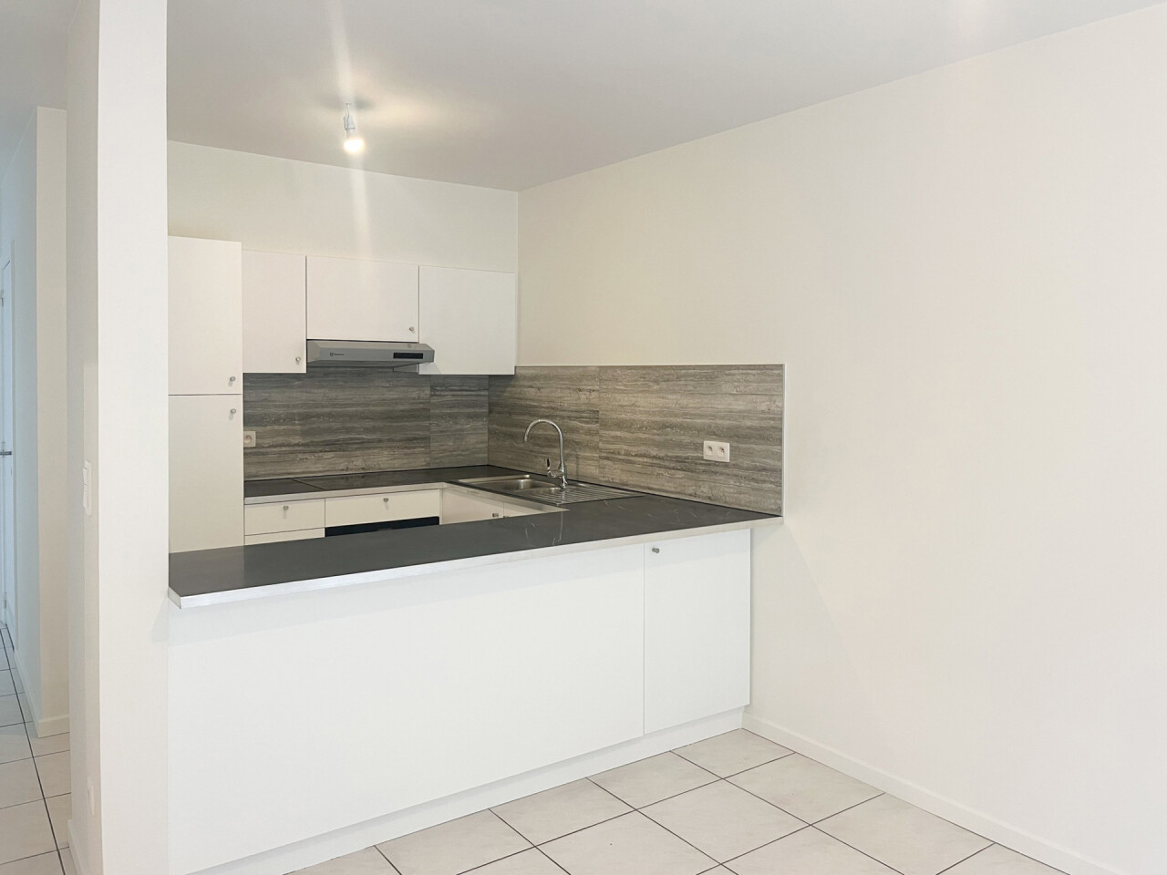 Via de inkomhal lopen we het appartement binnen naar de lichtrijke leefruimte met aansluitend de keuken die volledig gerenoveerd is.