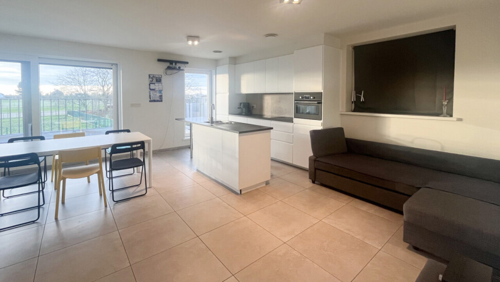 We betreden het appartement via de inkomhal die toegang geeft tot de ruime en lichtrijke leefruimte met volledig geïnstalleerde, open keuken.