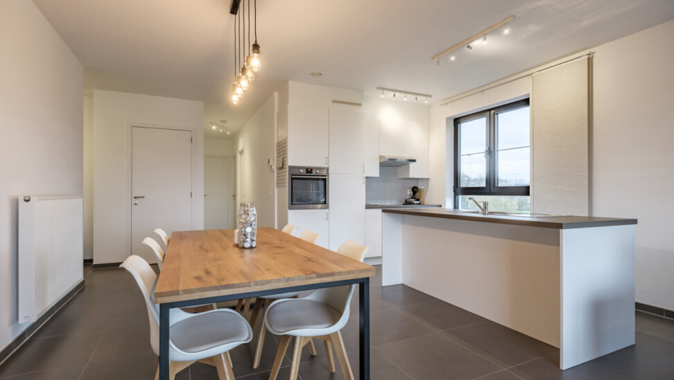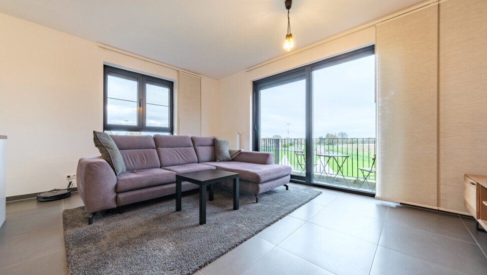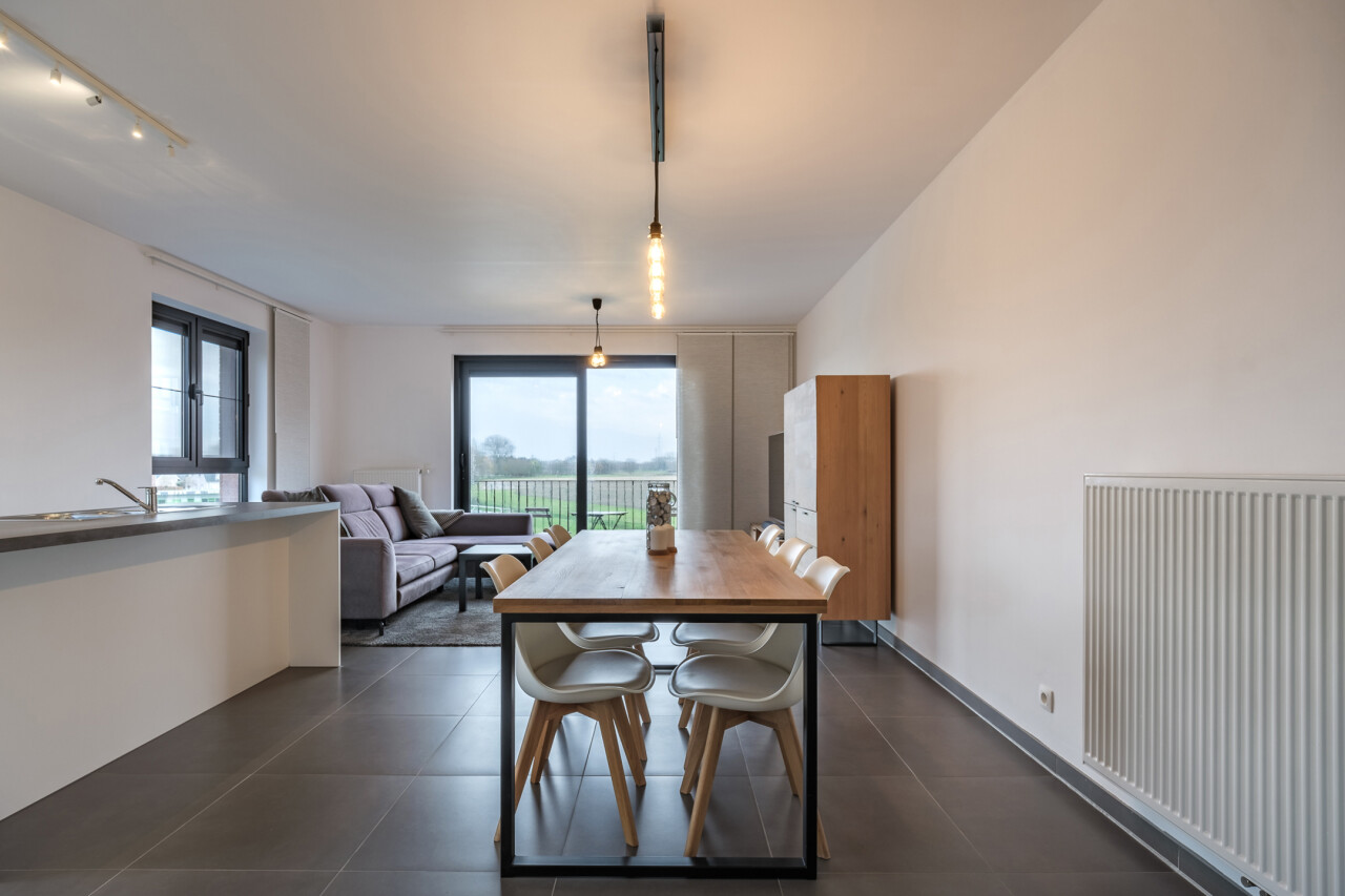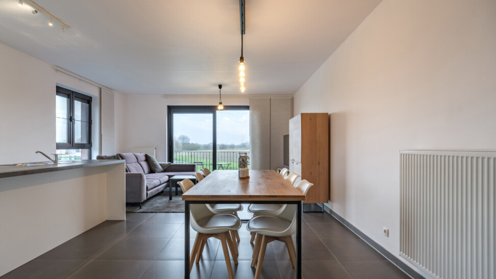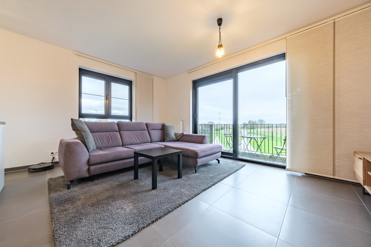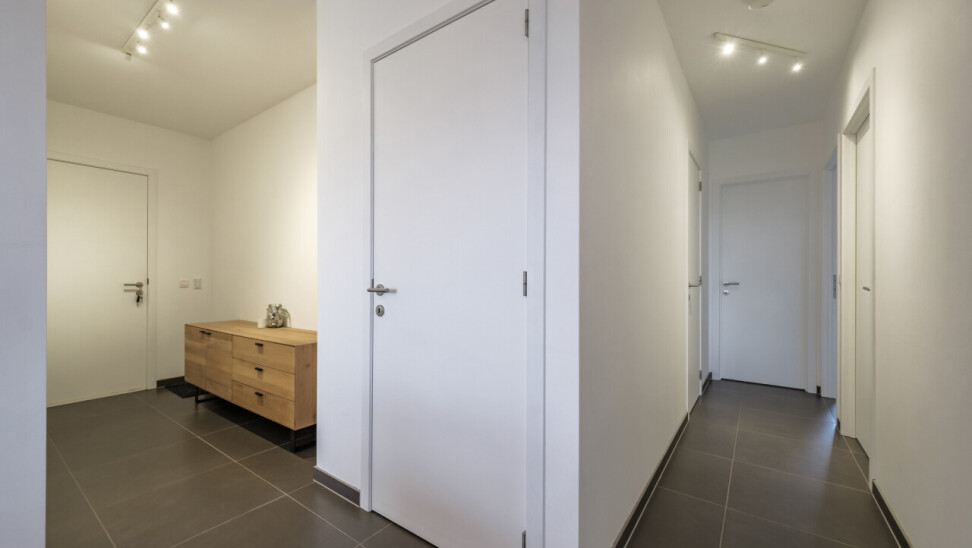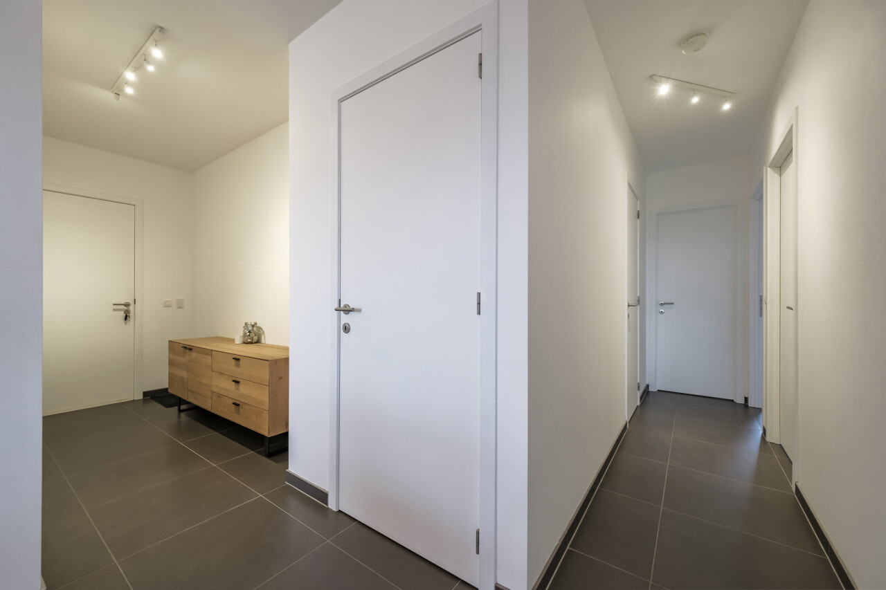 Wanneer we binnenkomen betreden we de ruime inkomhal die toegang geeft tot de leefruimte met volledig geïnstalleerde, open keuken. Wanneer we deze ruimte betreden, valt ons oog meteen op de grote raampartijen die zorgen voor een natuurlijke lichtinval in de leefruimte. Verder biedt het appartement twee slaapkamers, een badkamer voorzien van ligbad en dubbele lavabo, een gastentoilet en een praktische berging.