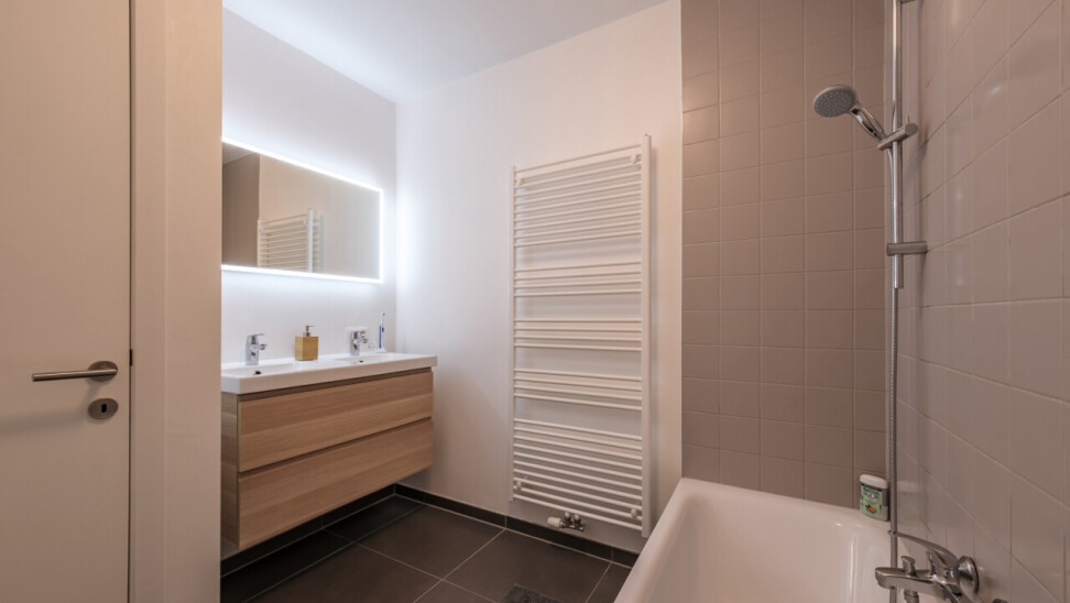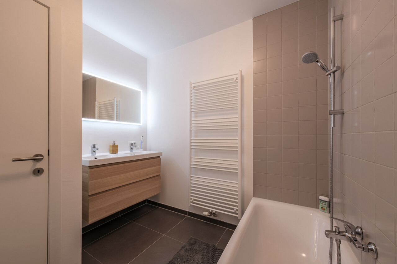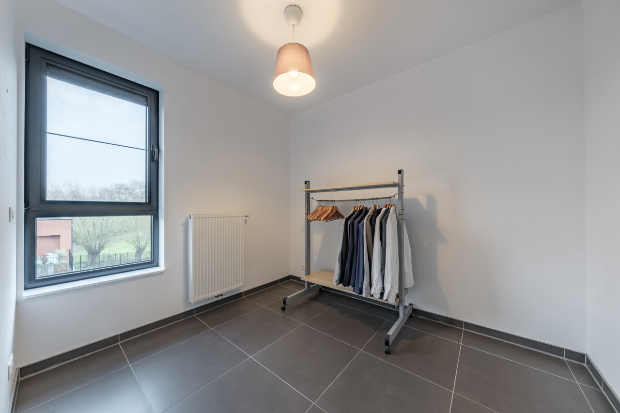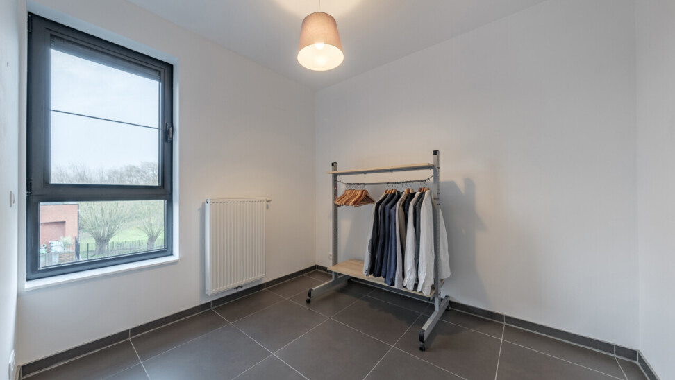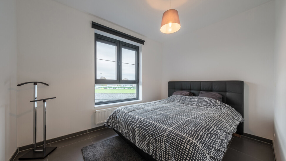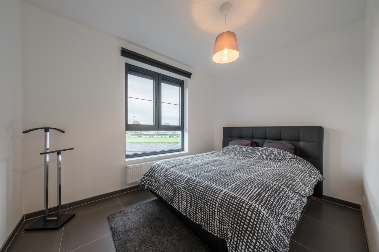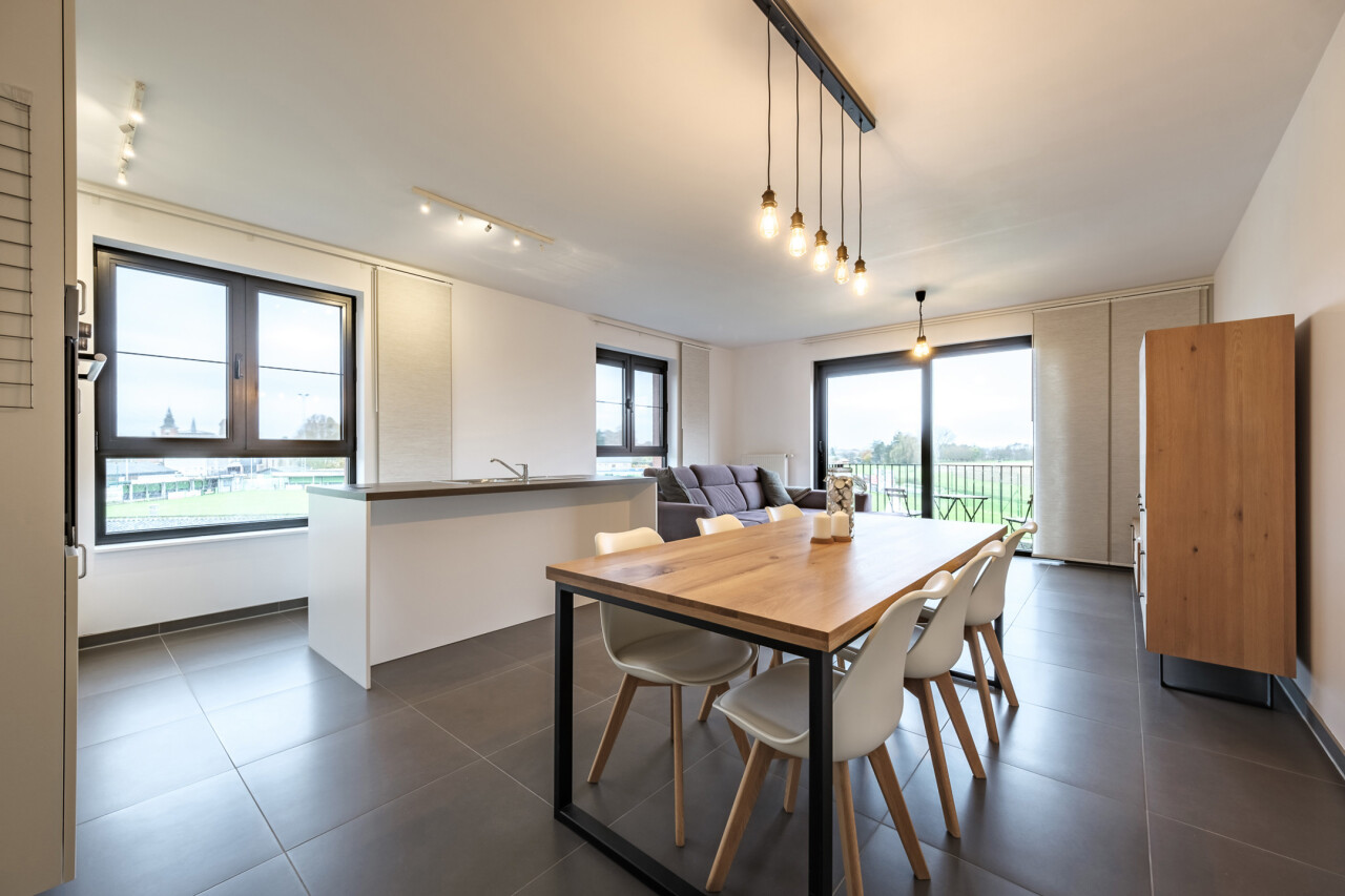 Wanneer we binnenkomen betreden we de ruime inkomhal die toegang geeft tot de leefruimte met volledig geïnstalleerde, open keuken. Wanneer we deze ruimte betreden, valt ons oog meteen op de grote raampartijen die zorgen voor een natuurlijke lichtinval in de leefruimte. Verder biedt het appartement twee slaapkamers, een badkamer voorzien van ligbad en dubbele lavabo, een gastentoilet en een praktische berging.