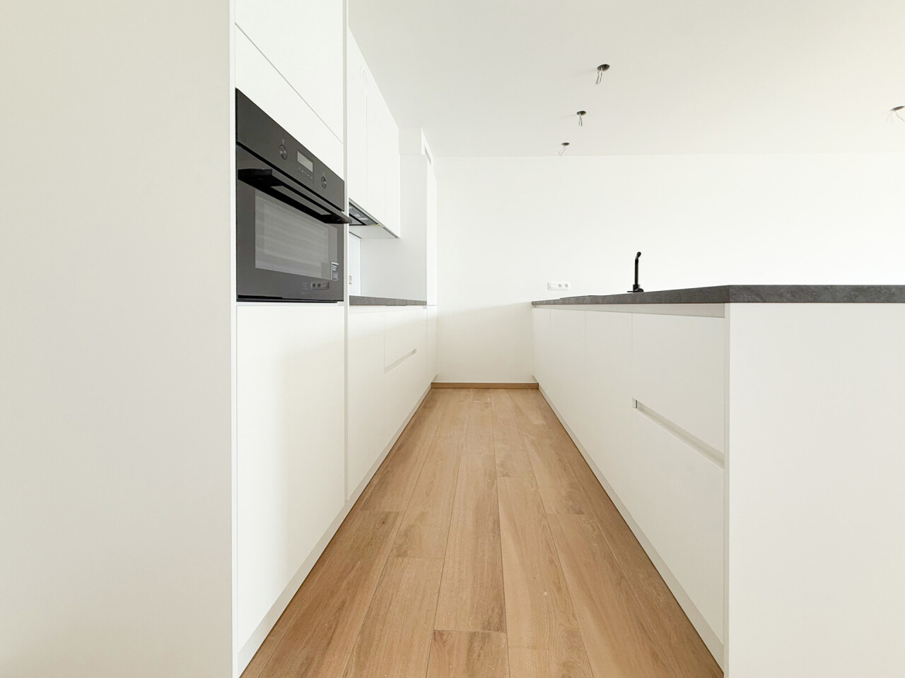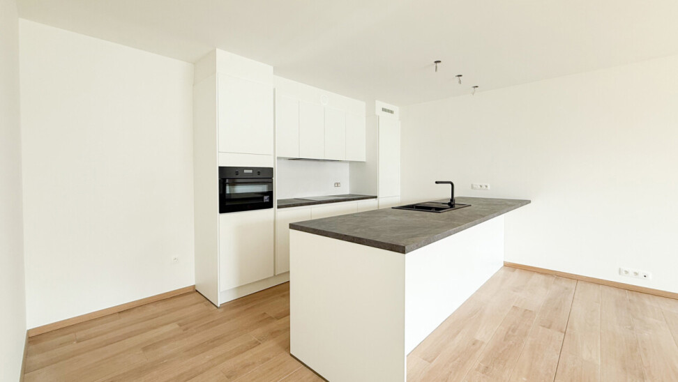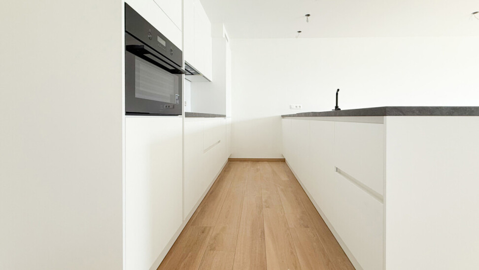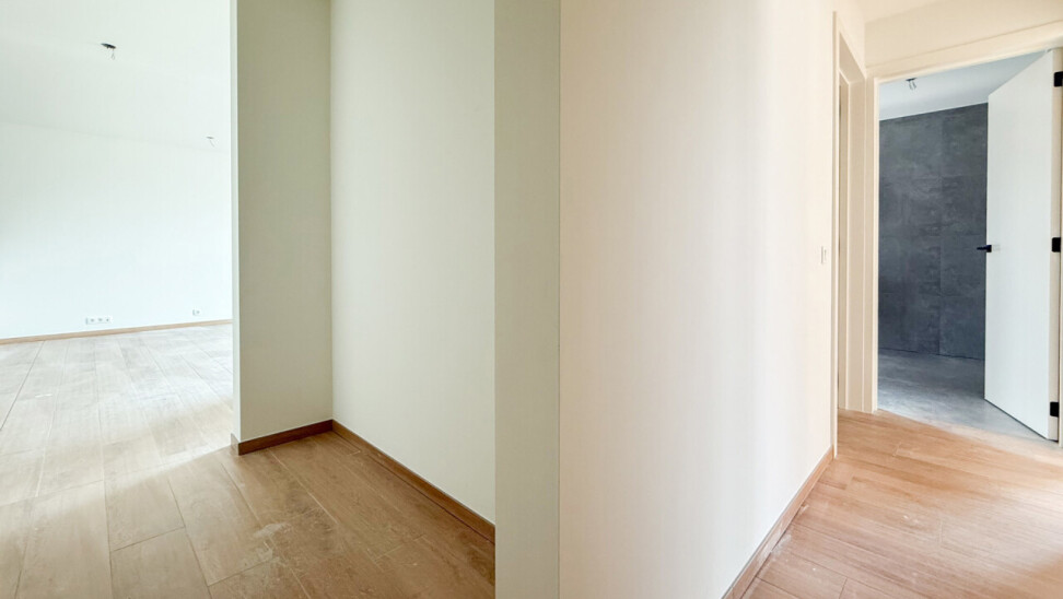 We betreden het appartement via de inkomhal die toegang geeft tot de ruime en lichtrijke leefruimte met volledig geïnstalleerde, open keuken. Verder beschikt het appartement over twee mooie slaapkamers, een gastentoilet, een praktische berging en een badkamer voorzien van inloopdouche en lavabo.