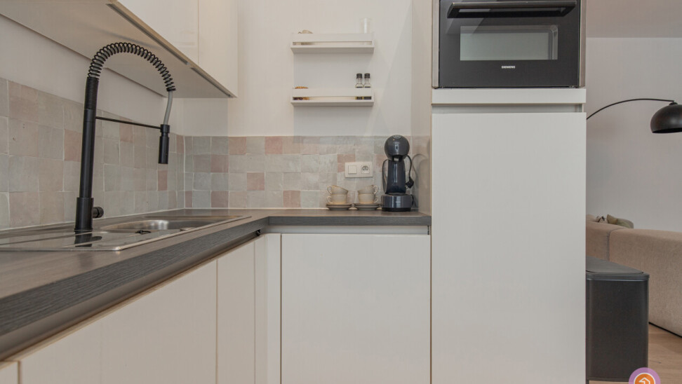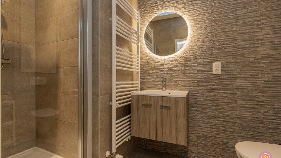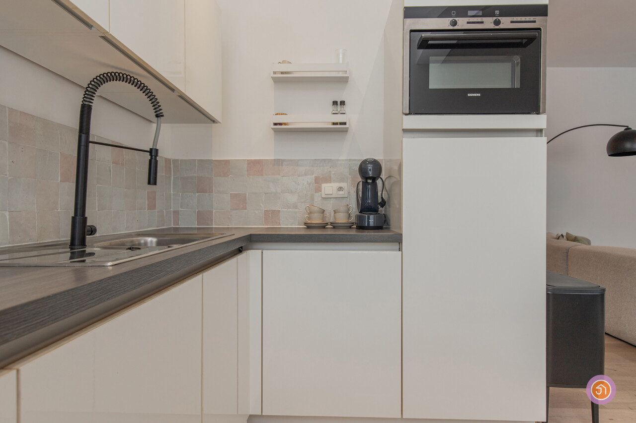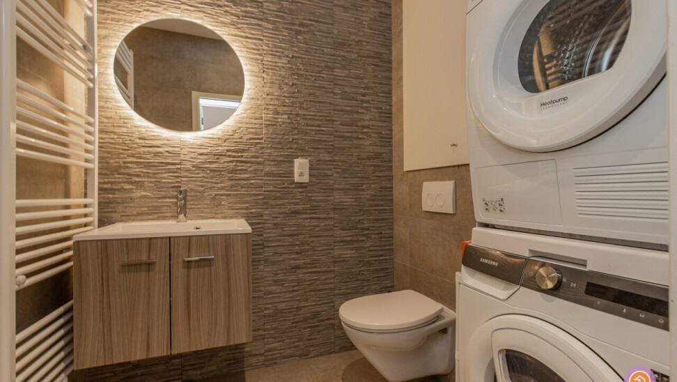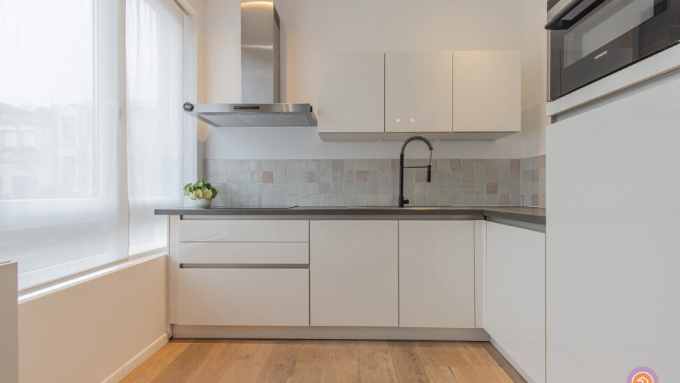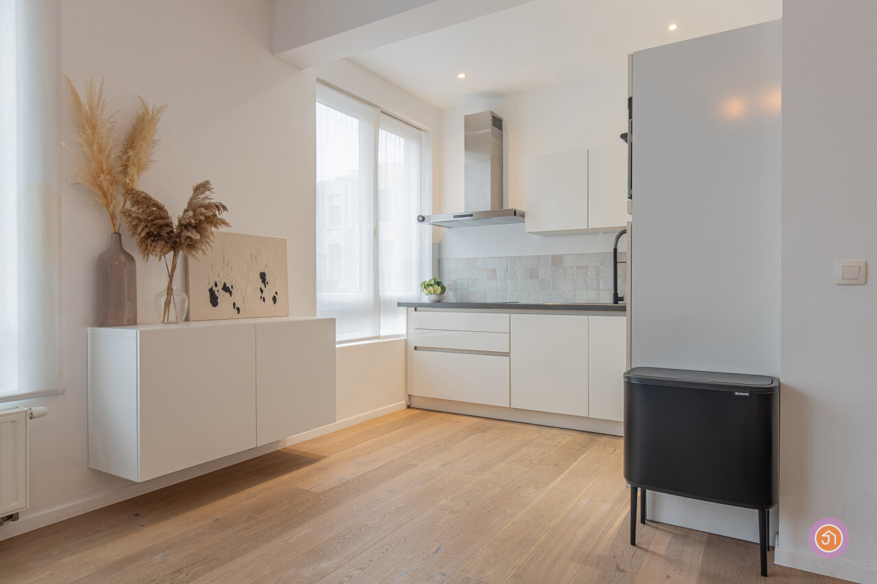 We komen binnen via een inkomhal die toegang geeft tot de gezellige en lichtrijke woonkamer met een volledig geïnstalleerde, open keuken. Verder voorziet het appartement in twee slaapkamers en een badkamer voorzien van douche, toilet, lavabo, handdoekdroger en aansluiting voor was- en droogmachine.