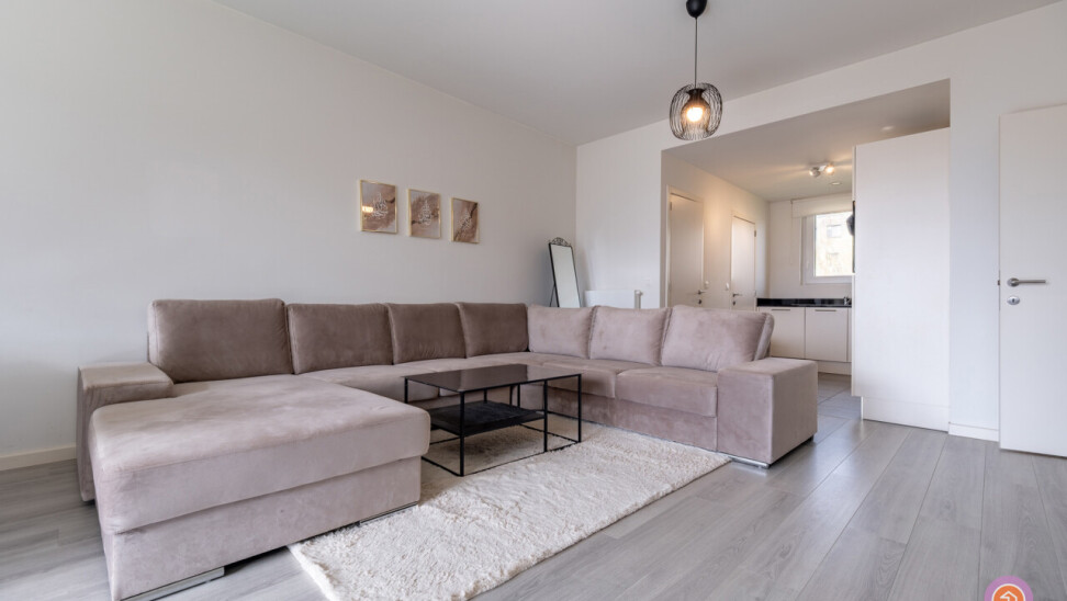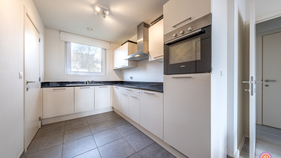 Via de lift bereiken we de derde verdieping van residentie Neerland. Wanneer we binnenkomen betreden we de inkomhal die toegang geeft tot de leefruimte met volledig geïnstalleerde, open keuken met aansluitend een praktische berging en een wasplaats.
