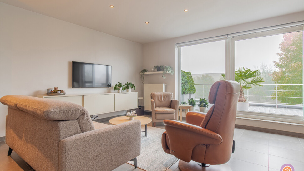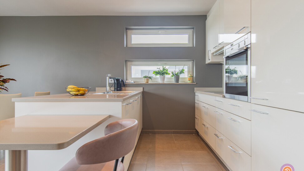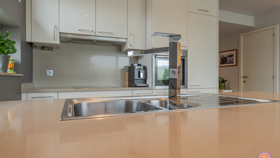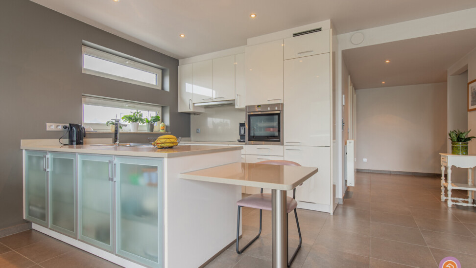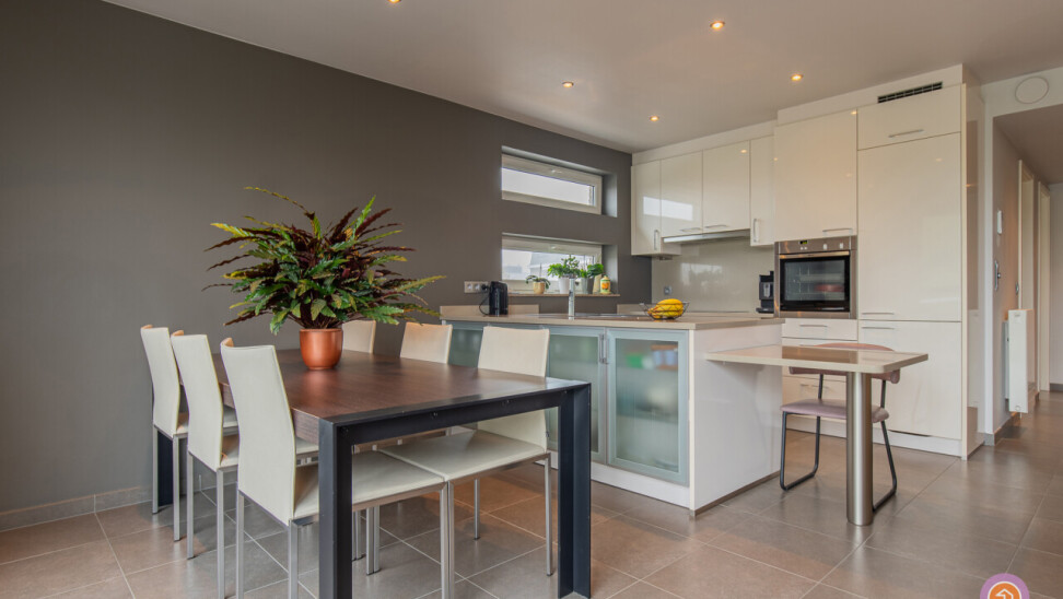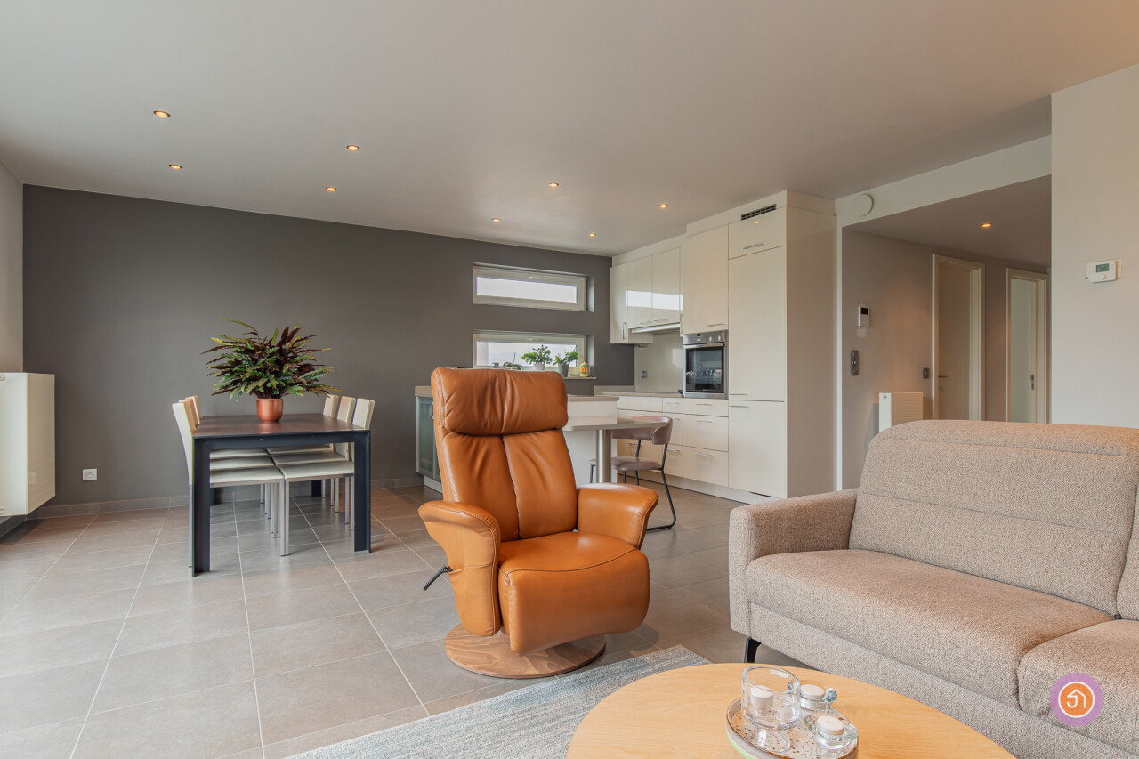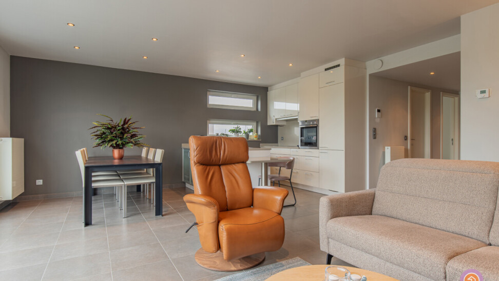 Wanneer we verder doorlopen komen we in de leefruimte terecht met een open keuken die volledig geïnstalleerd is en voorzien van alle toestellen. Verder beschikt het appartement over een gastentoilet en een ruime en praktische berging – ideaal voor extra opslag of wasmachine.