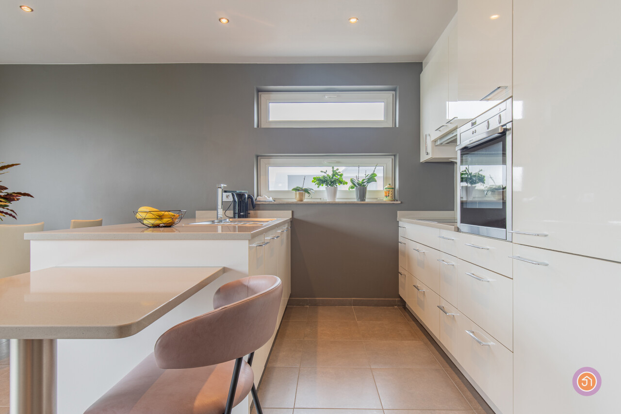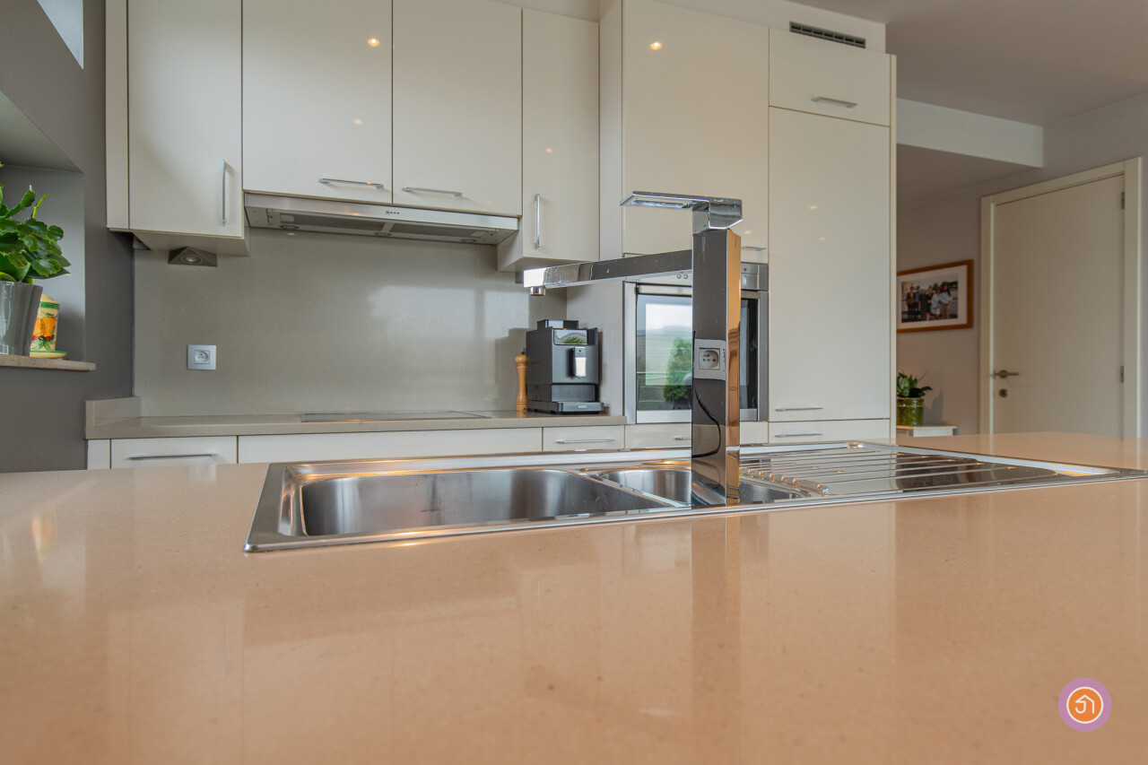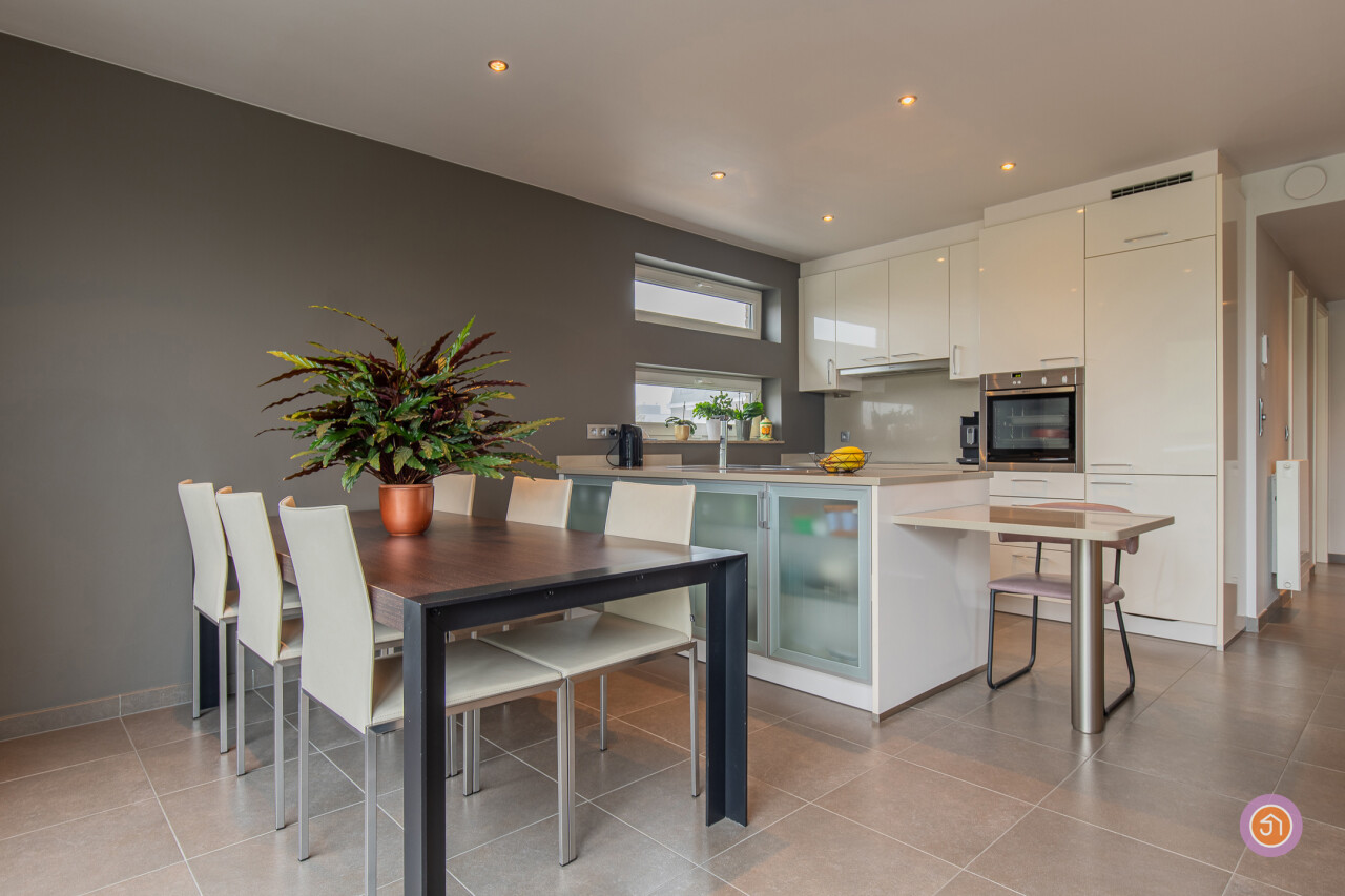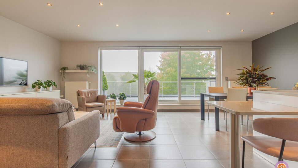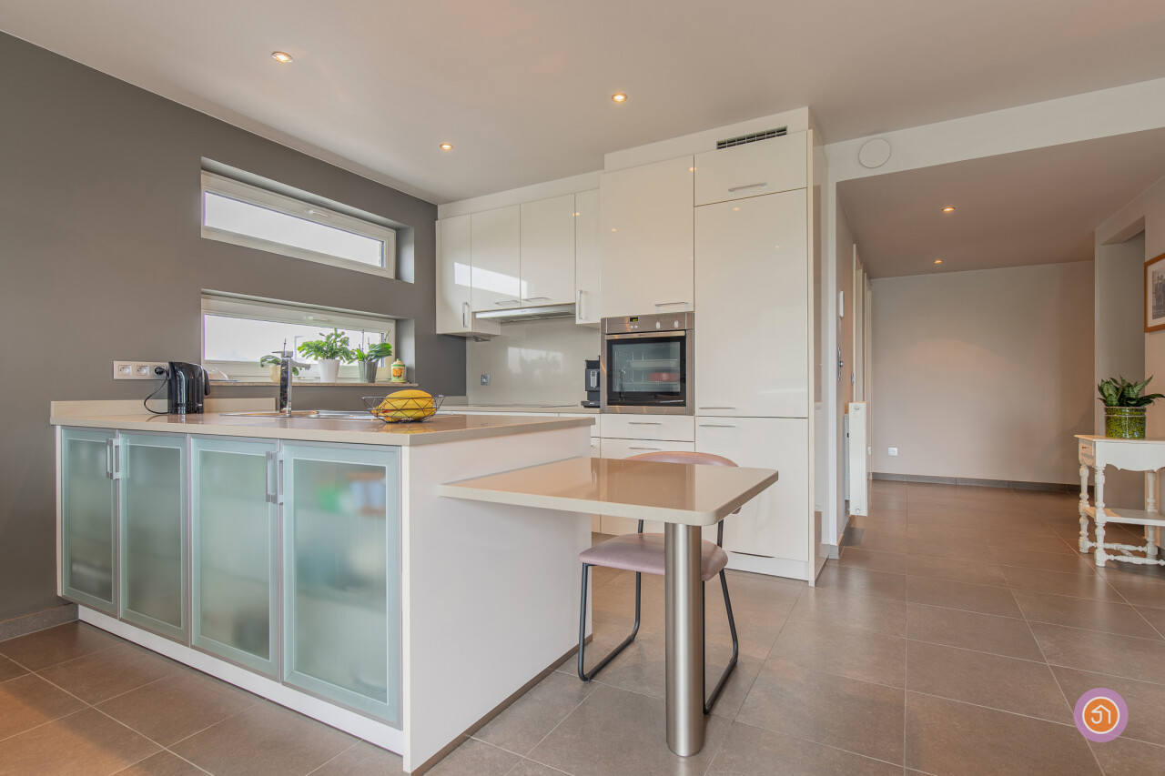 Wanneer we verder doorlopen komen we in de leefruimte terecht met een open keuken die volledig geïnstalleerd is en voorzien van alle toestellen. Verder beschikt het appartement over een gastentoilet en een ruime en praktische berging – ideaal voor extra opslag of wasmachine.