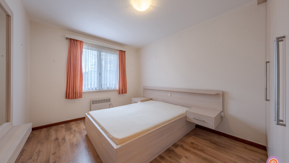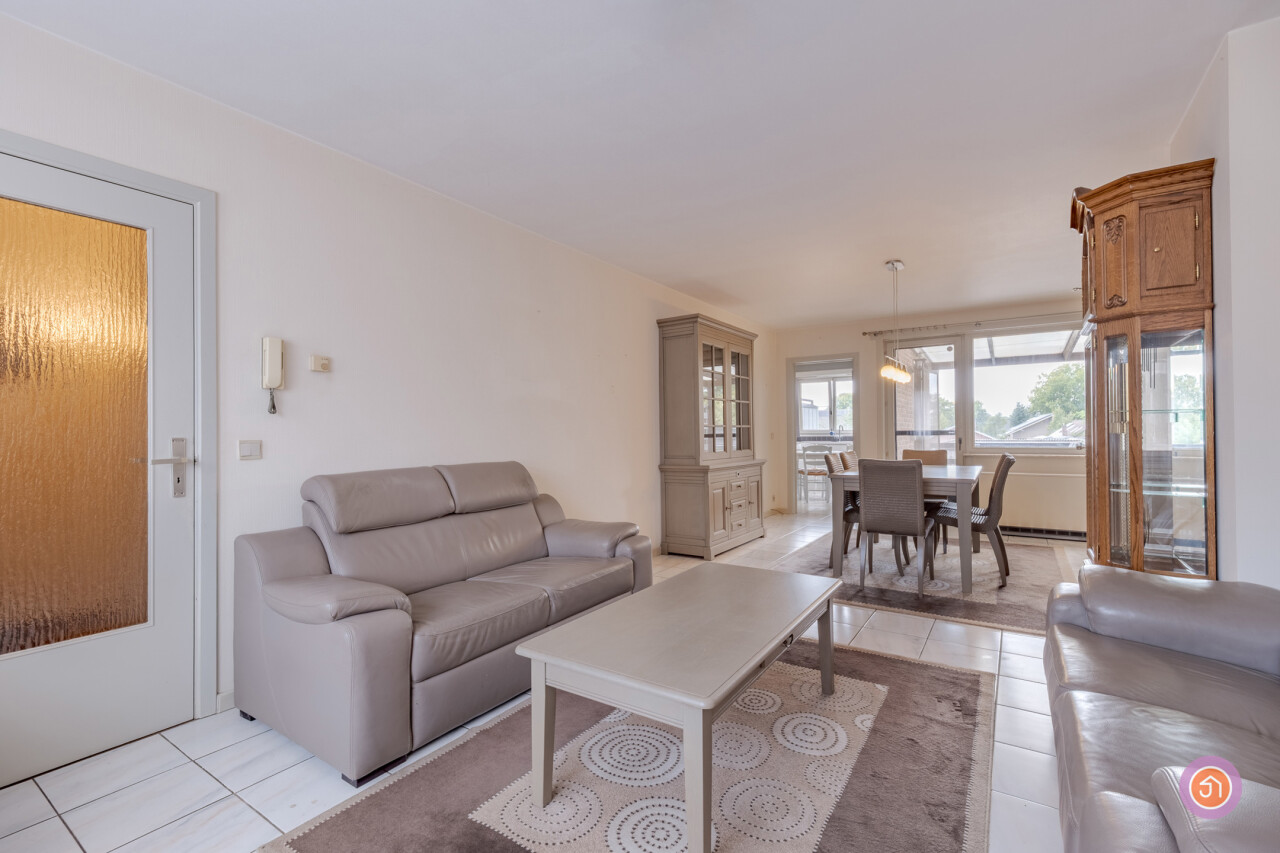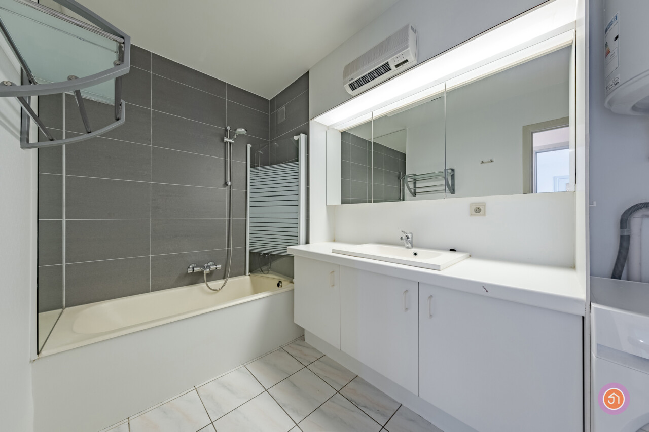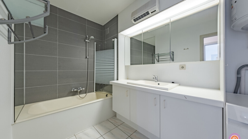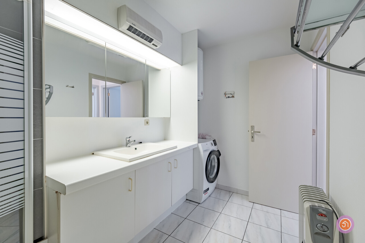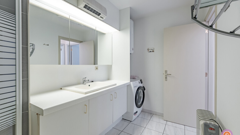 We betreden het appartement via een private inkomdeur die toegang biedt tot de inkomhal met toilet. Vervolgens betreden we de ruime leefruimte met salon en eetkamer, die ons leidt naar de keuken met aansluitend een praktische berging. Verder beschikt het appartement over twee slaapkamers, beide met ingebouwde kasten. De badkamer werd voorzien van een ligbad en lavabo met groot lavabomeubel. Tevens vinden wij er de nodige aansluitingen voor een wasmachine.