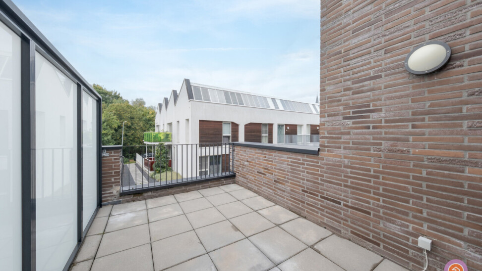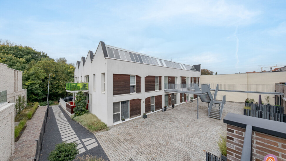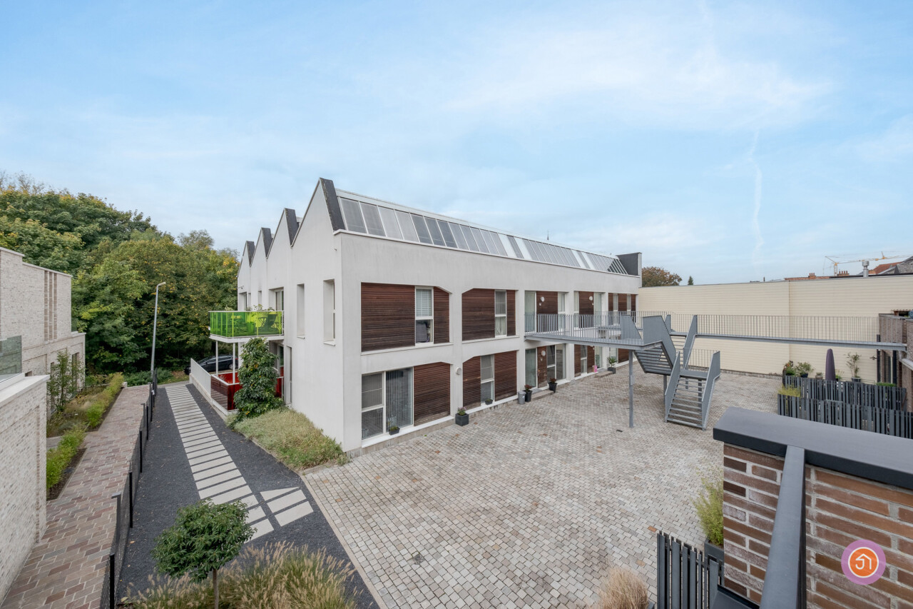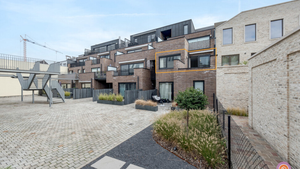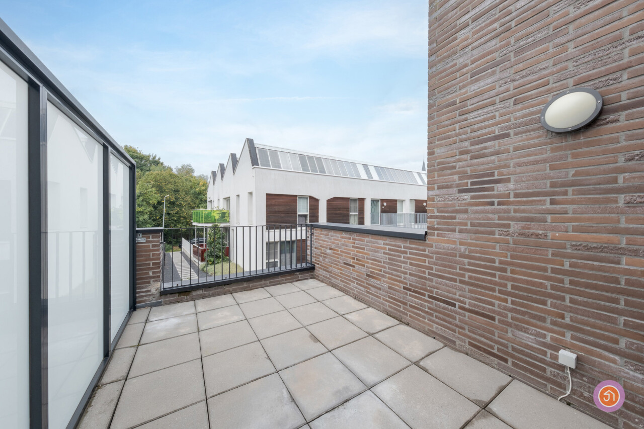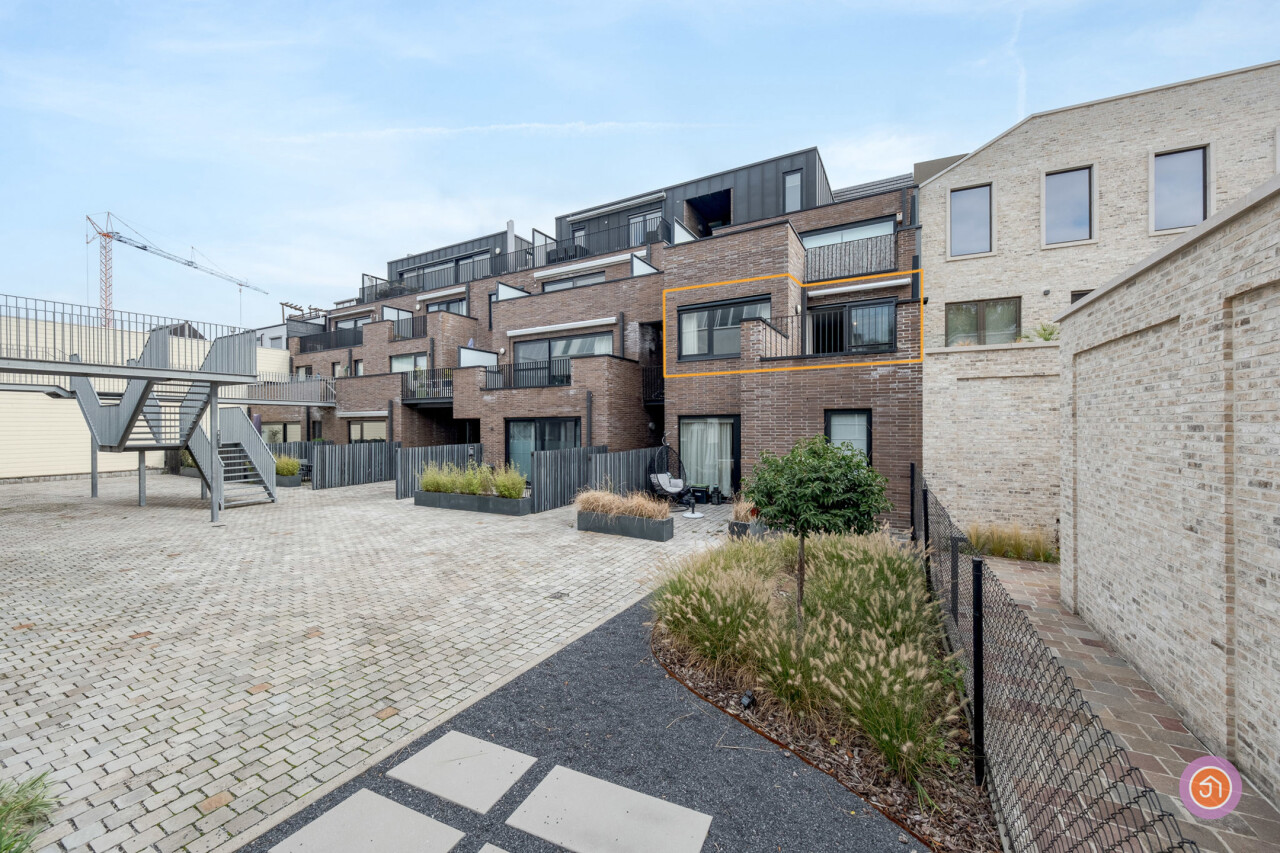 De raampartijen in de leefruimte geven toegang tot het west-georiënteerde terras van 12m² dat uitkijkt op de aangelegde binnenplaats van de residentie. Eveneens beschikt het over een prachtig uitzicht op groen.