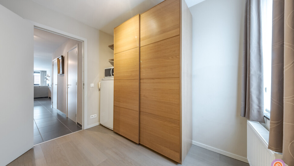Wanneer we de voordeur van het appartement openen, komen we in de inkomhal die toegang geeft tot de leefruimte van het appartement.