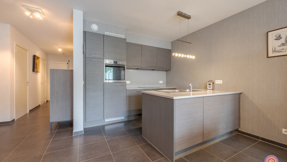 Aansluitend aan de leefruimte vinden we de volledig uitgeruste keuken terug. Wanneer we de nachthal betreden, vinden we aan onze linkerkant een gastentoilet. De hal geeft eveneens toegang tot de twee slaapkamers, de badkamer met douche en een praktische bergruimte.