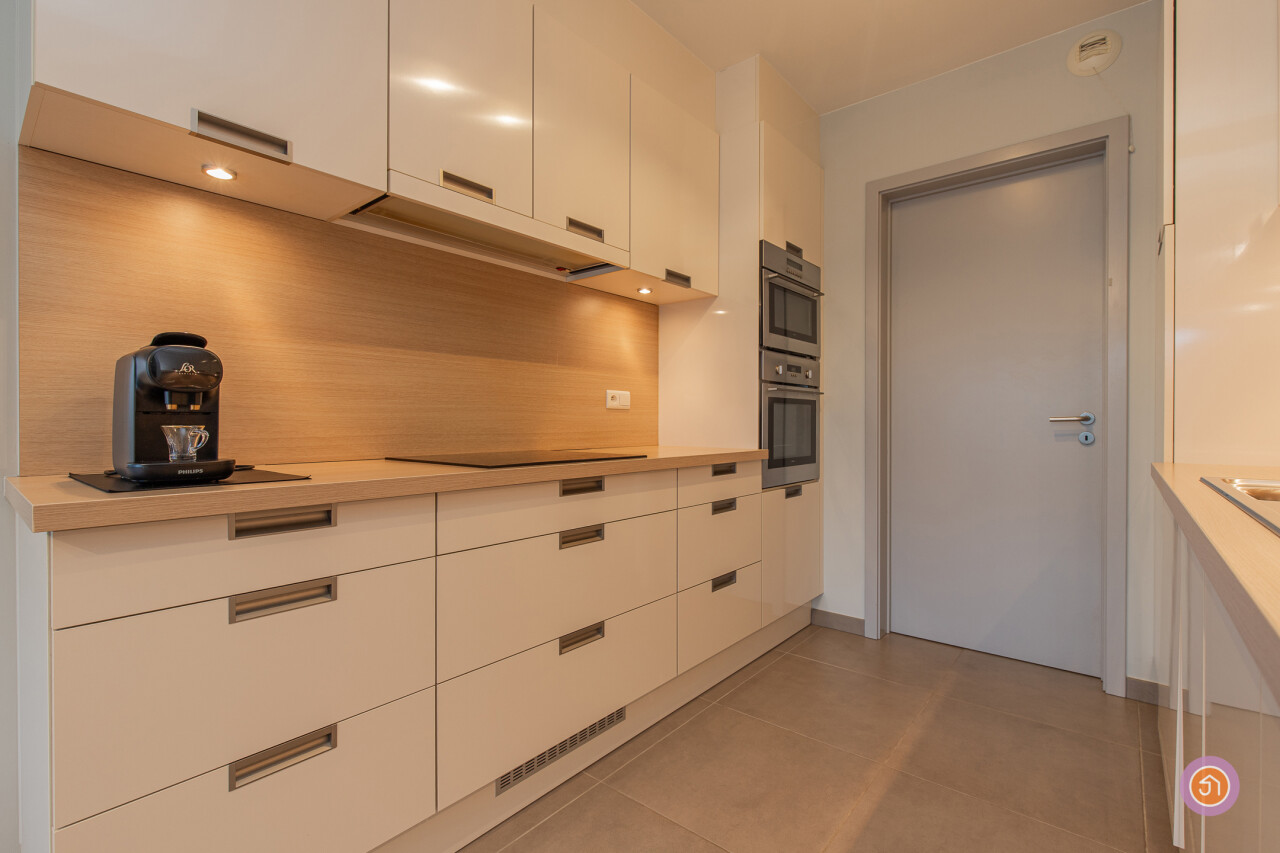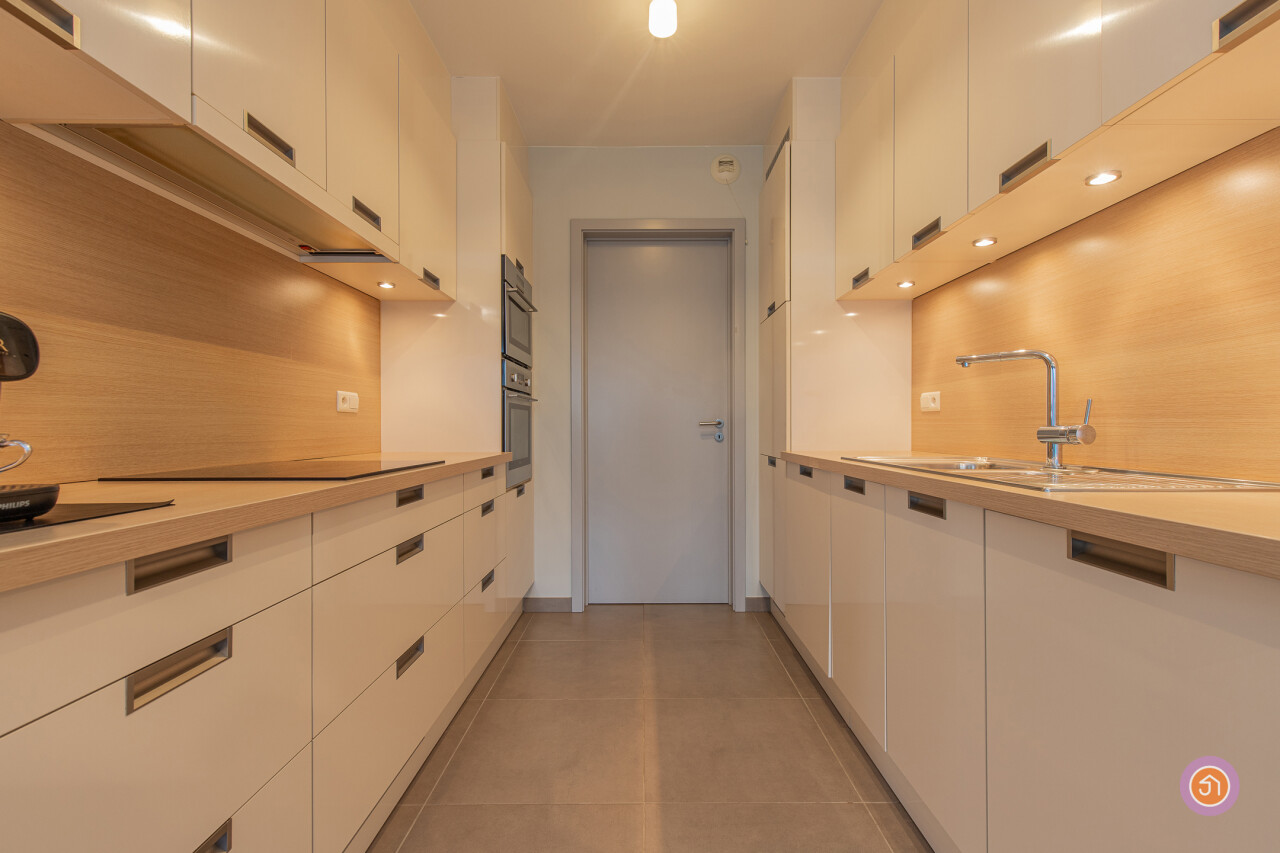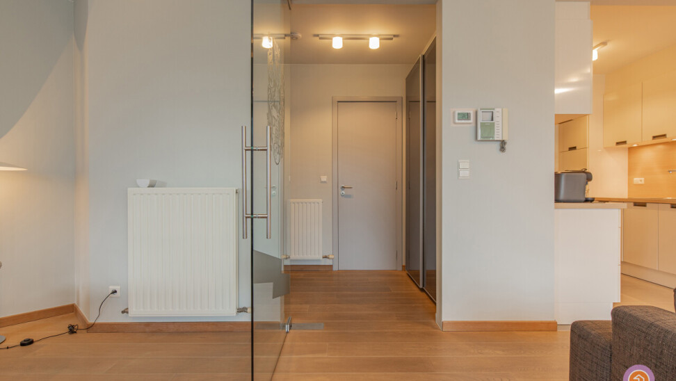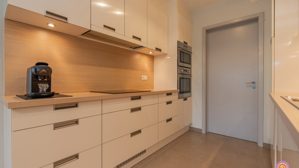 Via de inkomhal met ingemaakte kasten, bereiken we enerzijds het gastentoilet en anderzijds de ruime leefruimte met aansluitend een volledig geïnstalleerde keuken. De keuken geeft toegang tot een praktische berging.
