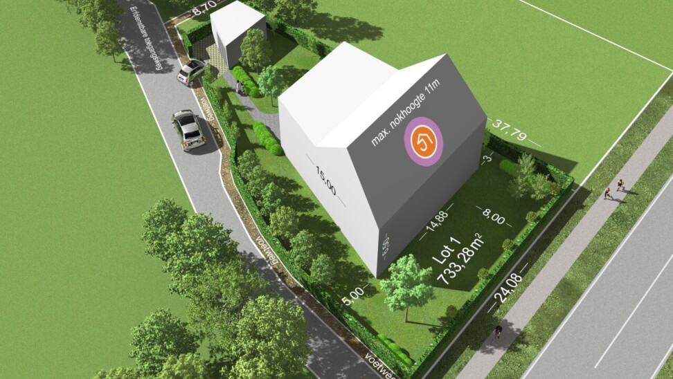 Je kan hier een woning op bouwen van 14,88 meter breed, 15 meter diep en met een nokhoogte van 11m hoog.