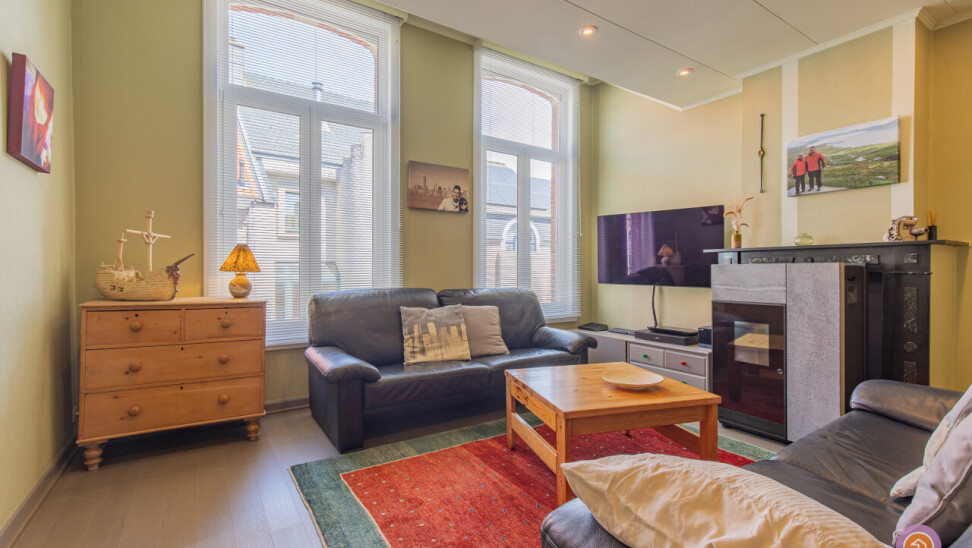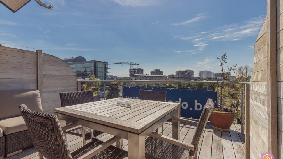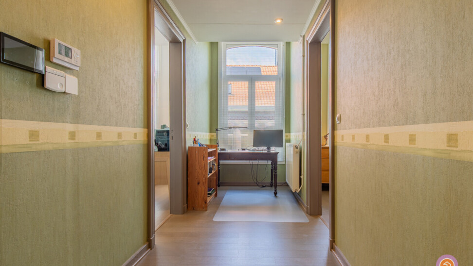 Op de eerste verdieping betreden we de woonst. Deze is opgedeeld in een woonkamer, keuken, bureaukamer, badkamer en een ruime slaapkamer met toegang tot een terras.