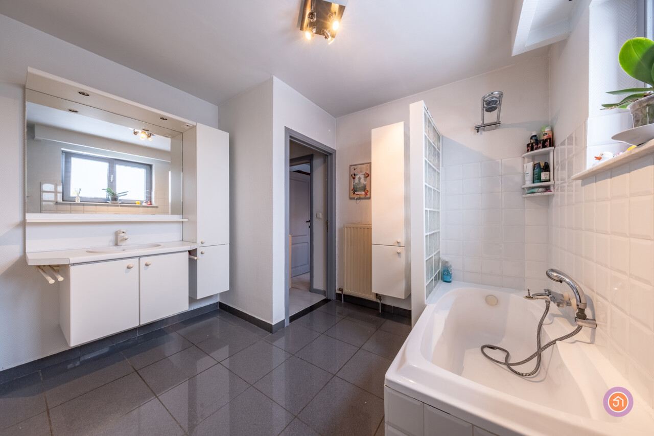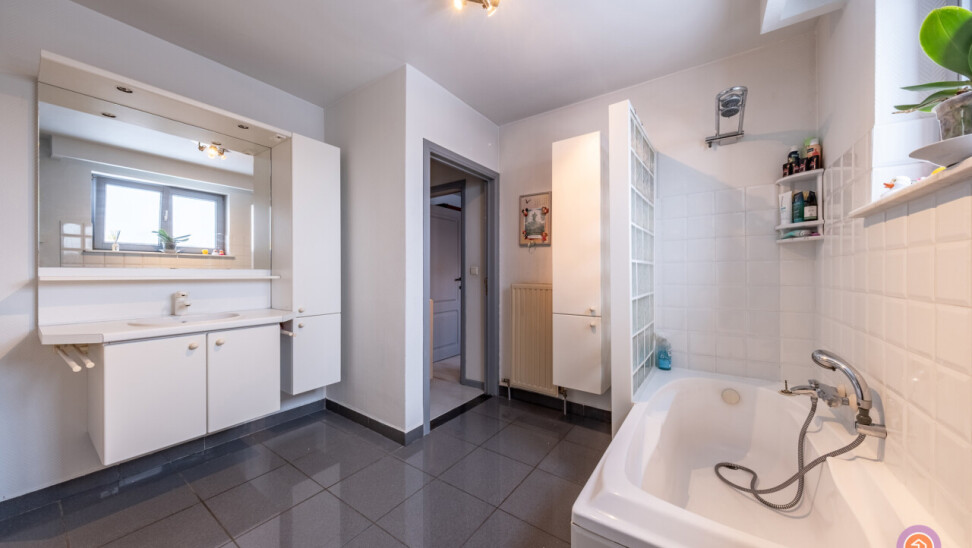 Wanneer we verder doorlopen, treffen we de nachthal die toegang verleent tot drie volwaardige slaapkamers en een badkamer voorzien van douche in bad, lavabo en een toilet.