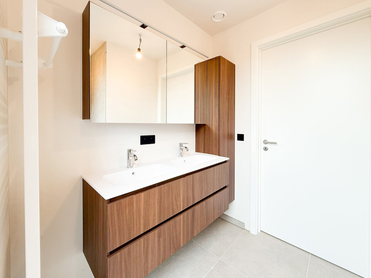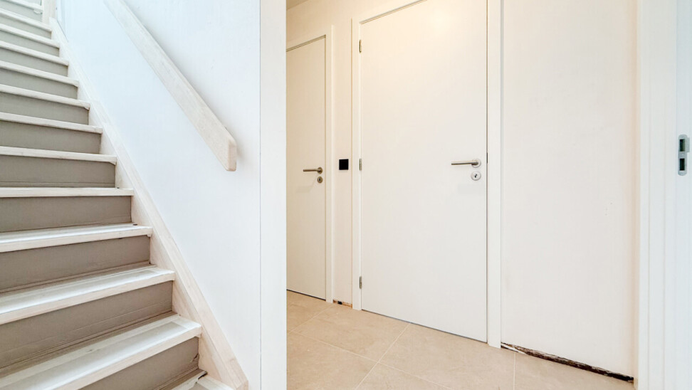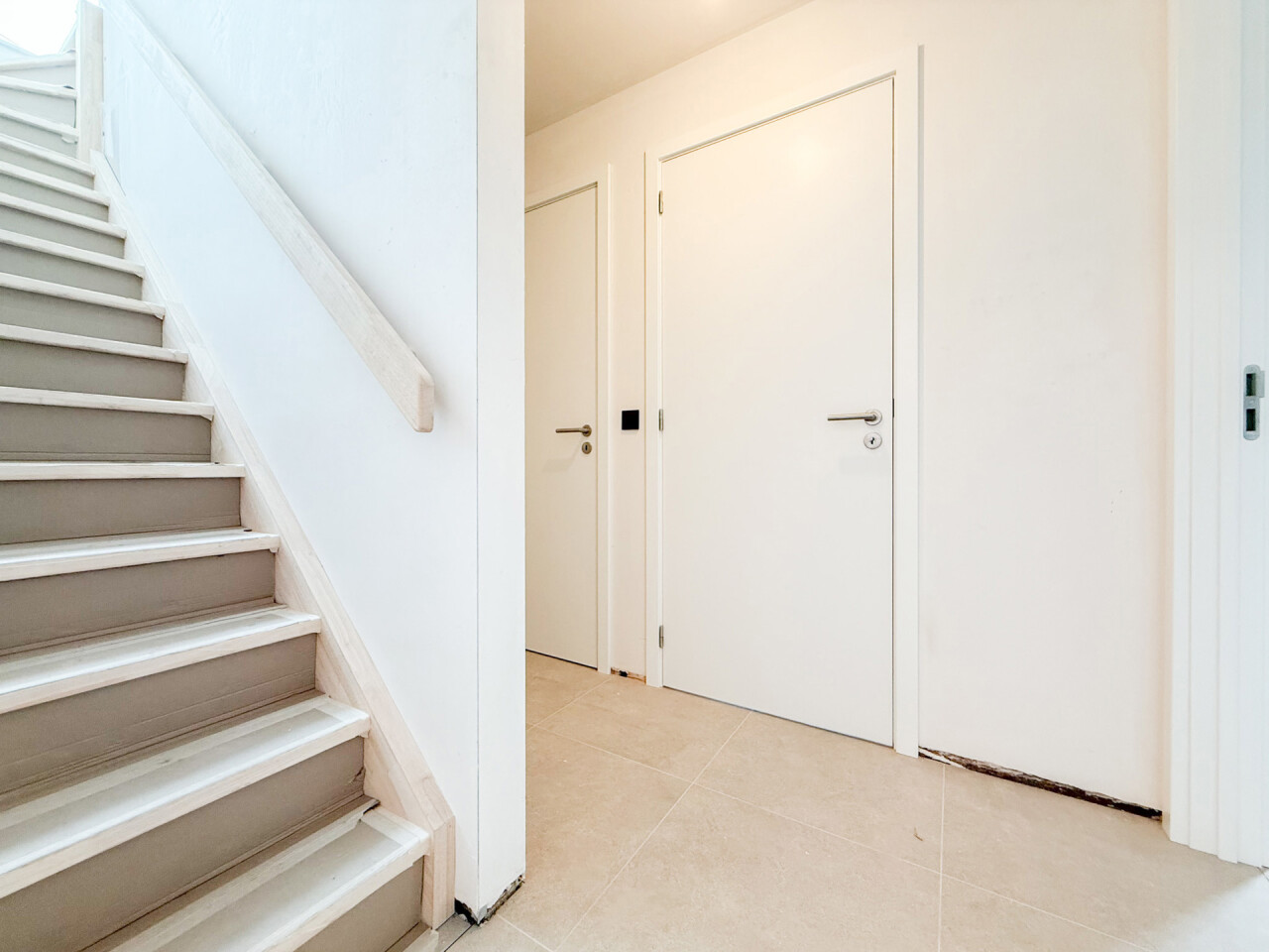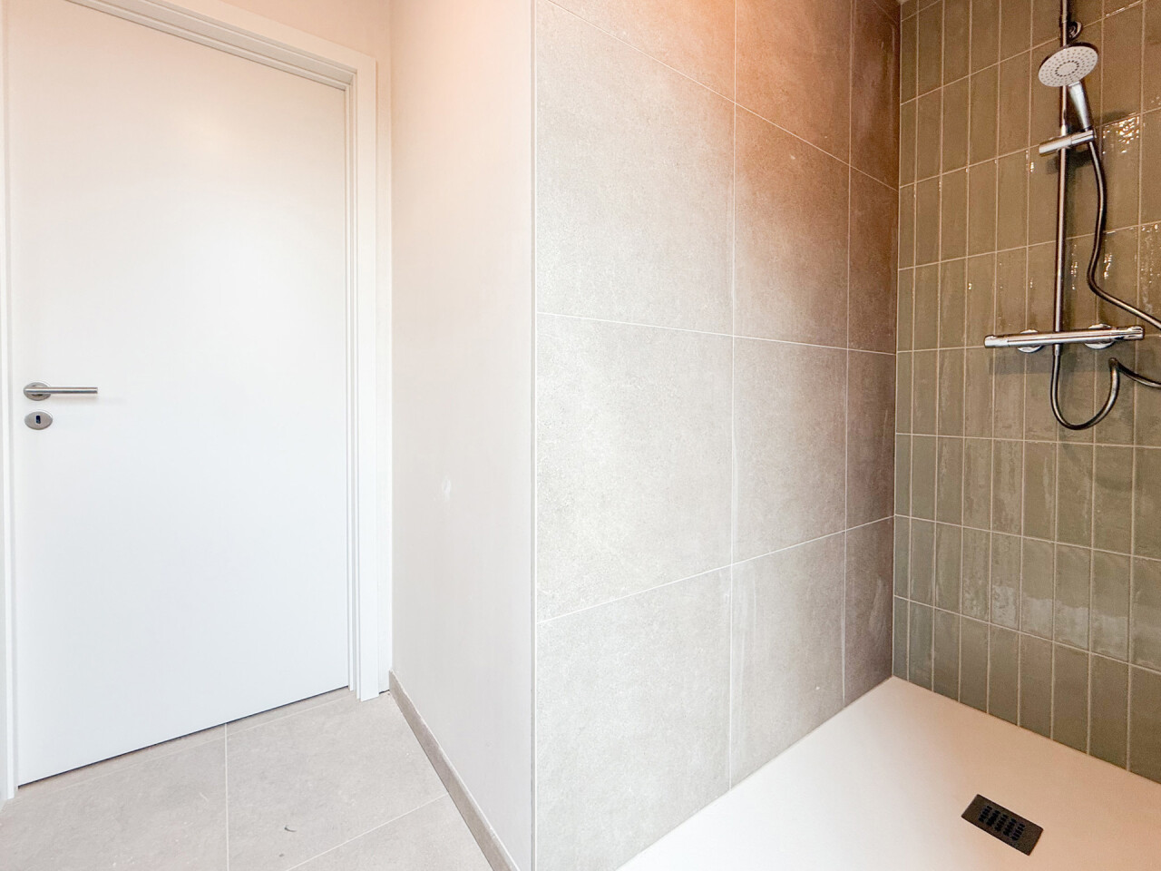 We betreden het appartement via de inkomhal die toegang geeft tot de twee slaapkamers en een moderne badkamer voorzien van inloopdouche en gastentoilet. Via de trap bereiken we de leefruimte met open keuken die volledig geïnstalleerd is. Het appartement beschikt verder over een praktische berging.