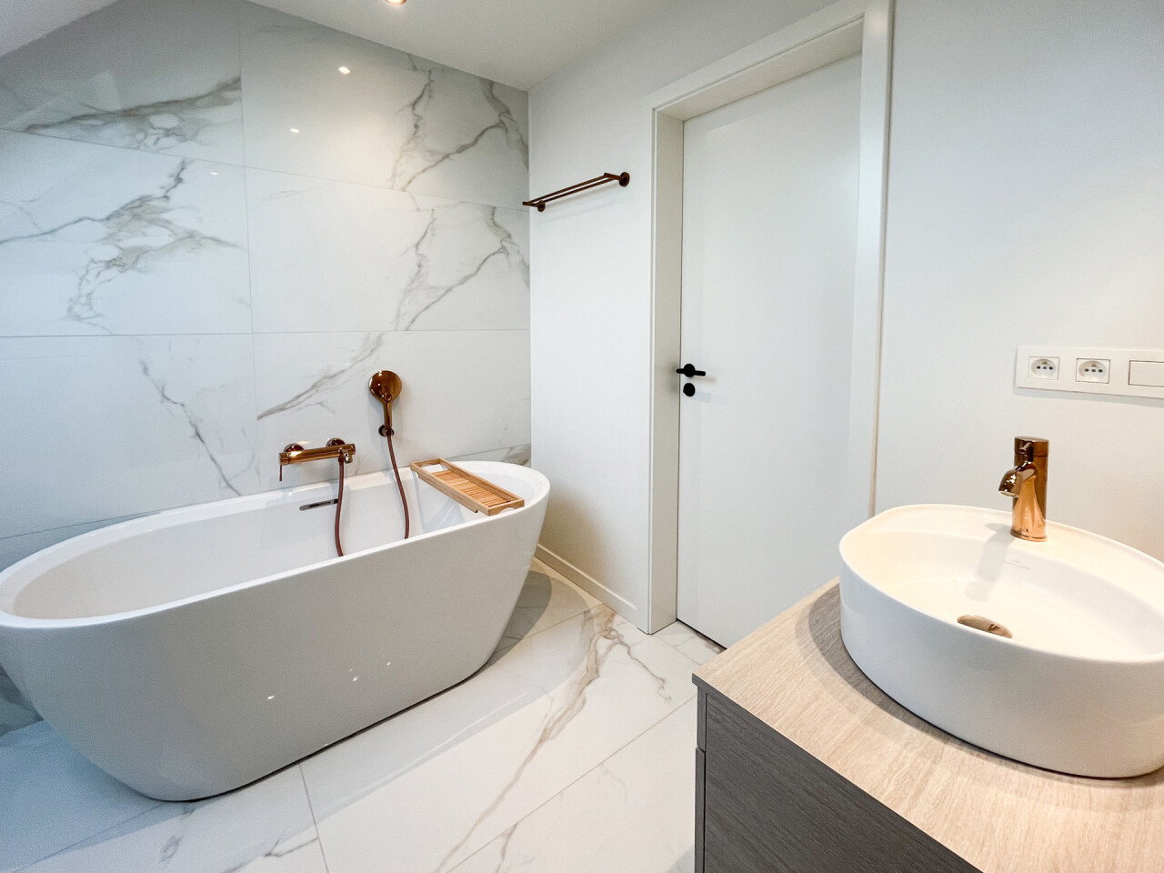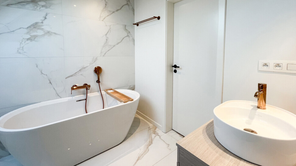 De badkamer is voorzien van vrijstaand ligbad.
