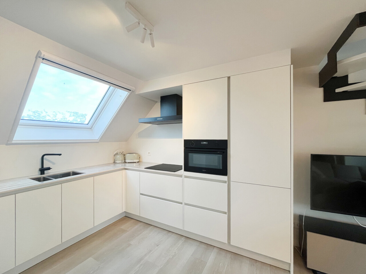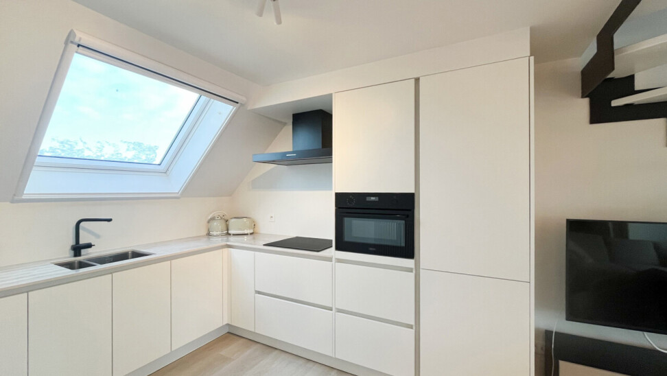 Wanneer we het appartement binnenkomen, betreden we de lichtrijke leefruimte met open keuken. De keuken is volledig ingericht met hoogstaande, kwalitatieve toestellen.