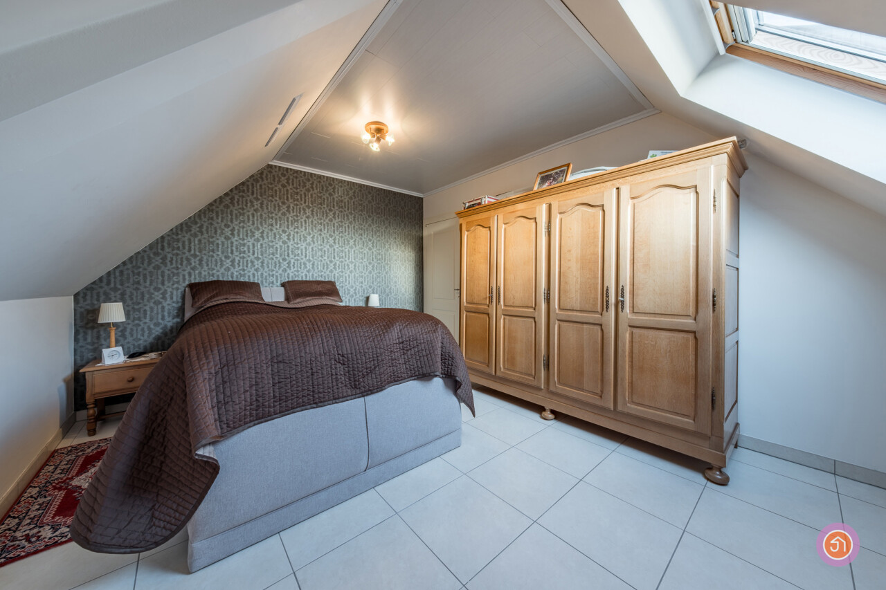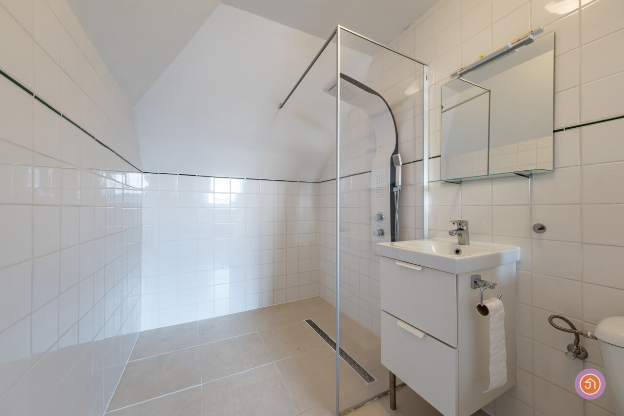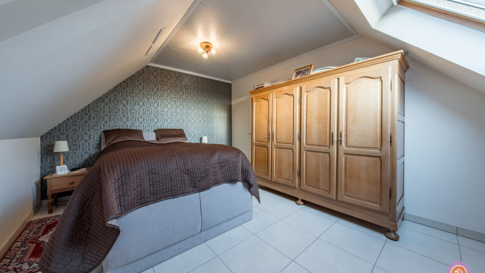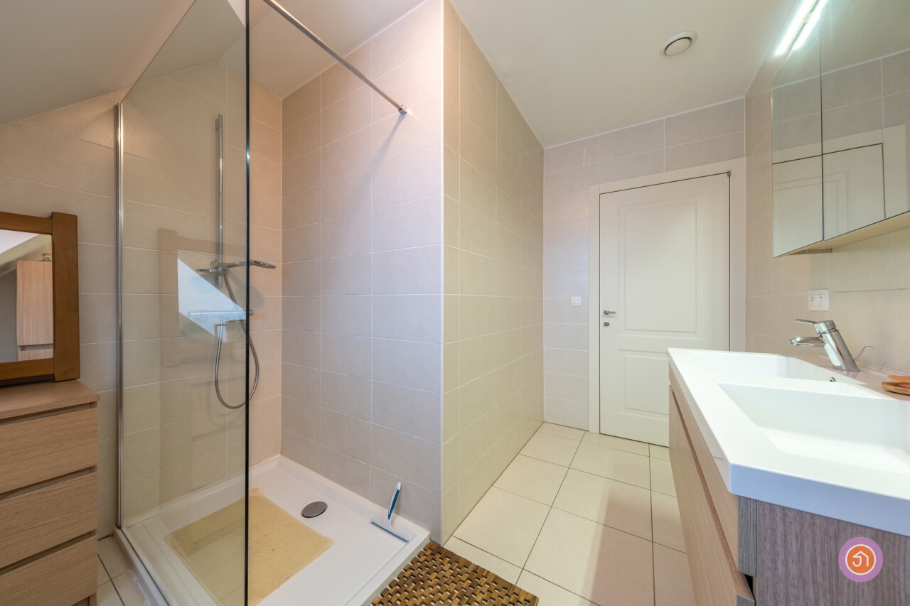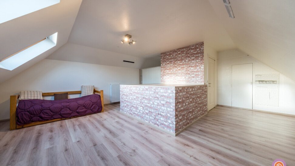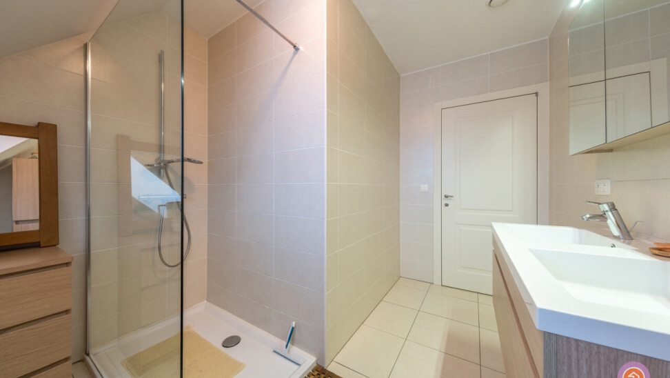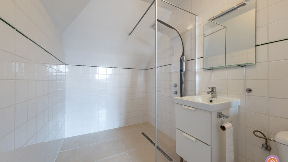 In de leefruimte nemen we de trap naar boven om zo uit te komen bij de derde slaapkamer met ensuite ingerichte badkamer met lavabo, toilet en inloopdouche.