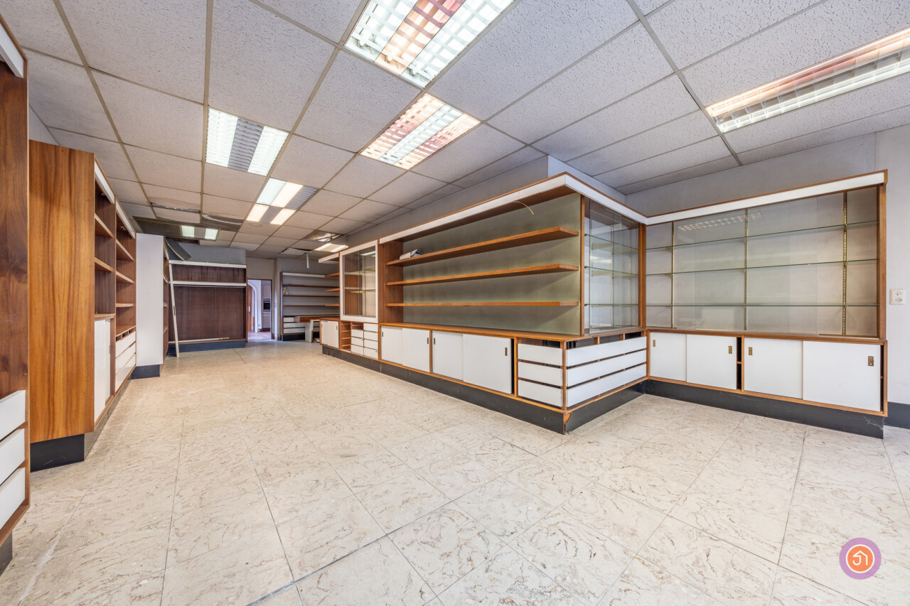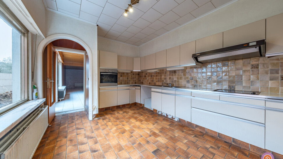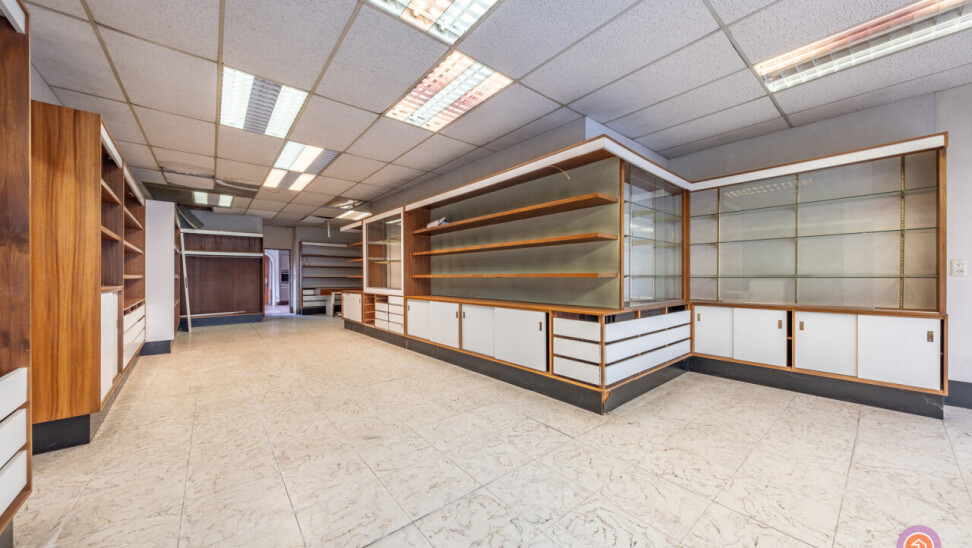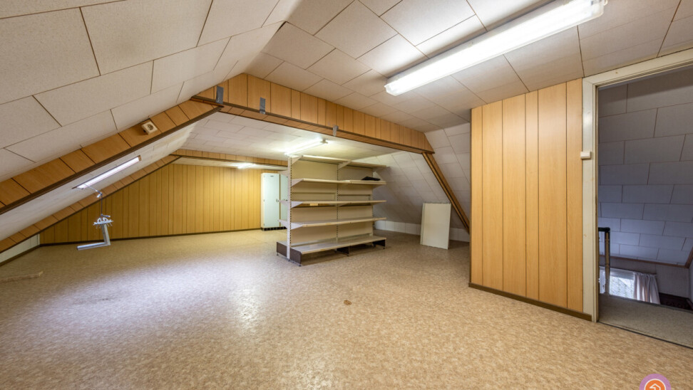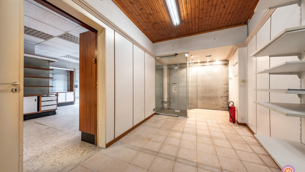 We komen binnen via de hal die toegang geeft tot een aangename en lichtrijke handelsruimte. Aansluitend vinden we de ruime keuken met daarachter nog een extra ruimte. Verder vinden we op het gelijkvloers nog een toilet en een praktische extra ruimte (linkerzijde) die eventueel kan ingedeeld worden als inpandige garage.