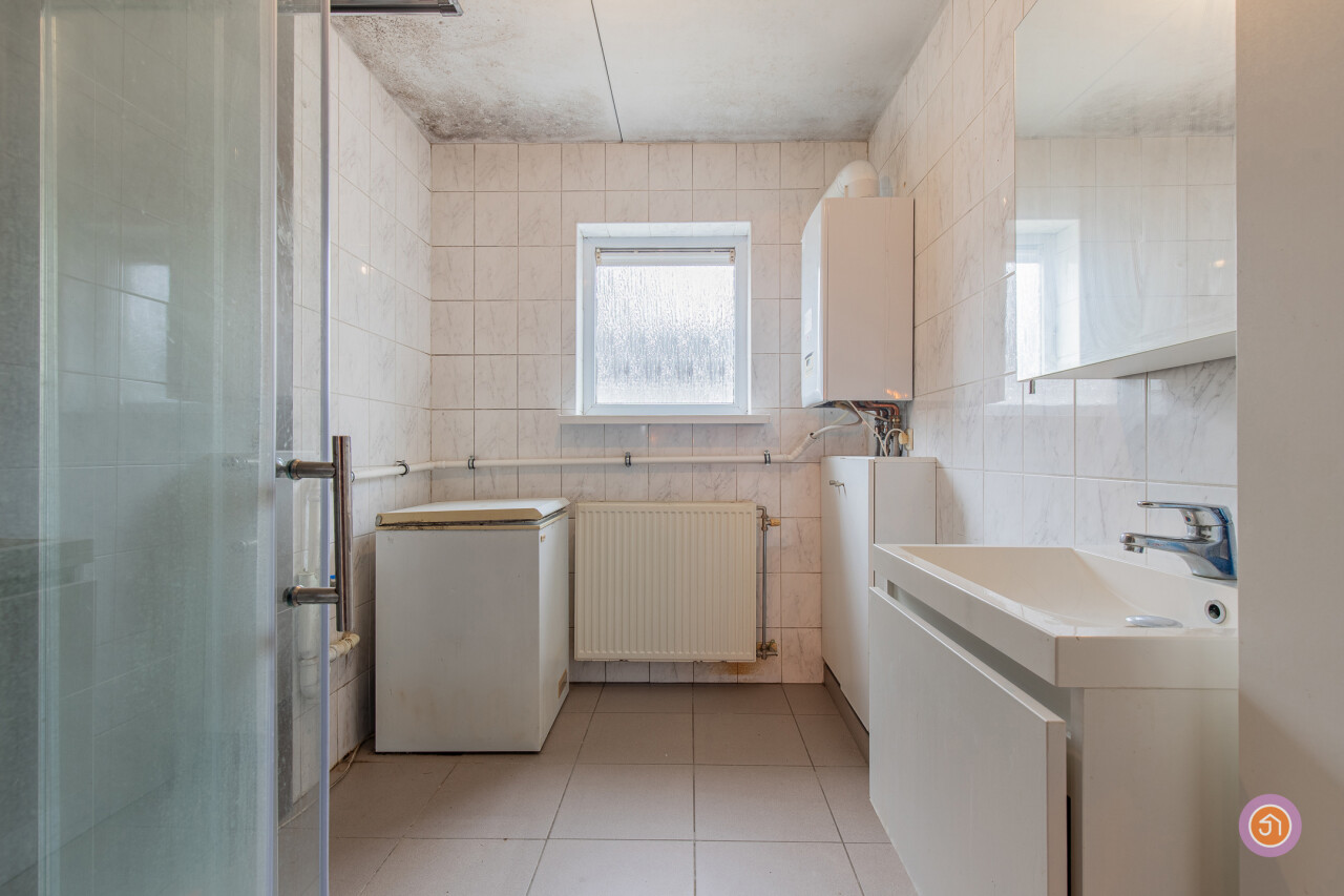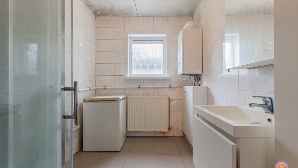 Bij binnenkomst betreden we de inkomhal die toegang geeft tot de geïnstalleerde badkamer voorzien van een douche en enkele lavabo.