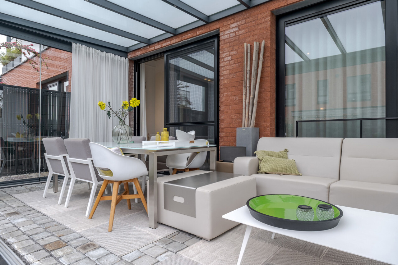 De raampartijen geven toegang tot de veranda met zicht op de zonnige tuin van maar liefst 150 m².