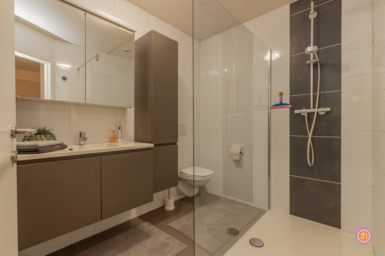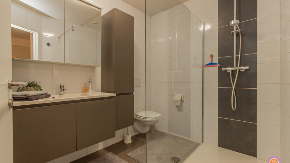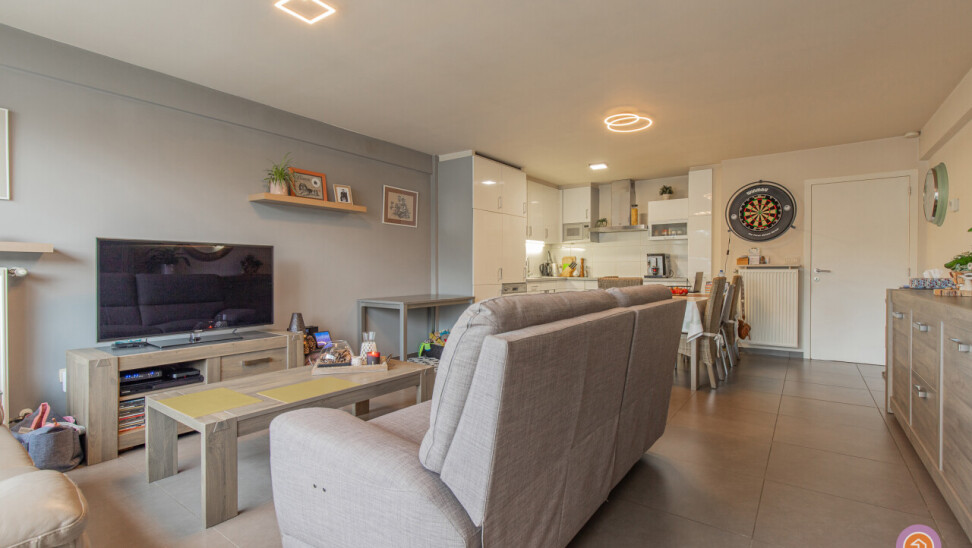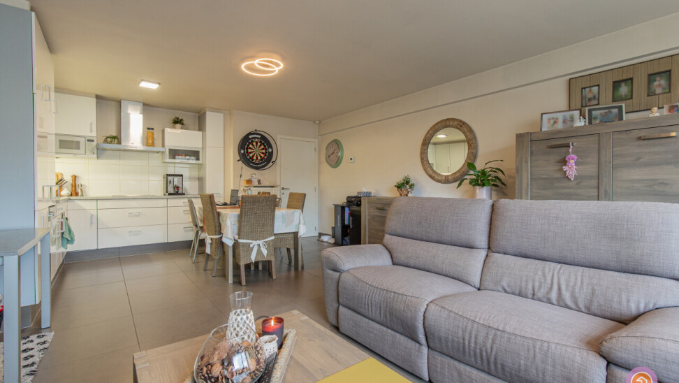 Dit appartement beschikt over een inkomhal met ingemaakte kasten, een ruime en lichtrijke leefruimte, met volledig geïnstalleerde, open keuken. Verder beschikt het appartement over twee slaapkamers, een badkamer met inloopdouche, lavabo en toilet en een gastentoilet.