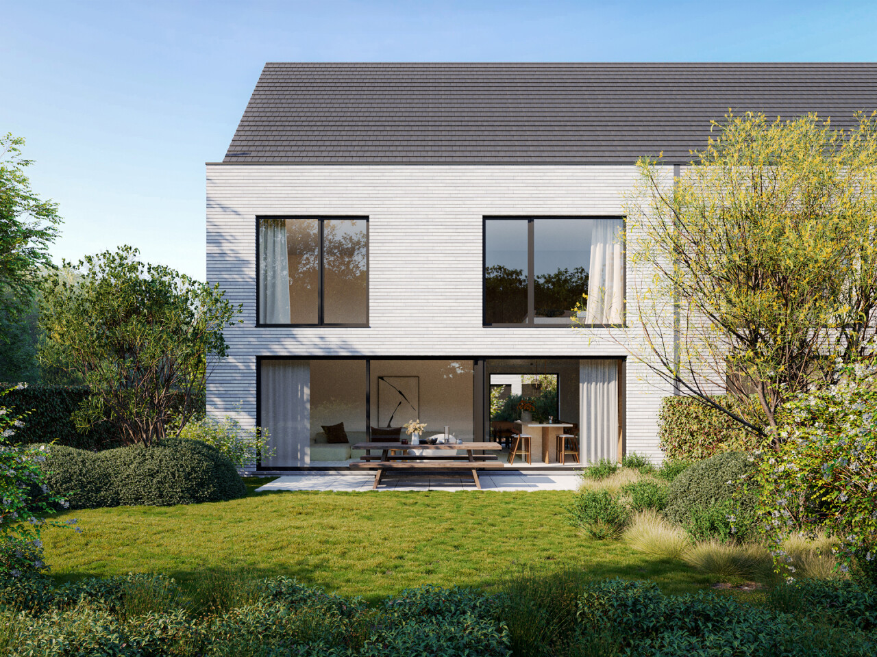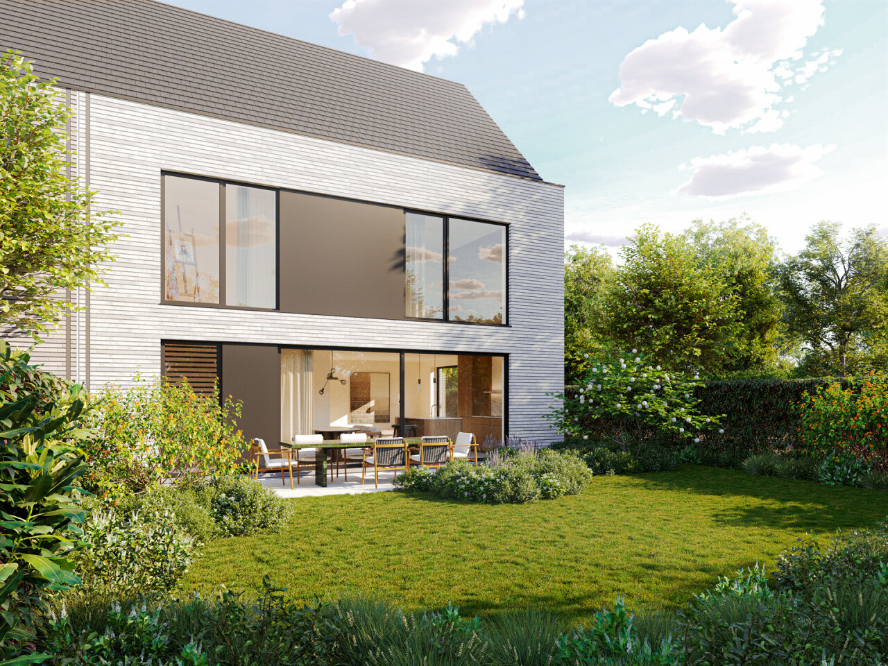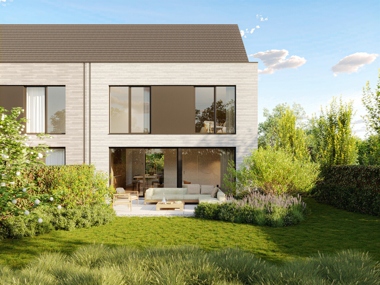 De woningen worden gekenmerkt door een elegante, hedendaagse architectuur waarin strakke lijnen en een klassieke dakvorm perfect in balans zijn. De lichte gevelsteen, gecombineerd met verfijnde accenten, zorgt voor een rustige en luxueuze uitstraling. Grote raampartijen laten overvloedig daglicht binnen en versterken het gevoel van ruimte en comfort.
