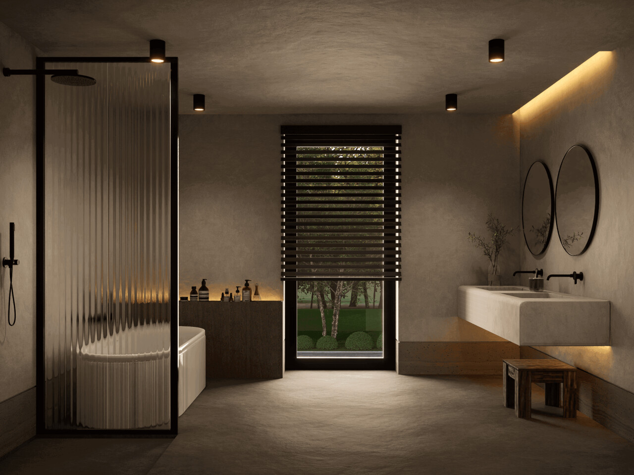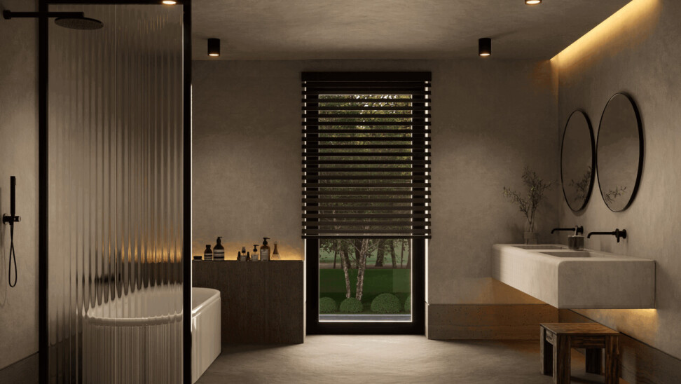 Op het gelijkvloers vinden we een uitnodigende inkomhal met vestiaire en apart toilet, een open leefruimte met keuken, eetplaats en zitruimte, aangevuld met een praktische berging. Dankzij de grote raampartijen geniet je hier van overvloedig daglicht.