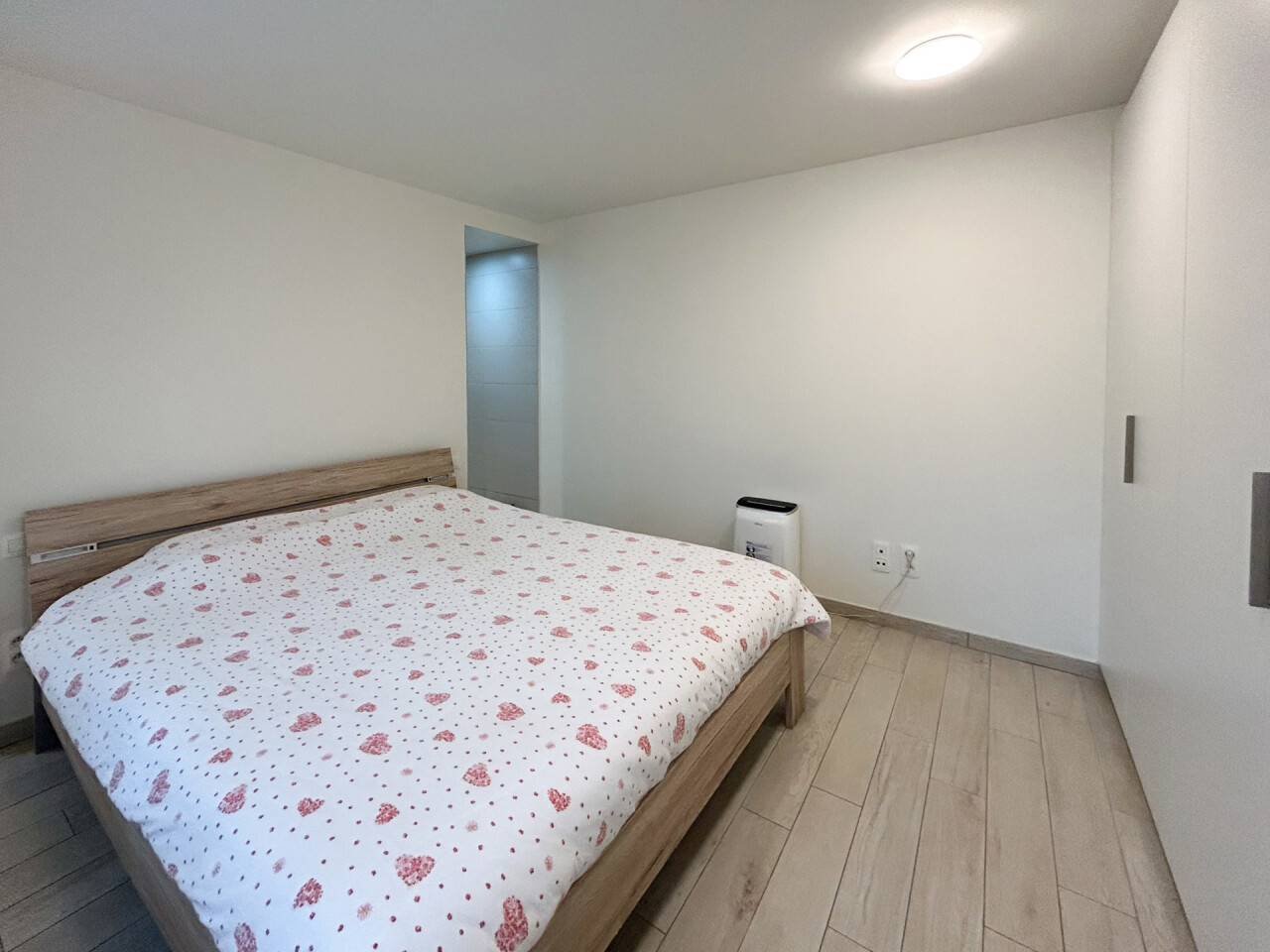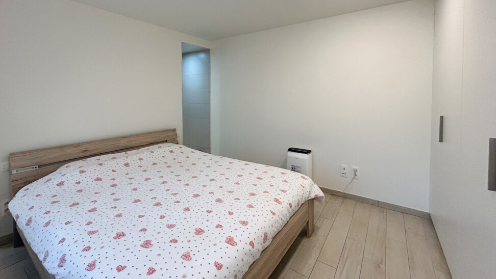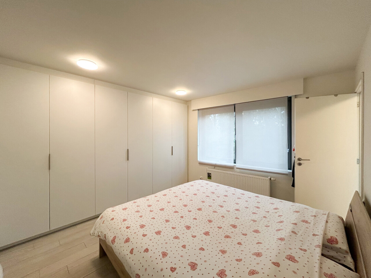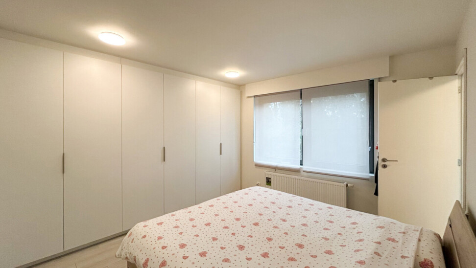 We komen binnen via de inkomhal die toegang geeft tot een praktische berging, toilet en bureauruimte. Op het gelijkvloers vinden we ook de ruime slaapkamer terug, voorzien van ingemaakte kasten. Aansluitend vinden we de badkamer terug, voorzien van een inloopdouche en lavabo.