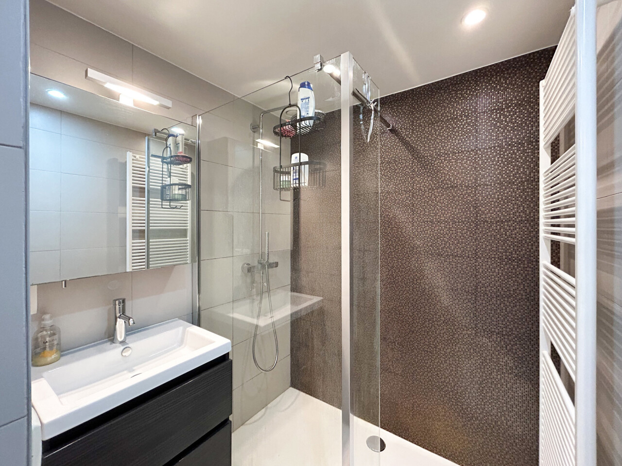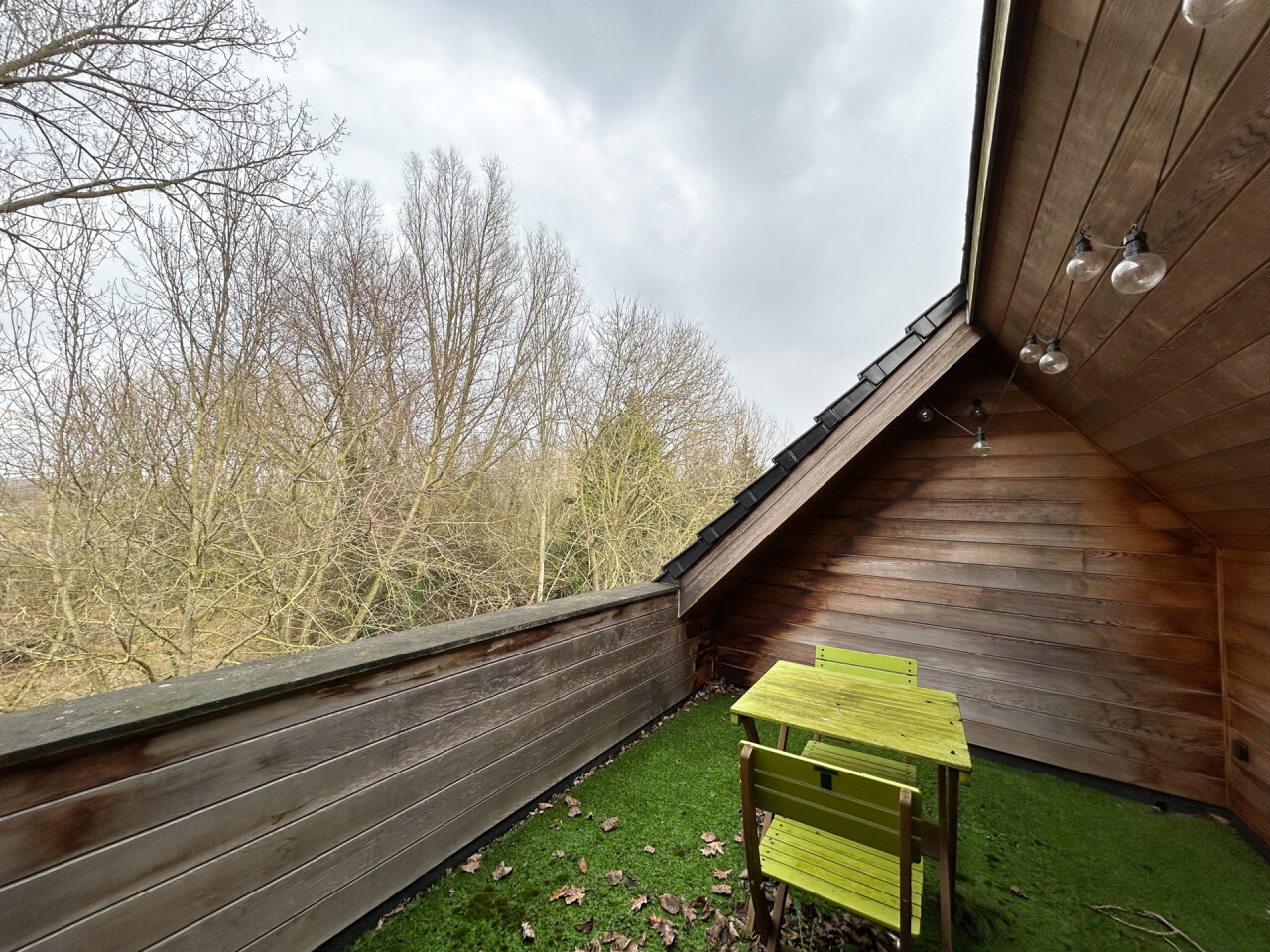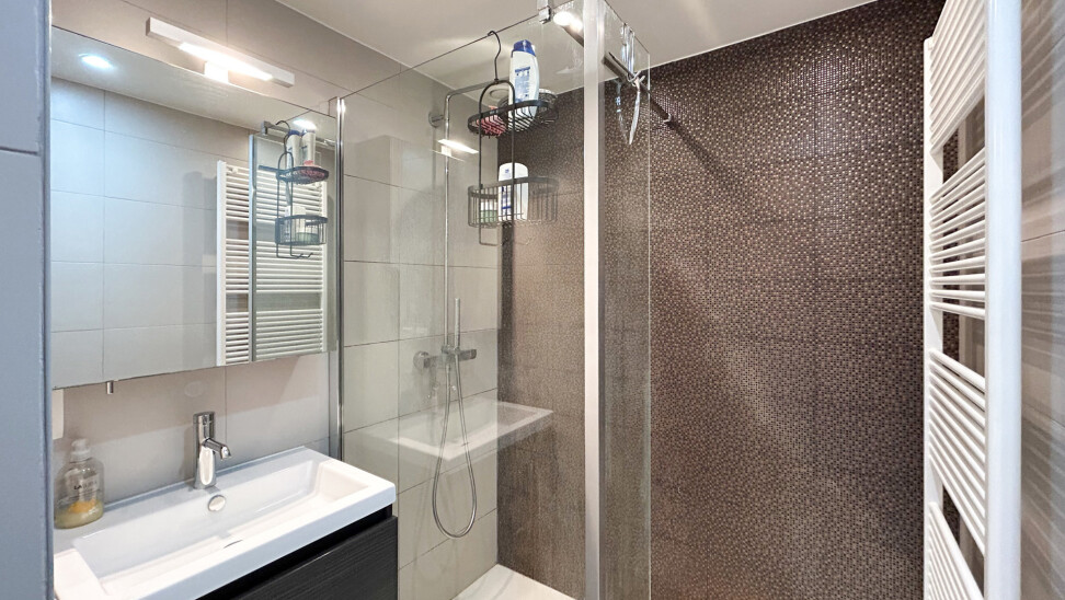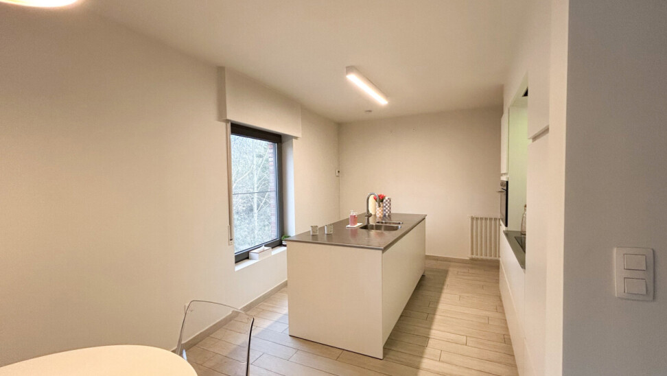 We komen binnen via de inkomhal die toegang geeft tot een praktische berging, toilet en bureauruimte. Op het gelijkvloers vinden we ook de ruime slaapkamer terug, voorzien van ingemaakte kasten. Aansluitend vinden we de badkamer terug, voorzien van een inloopdouche en lavabo.
