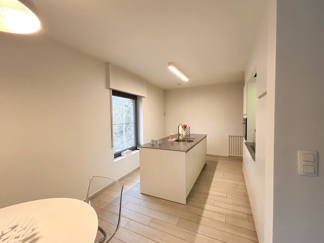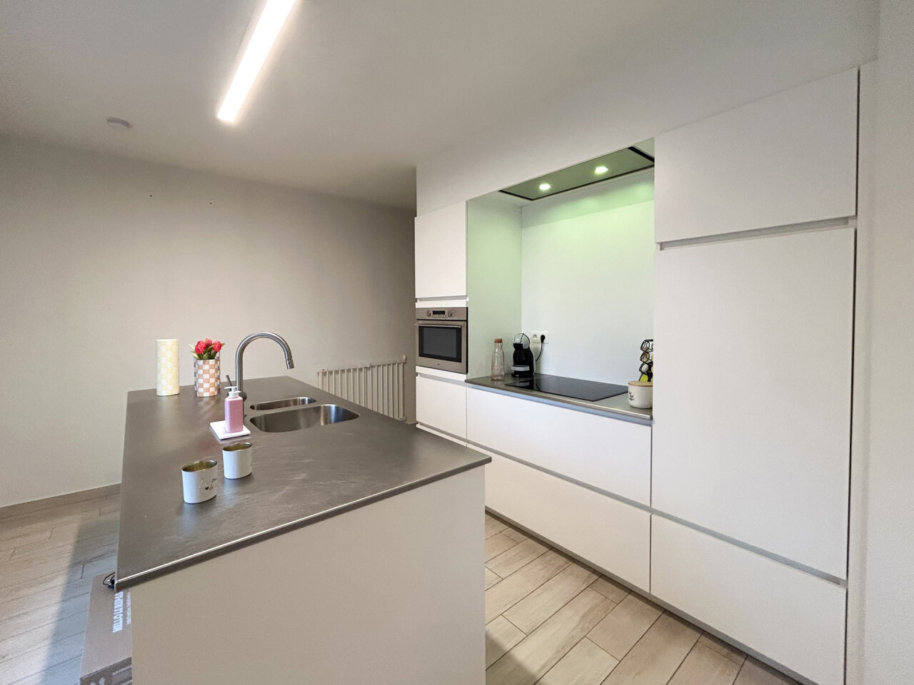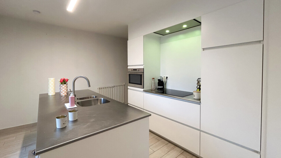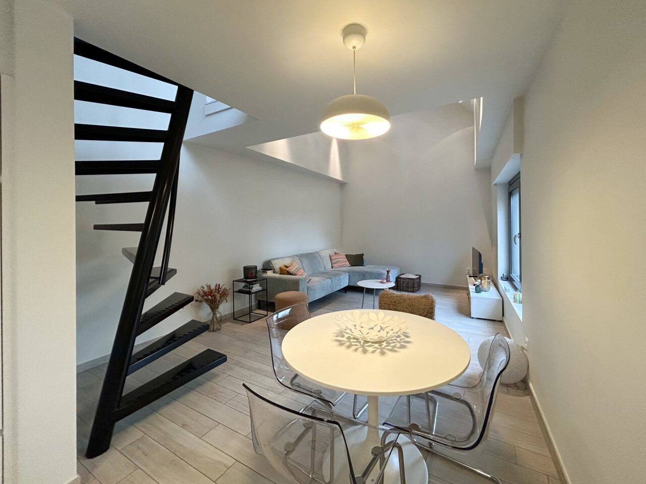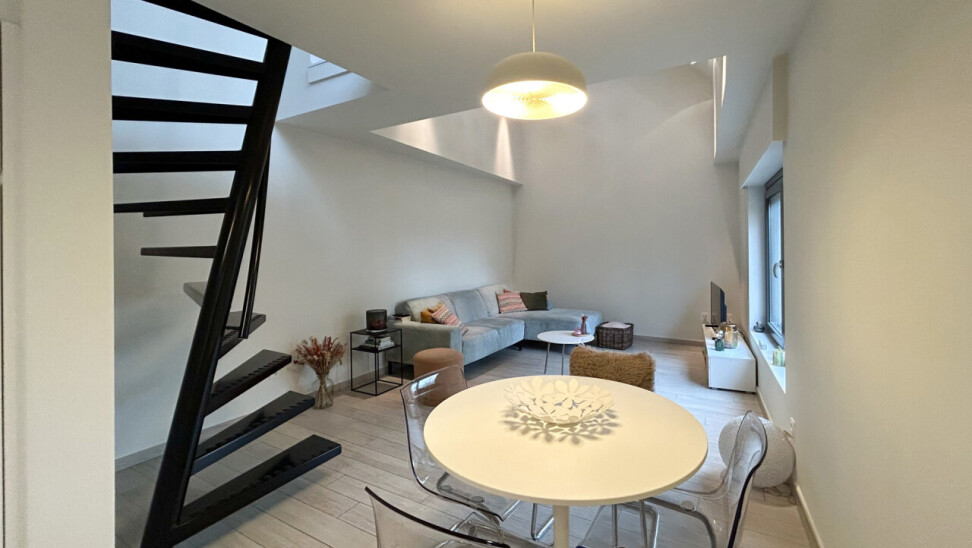 Wanneer we de trap naar boven nemen bereiken we de leefruimte met hoge plafonds, open keuken en de trap die toegang geeft tot het terras.