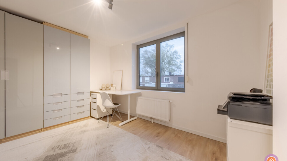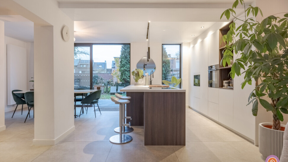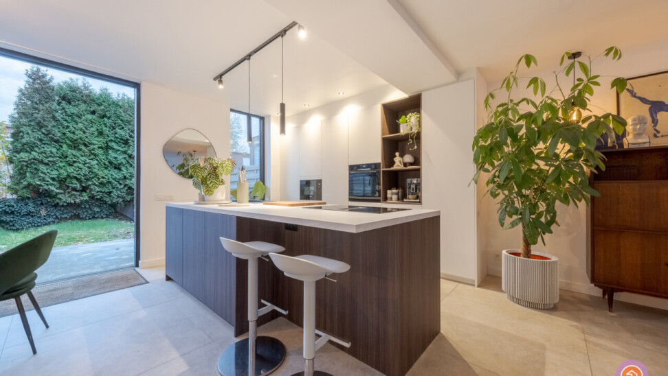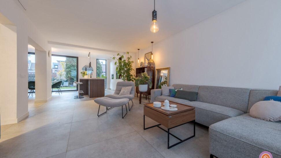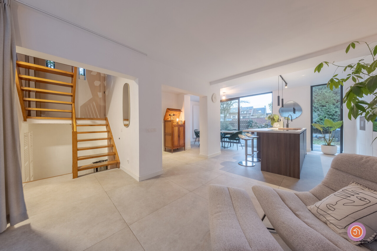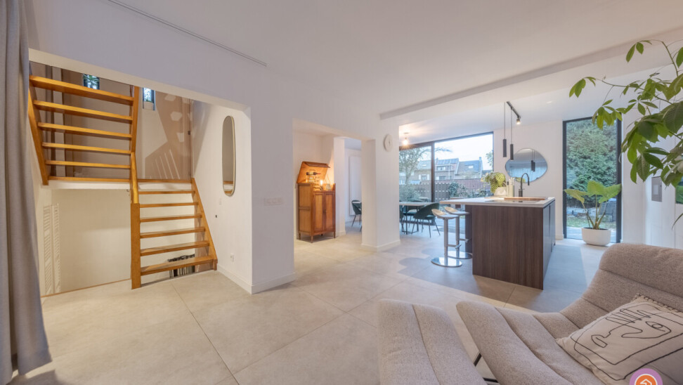 We komen binnen via een inkomhal die toegang geeft tot de gezellige woonkamer met achteraan de volledig uitgeruste keuken die uitkijkt op de tuin van de woning. De grote raampartijen in de keuken zorgen voor veel lichtinval. Het gelijkvloers biedt tevens ruimte voor een bureau.