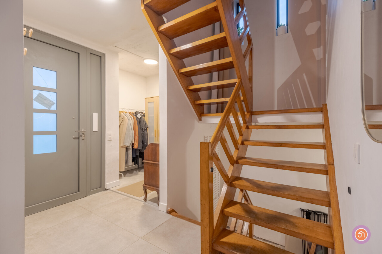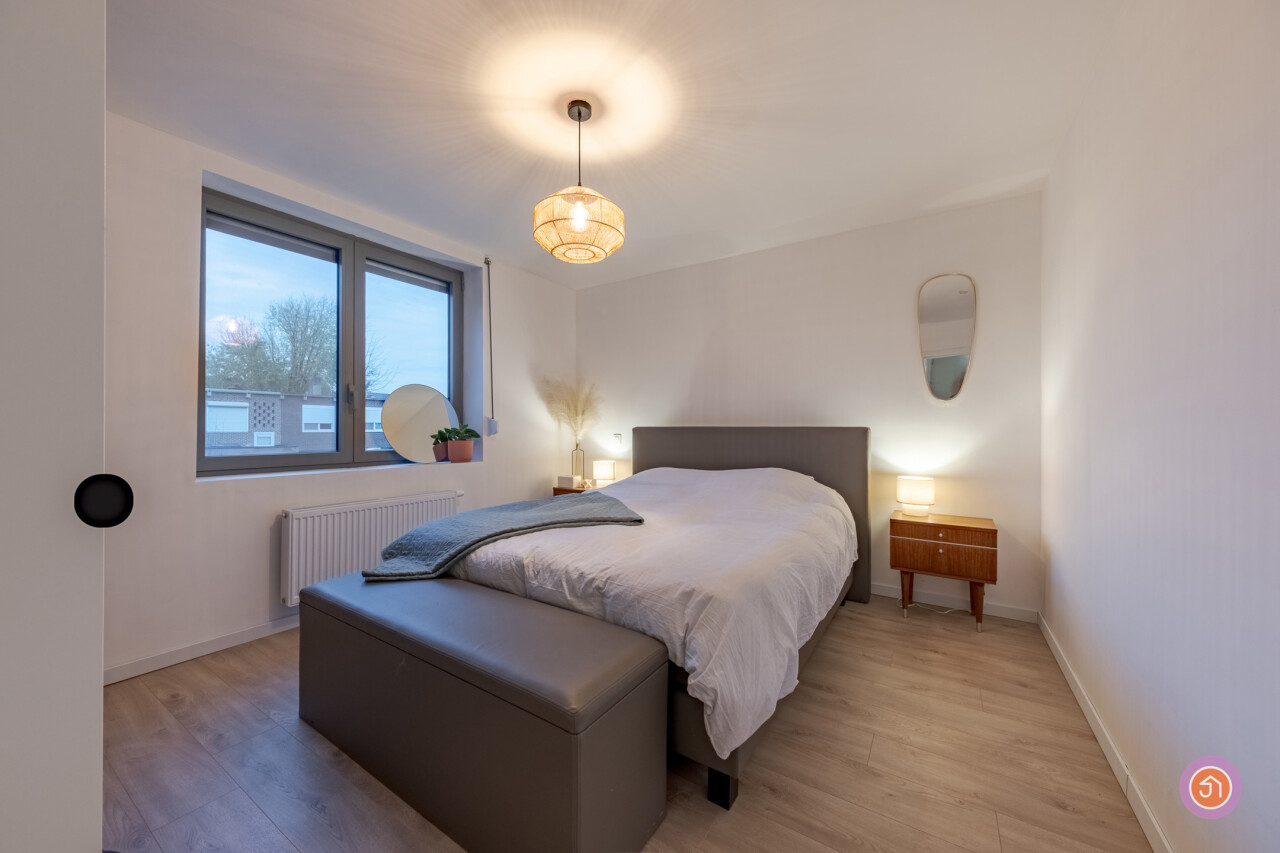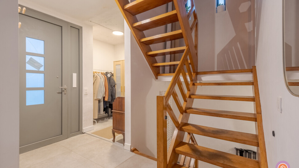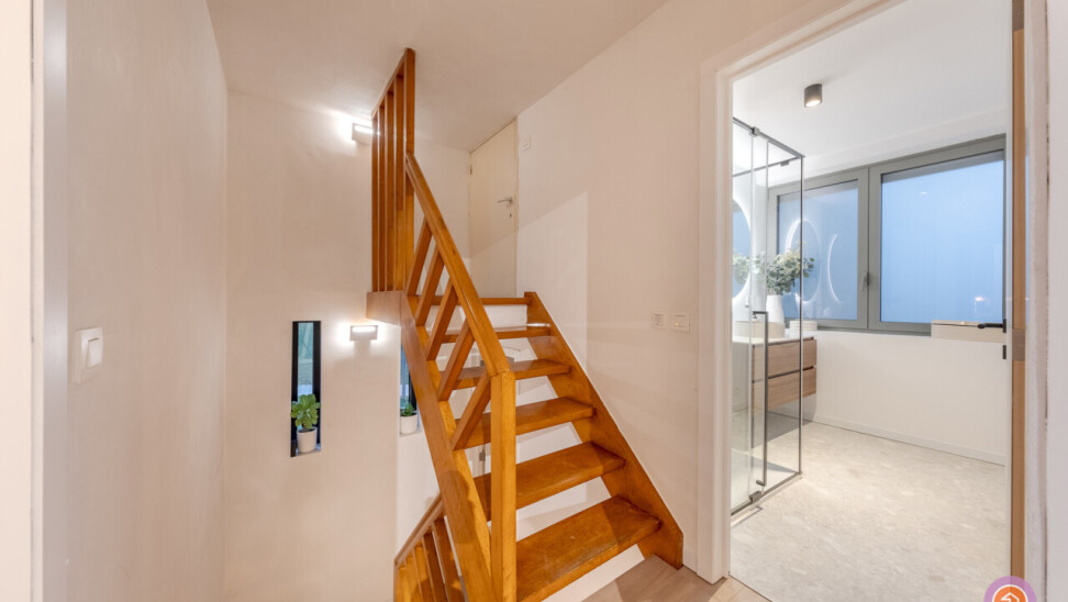 We komen binnen via een inkomhal die toegang geeft tot de gezellige woonkamer met achteraan de volledig uitgeruste keuken die uitkijkt op de tuin van de woning. De grote raampartijen in de keuken zorgen voor veel lichtinval. Het gelijkvloers biedt tevens ruimte voor een bureau.