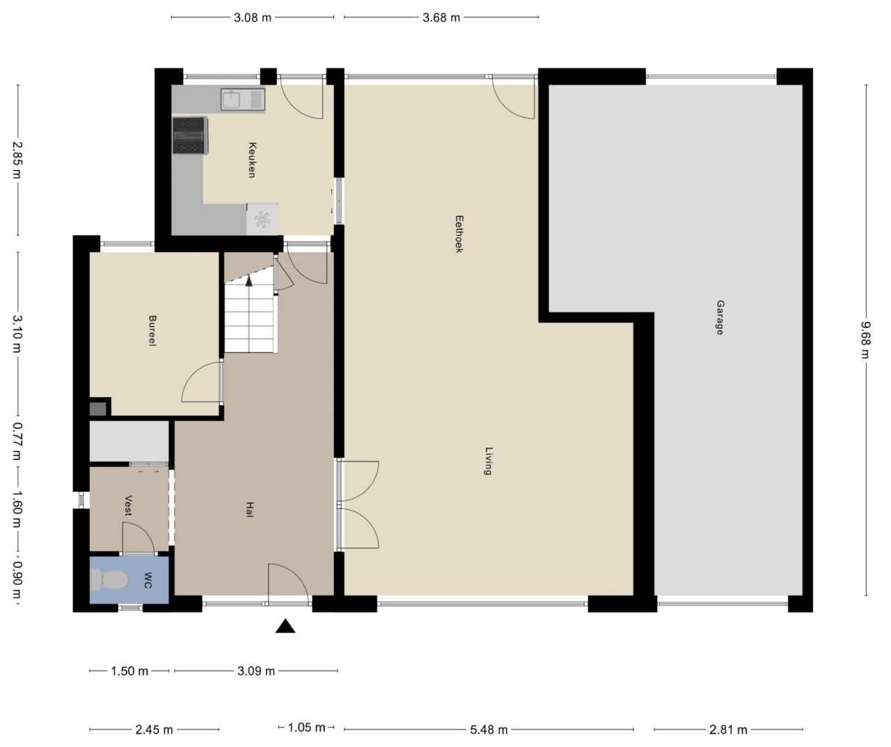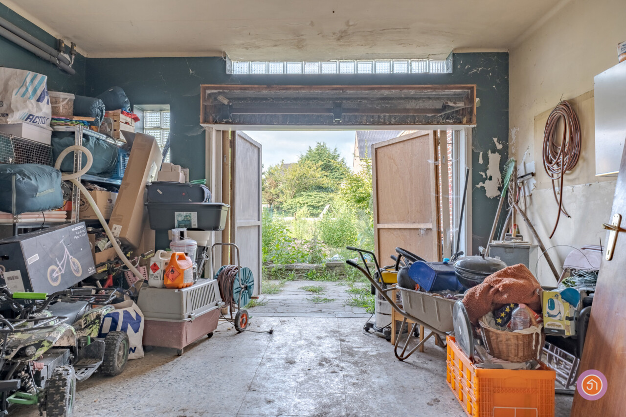We komen binnen via de inkomhal die toegang geeft tot de aangename en lichtrijke leefruimte, vanuit de leefruimte heb je een mooi zicht op de tuin. De keuken bevindt zich naast de leefruimte en kan eenvoudig verbonden worden met de leefruimte. Verder is er nog een praktische berging, een toilet en een grote garage die doorgang biedt tot aan de tuin.