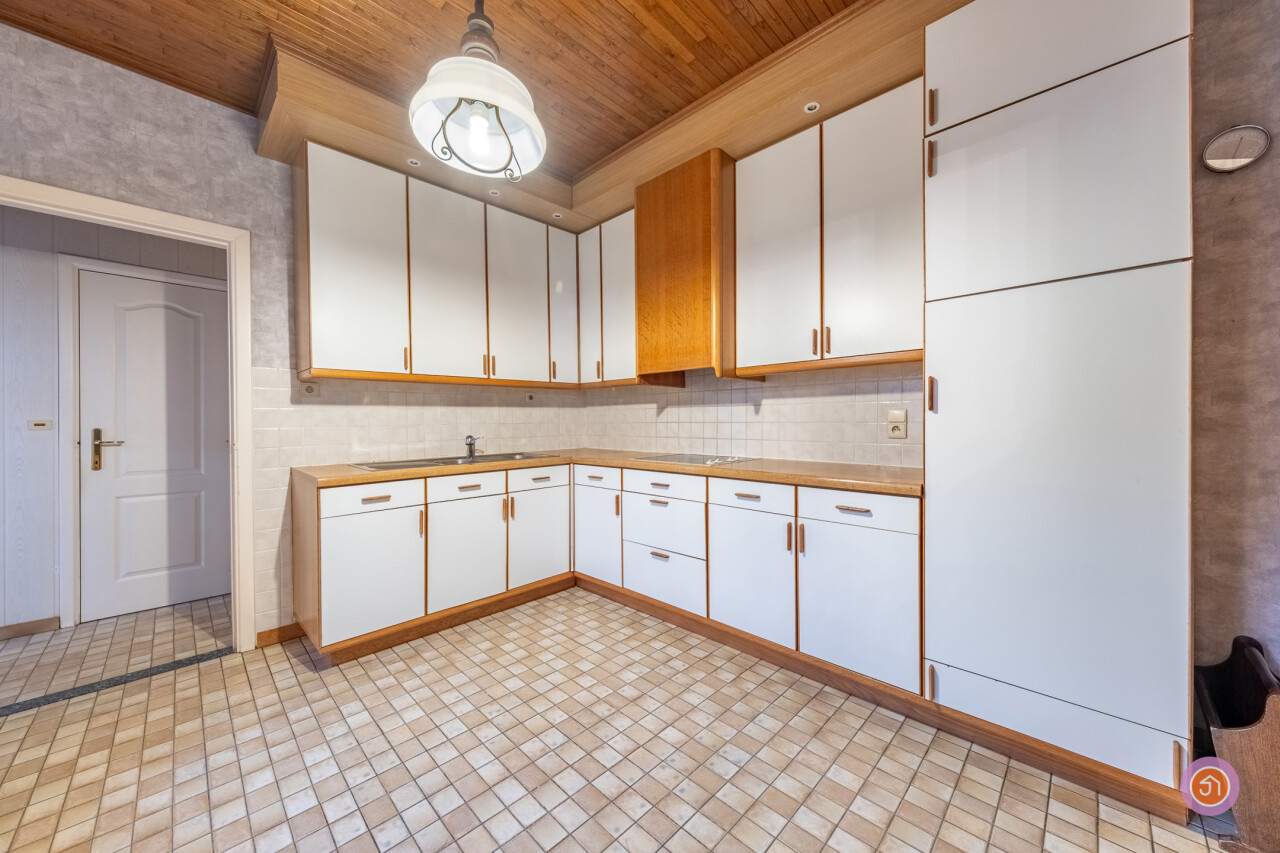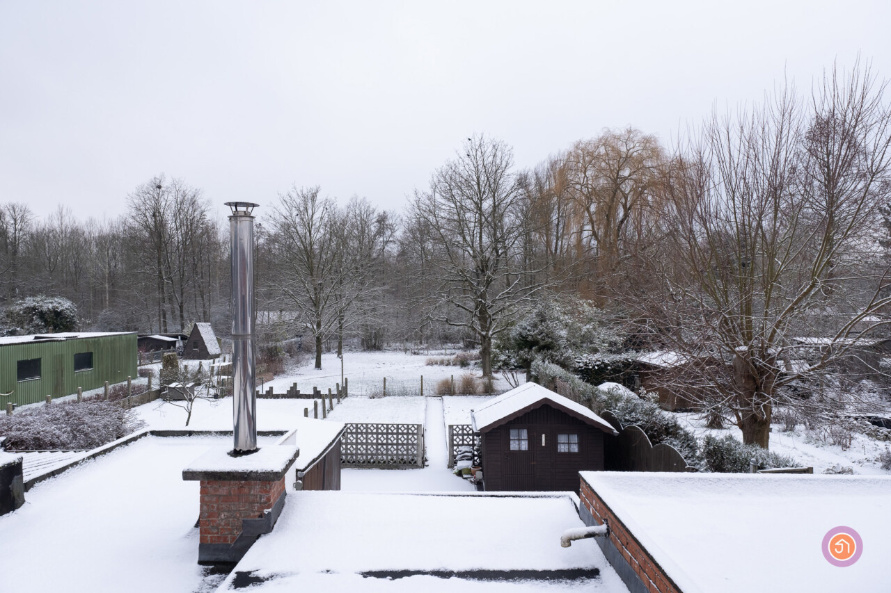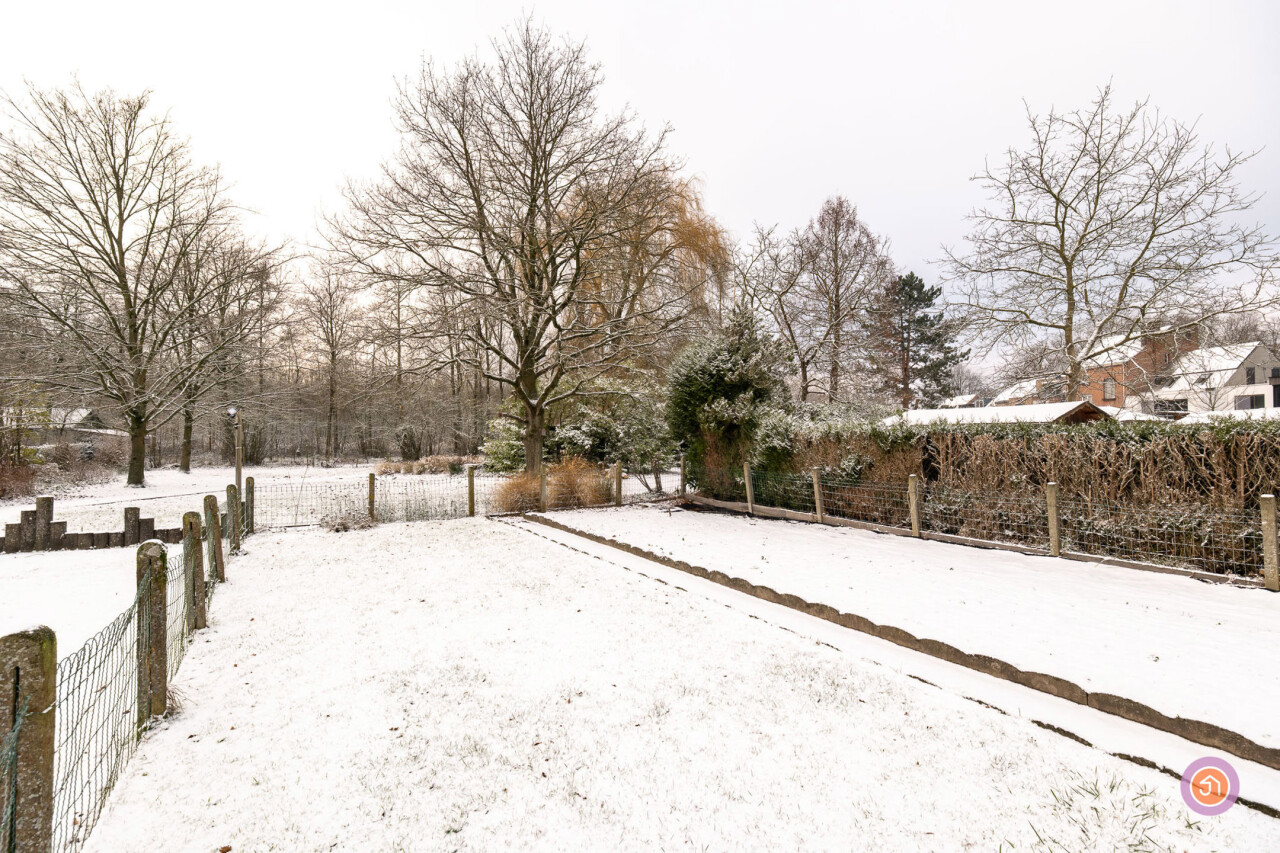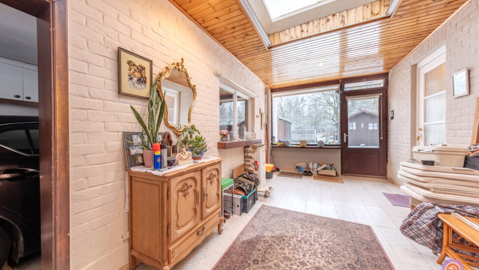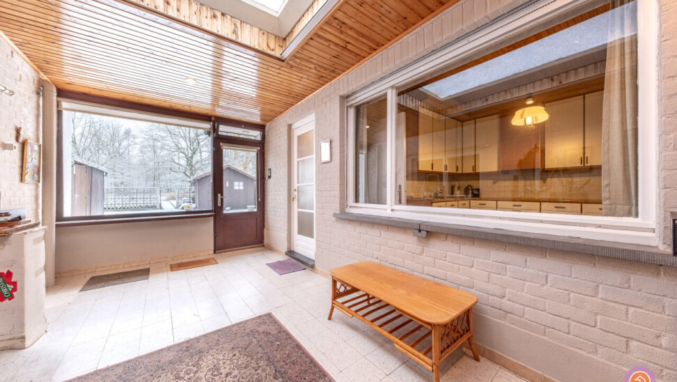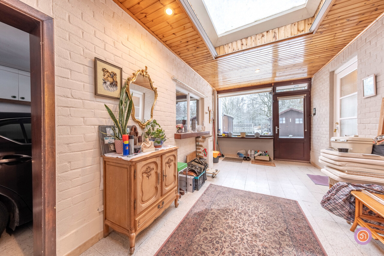 We komen de woning binnen via de inkomhal die toegang geeft tot de authentieke leefruimte. Vanuit de keuken die verbonden is met de leefruimte, komen we in een ruime veranda die zicht geeft op de gezellige tuin met prachtig uitzicht op het bos achteraan.