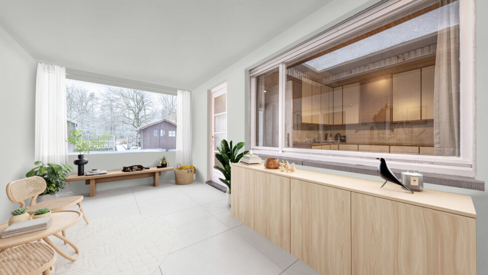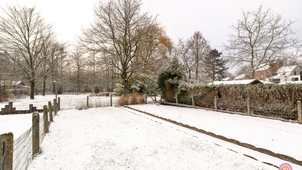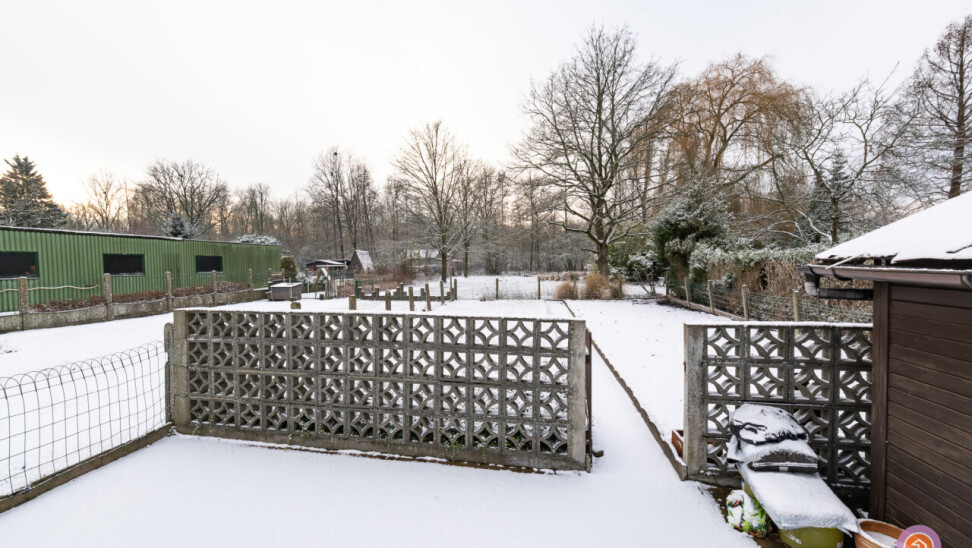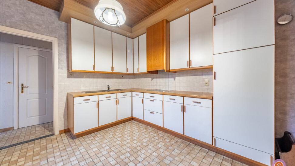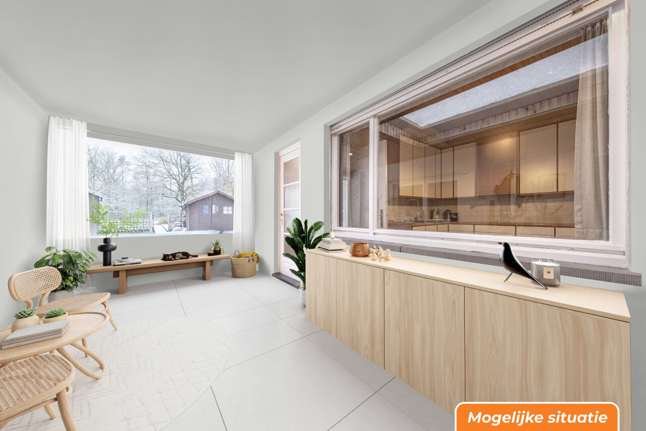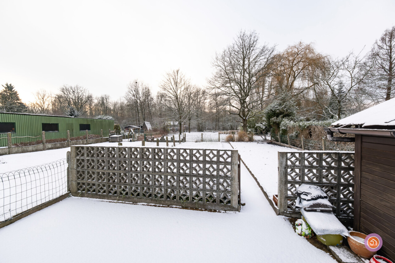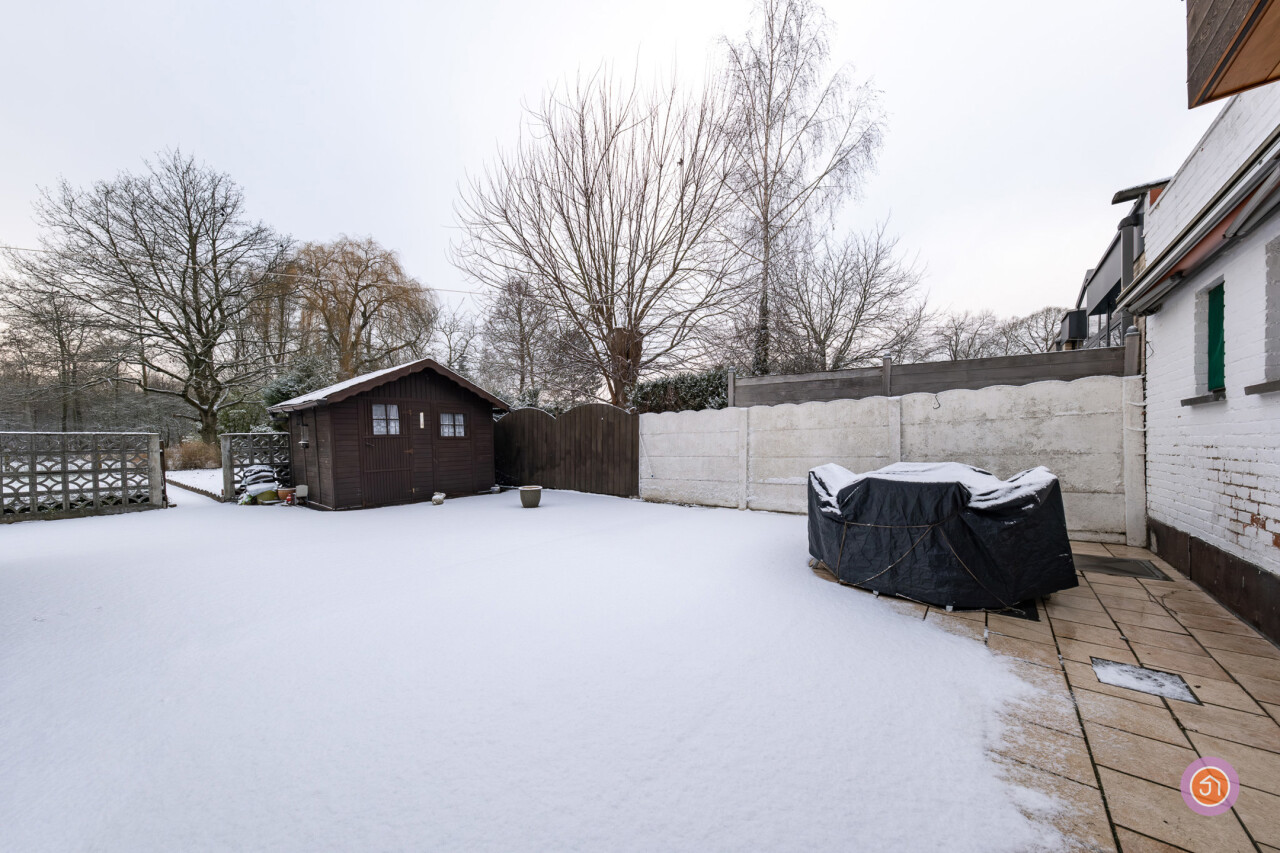 We komen de woning binnen via de inkomhal die toegang geeft tot de authentieke leefruimte. Vanuit de keuken die verbonden is met de leefruimte, komen we in een ruime veranda die zicht geeft op de gezellige tuin met prachtig uitzicht op het bos achteraan.
