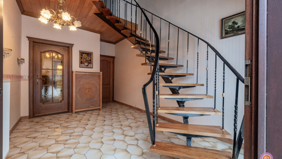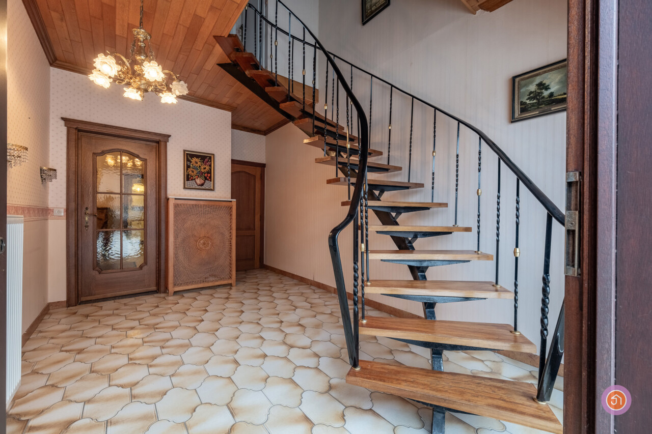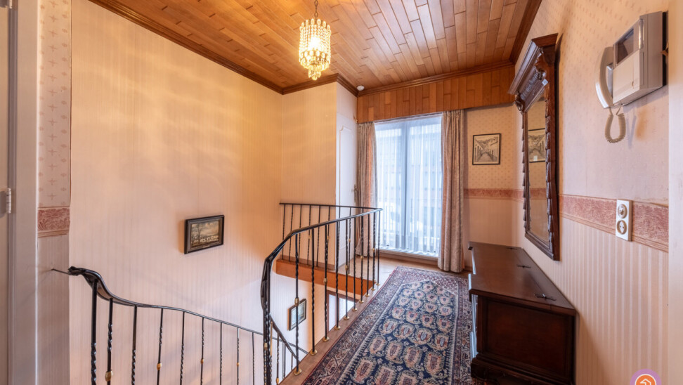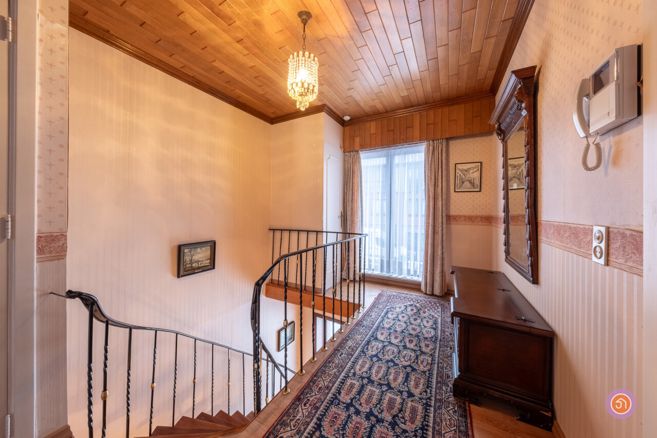 De authentieke trap in de inkomhal brengt ons naar de eerste verdieping, waar zich drie slaapkamers bevinden, waarvan twee slaapkamers zeer ruim.
