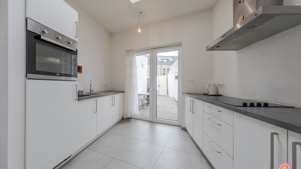We komen binnen via een inkomhal die toegang geeft tot enerzijds het gastentoilet en anderzijds de lichtrijke woonkamer met aansluitend de uitgeruste keuken die uitkijkt op de binnenkoer van de woning. De grote raampartijen en de koepel in de keuken zorgen voor voldoende lichtinval.