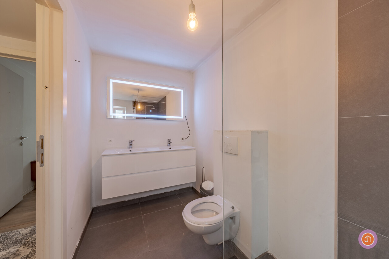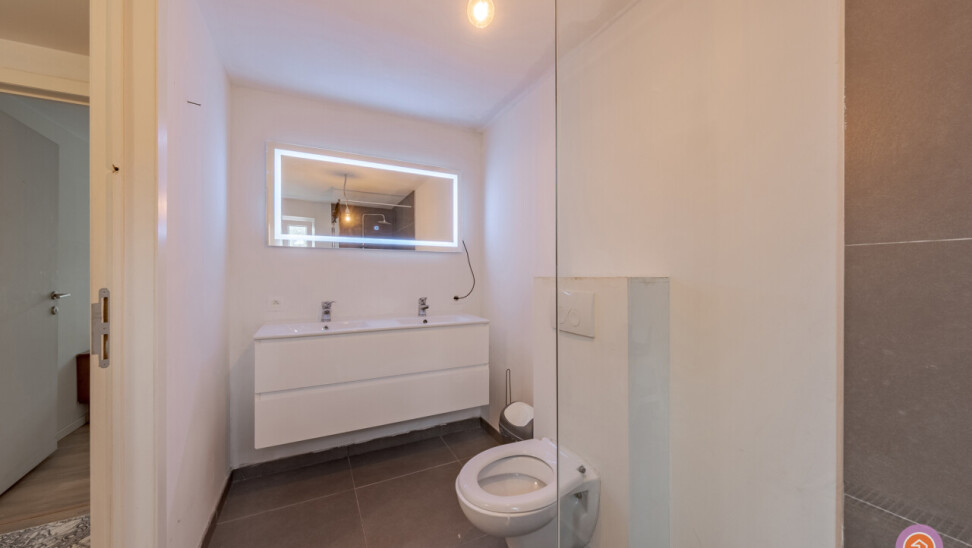 Wanneer we de trap naar boven nemen bereiken we de nachthal die toegang geeft tot twee slaapkamers en de badkamer voorzien van inloopdouche, toilet en dubbele lavabo.