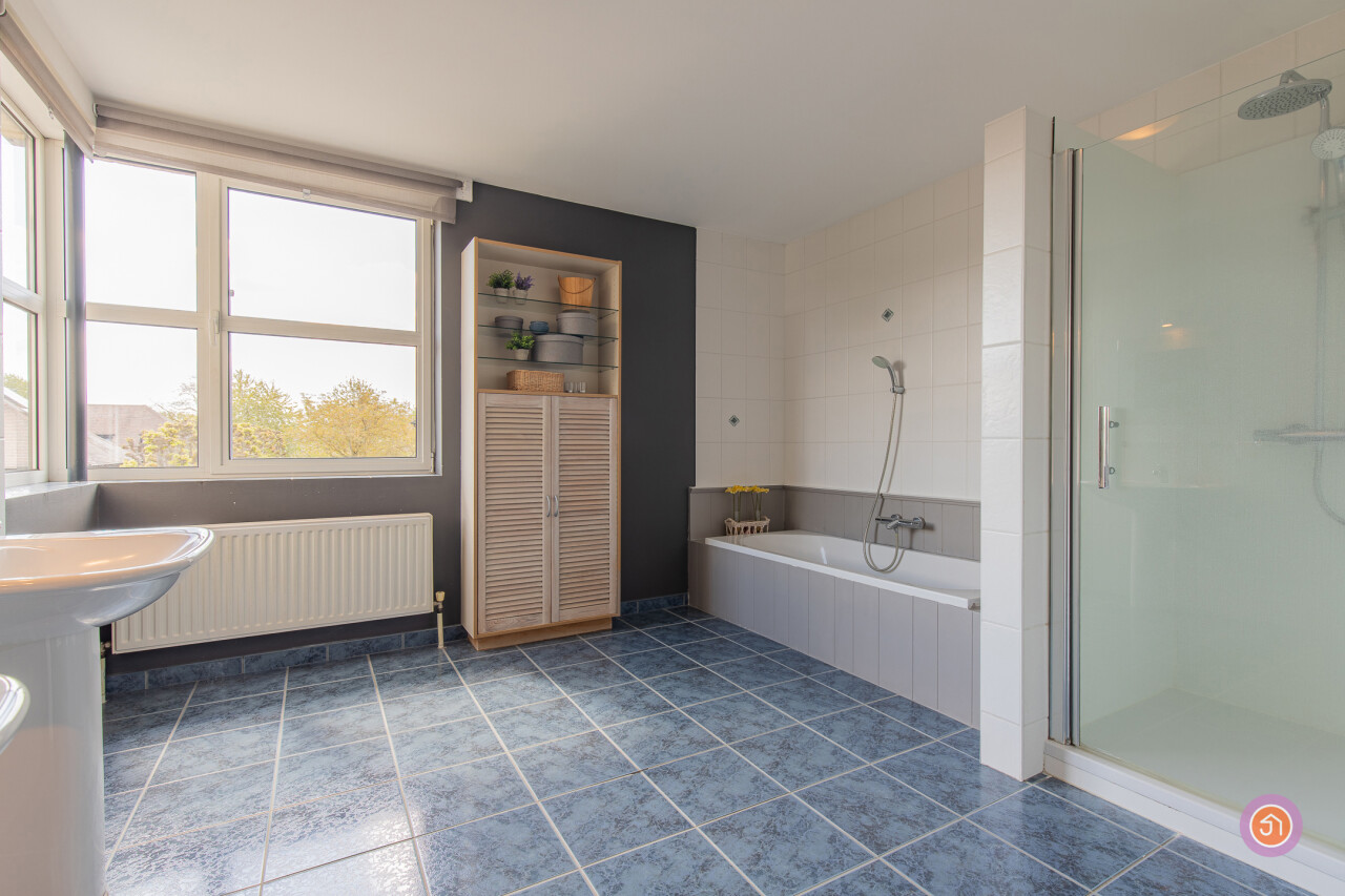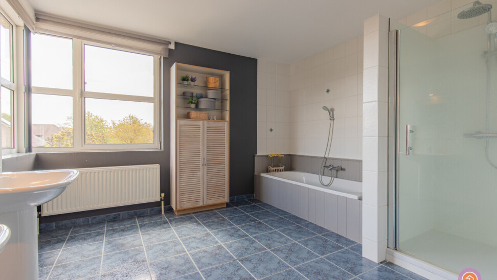 Via de trap bereiken we de eerste verdieping waar zich twee slaapkamers en een badkamer voorzien van een ligbad, douche en dubbele lavabo bevinden.
