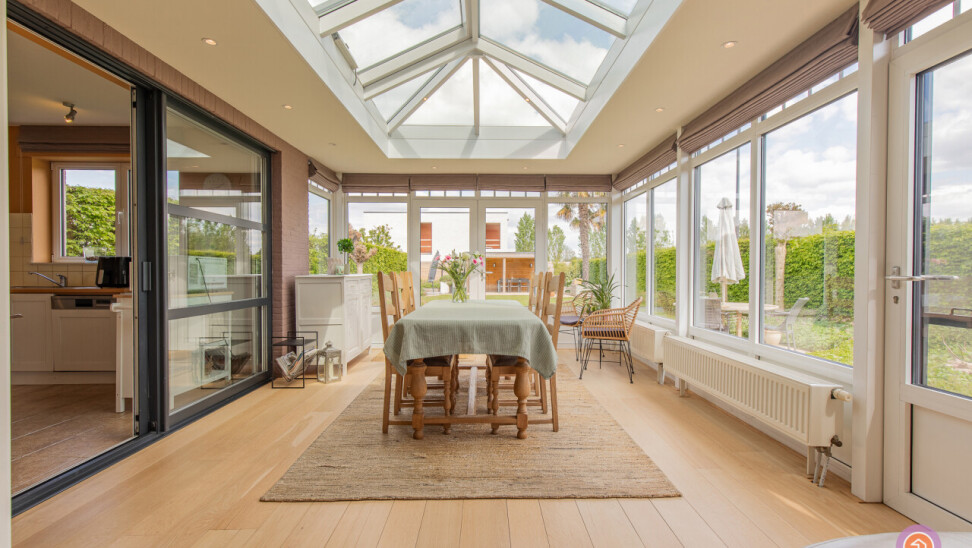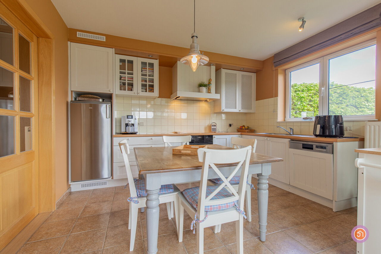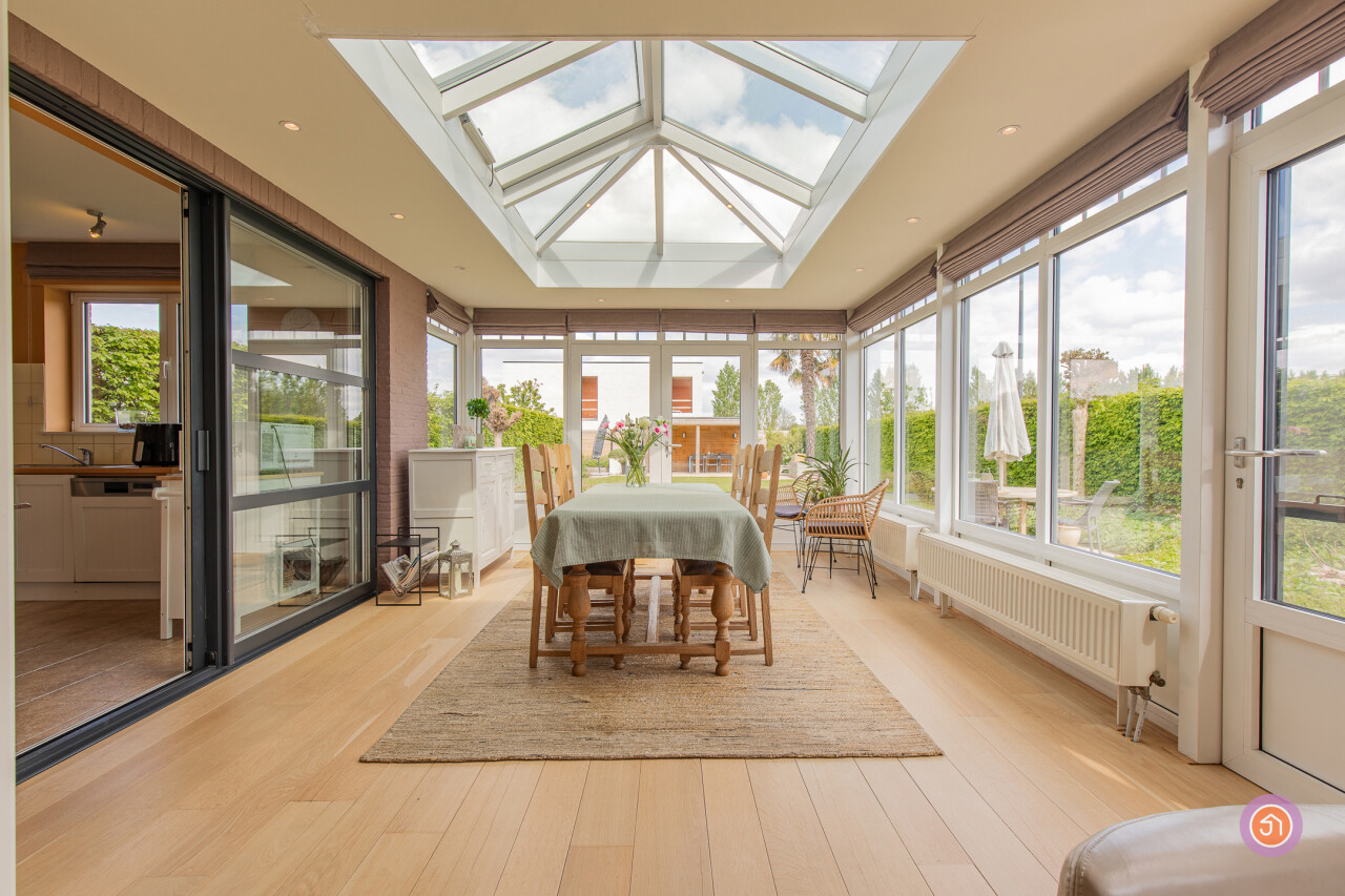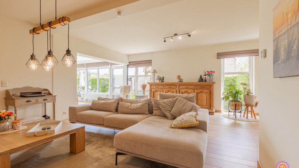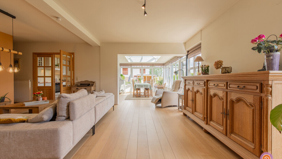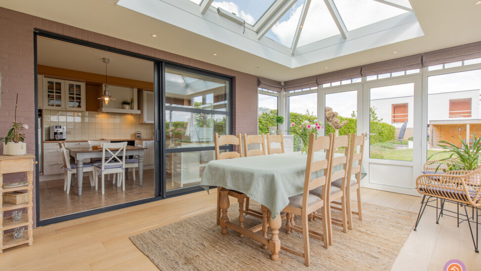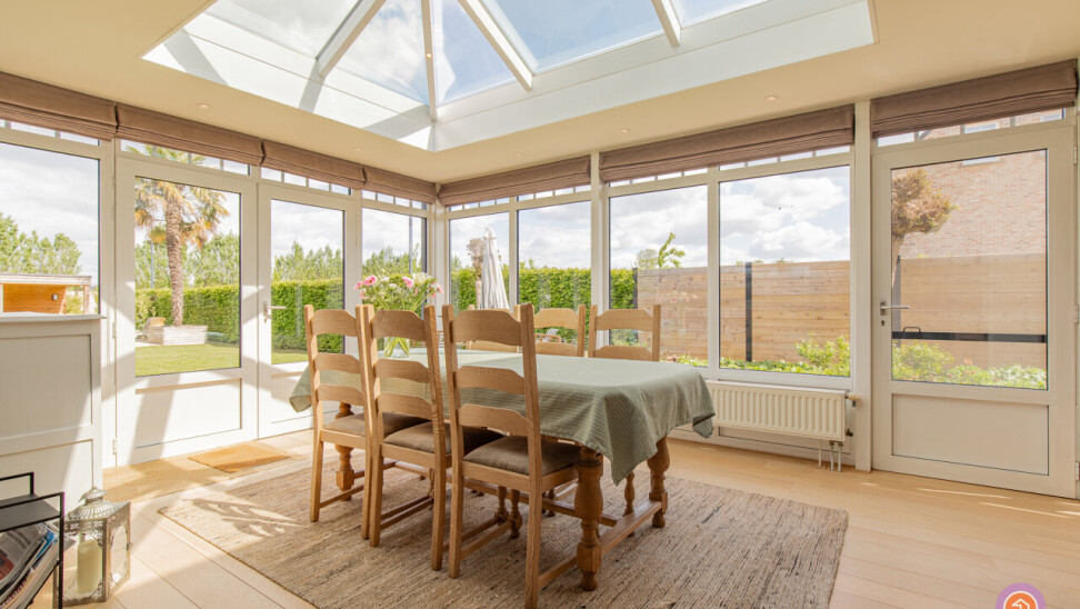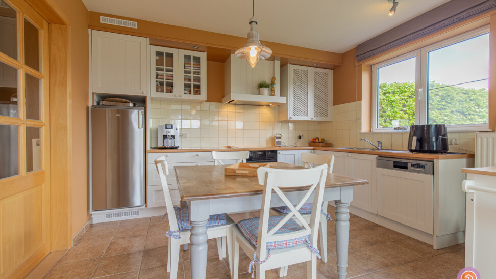 We komen binnen via een inkomhal die toegang geeft tot een gastentoilet. Verder treffen we de zit- en eetruimte met aansluitend de volledig geïnstalleerde keuken. Vanuit de veranda heb je een prachtig zicht op de aangelegde tuin door de vele raampartijen. Hierdoor hebben deze ruimtes voldoende lichtinval.