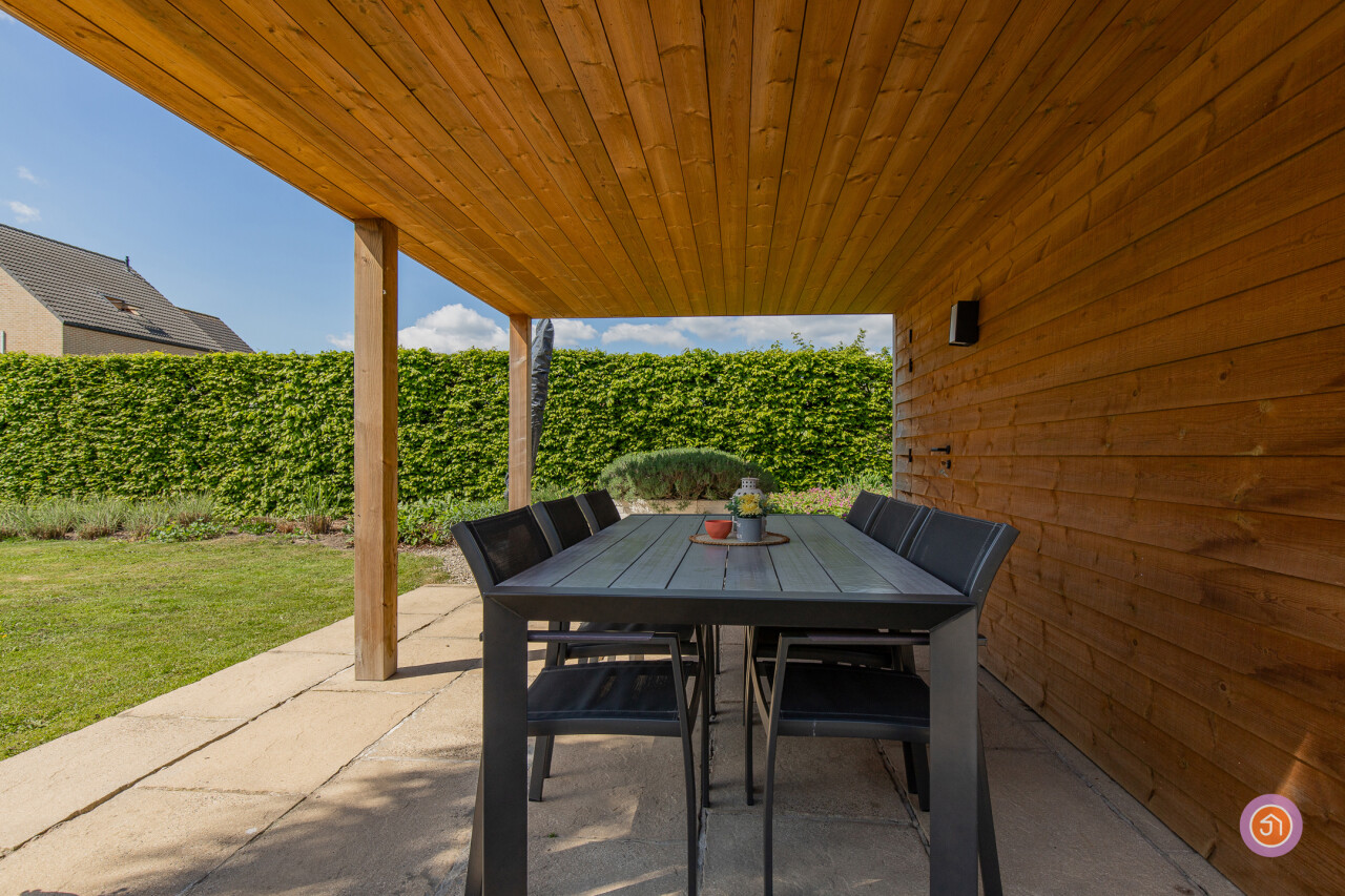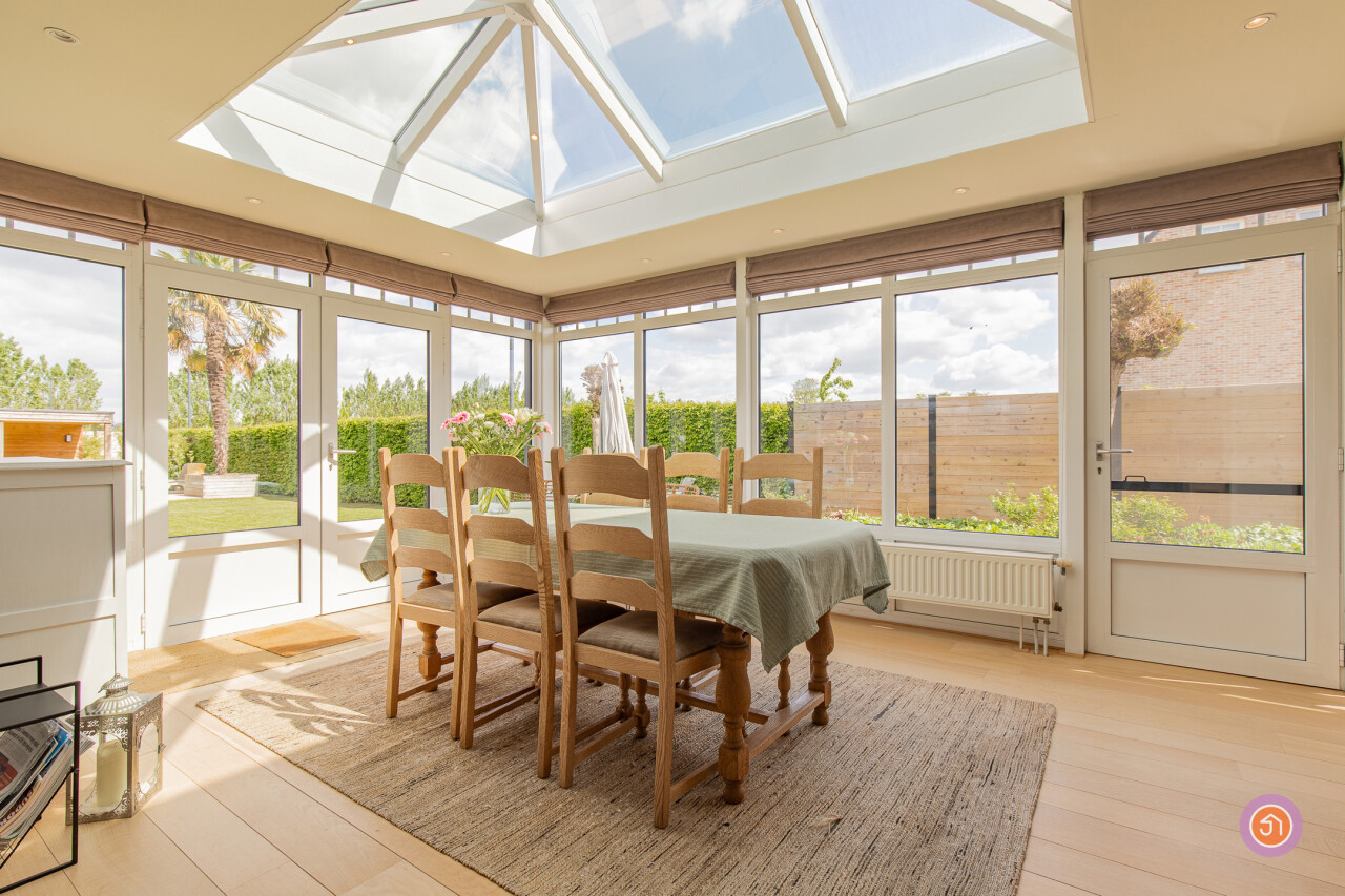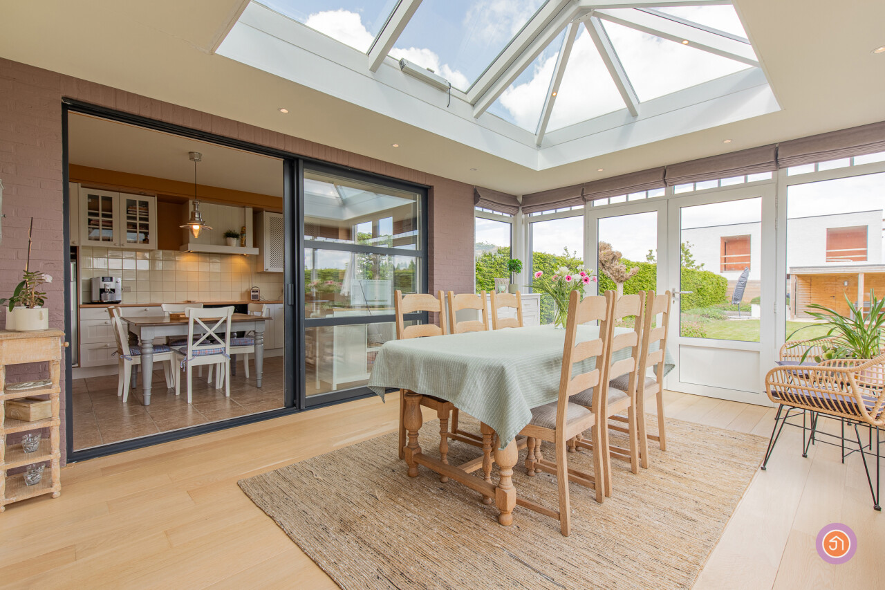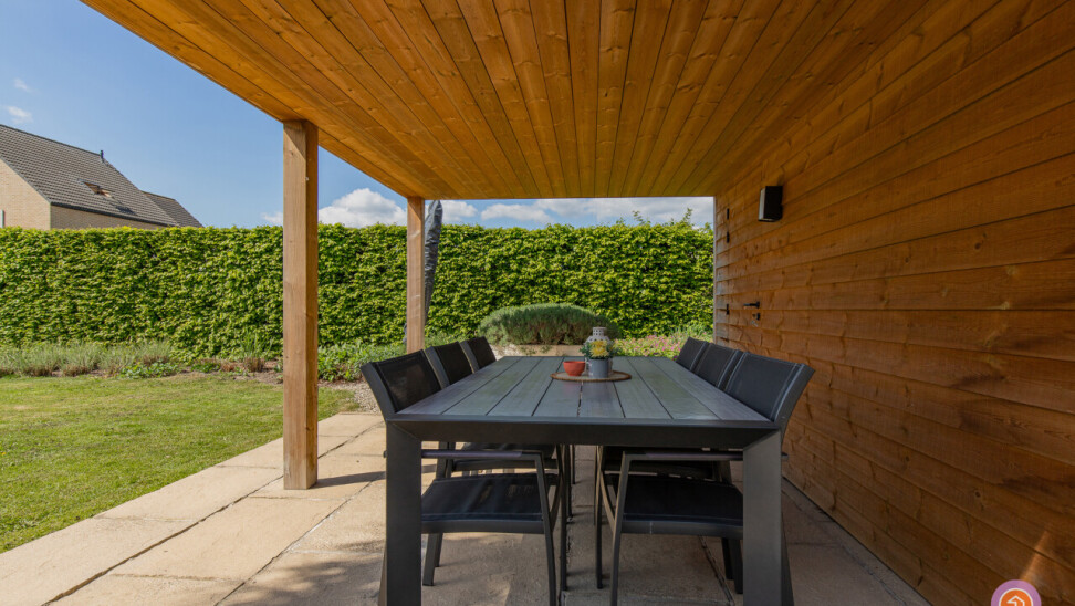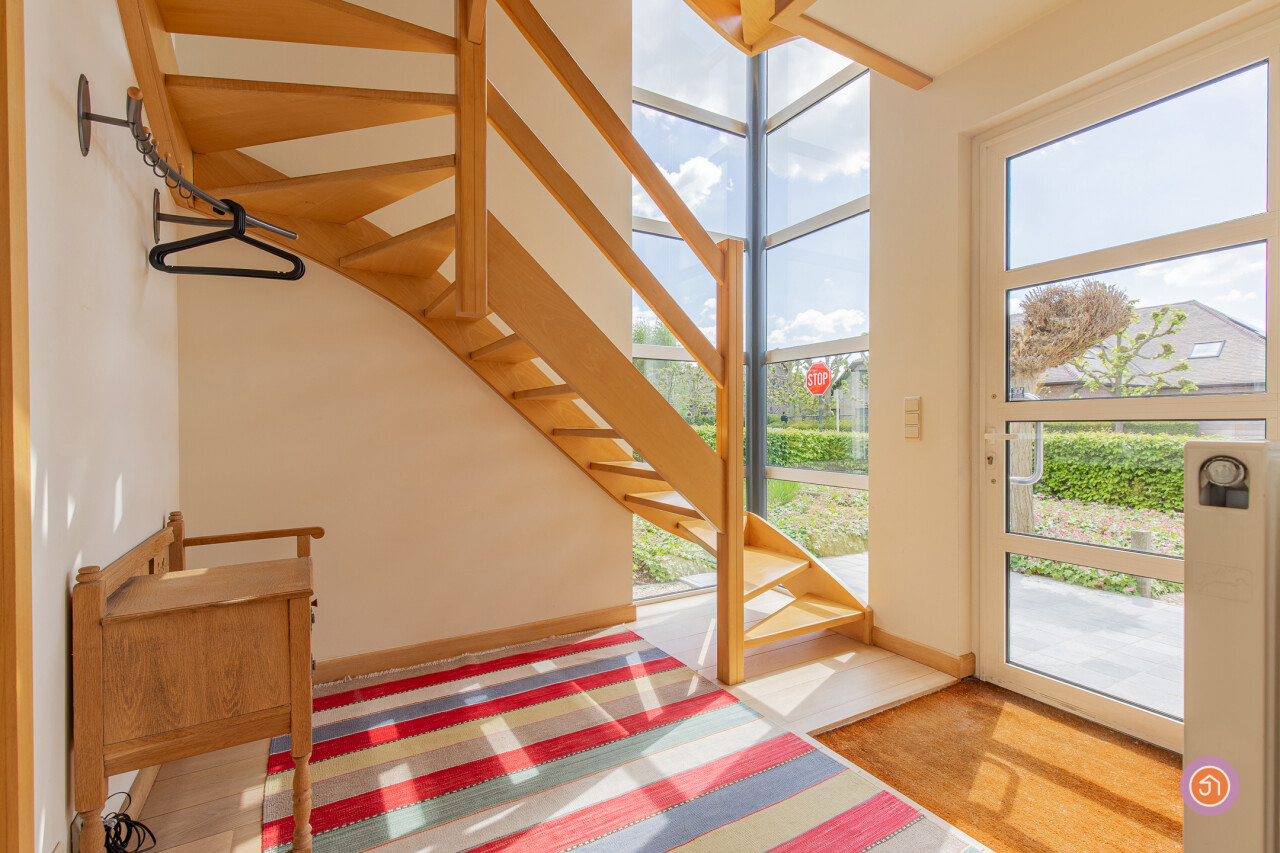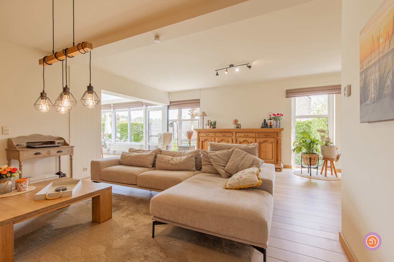 We komen binnen via een inkomhal die toegang geeft tot een gastentoilet. Verder treffen we de zit- en eetruimte met aansluitend de volledig geïnstalleerde keuken. Vanuit de veranda heb je een prachtig zicht op de aangelegde tuin door de vele raampartijen. Hierdoor hebben deze ruimtes voldoende lichtinval.