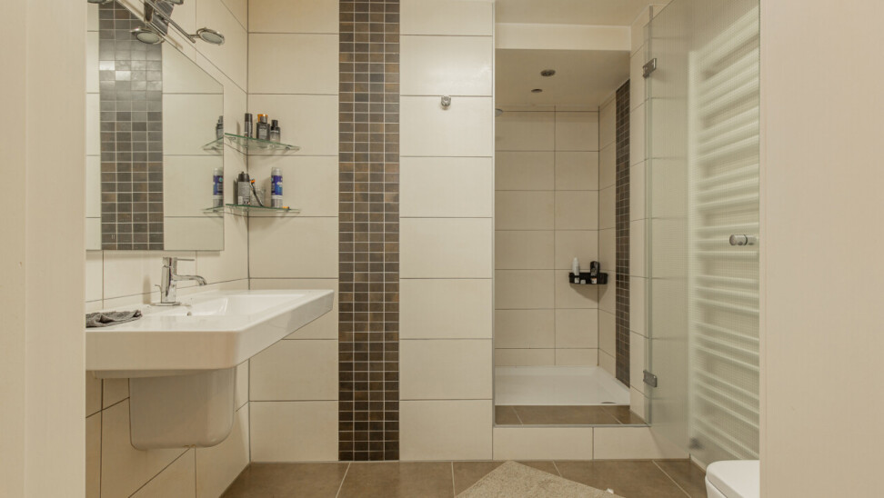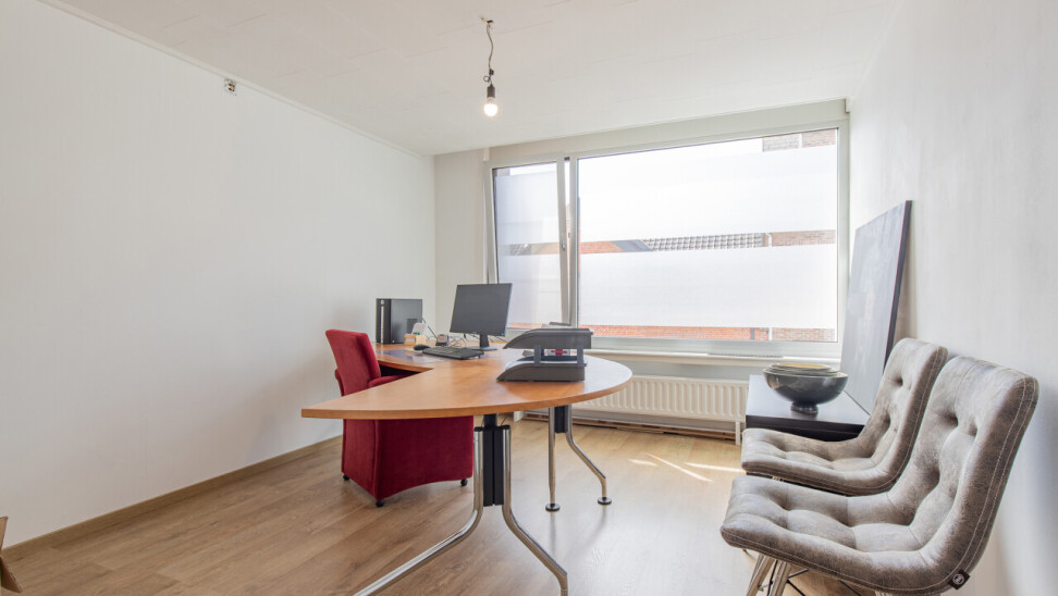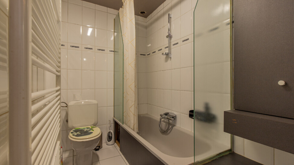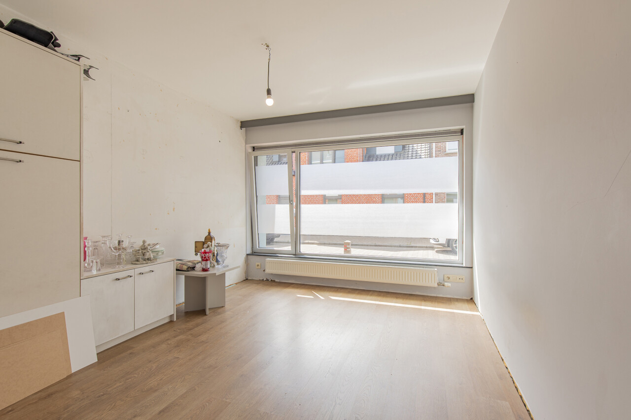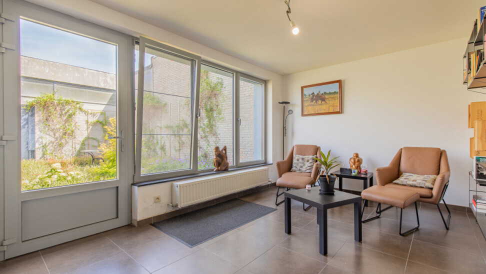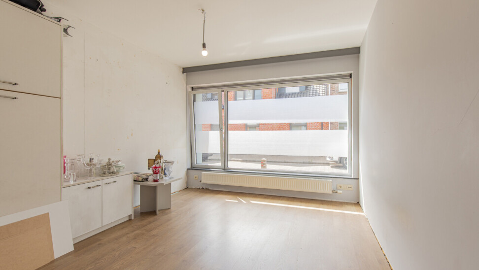 Bij het betreden van de woning verwelkomt de inkomhal je. Links bevindt zich een ruime slaapkamer, rechts hebben we een polyvalente ruimte die dienst kan doen als hobbyruimte of bureau. Verder door vinden we een badkamer met inloopdouche, lavabo en toilet. De gezellige zithoek kijkt uit op de aangename stadstuin. Aansluitend vind je nog een polyvalente ruimte die momenteel dienst doet als berging, maar ook kan functioneren als slaapkamer.