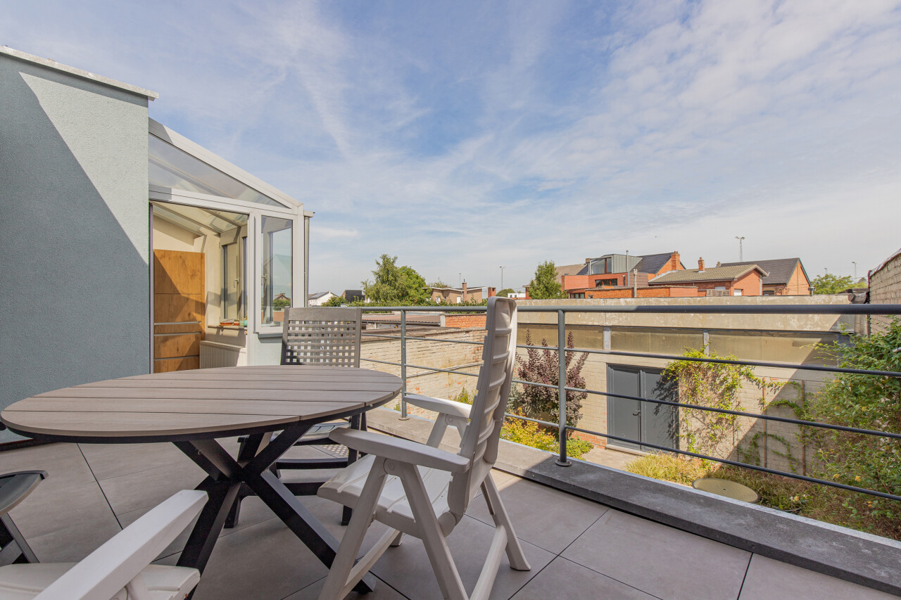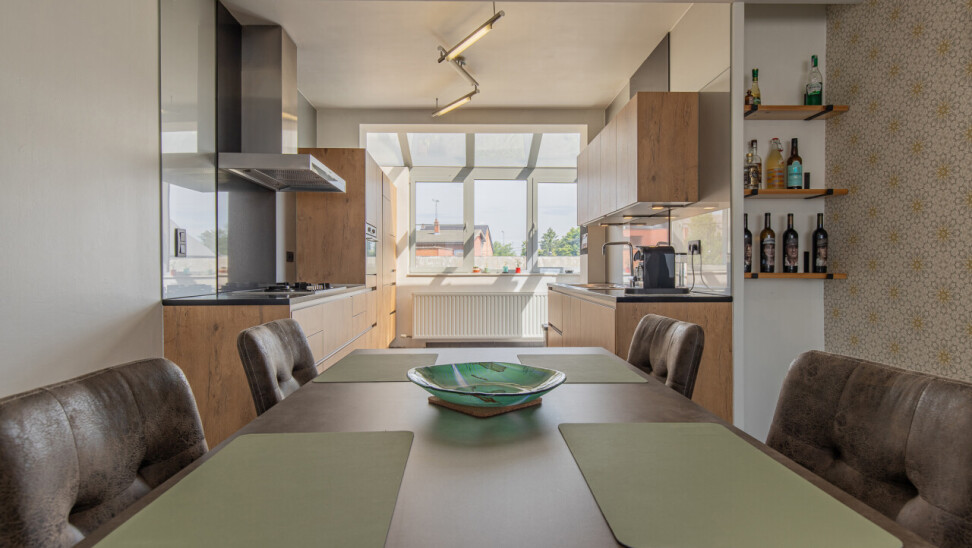Vanuit de hal nemen we de trap naar de verdieping waar het woongedeelte zich bevindt. De lichtrijke leefruimte staat in verbinding met de open keuken. Grenzend aan de keuken is er een terras met een aangenaam uitzicht op de tuin. Verder treffen we op deze verdieping ook een praktische berging, een bureauruimte die perfect kan omgevormd worden tot slaapkamer, en een uitgeruste badkamer.