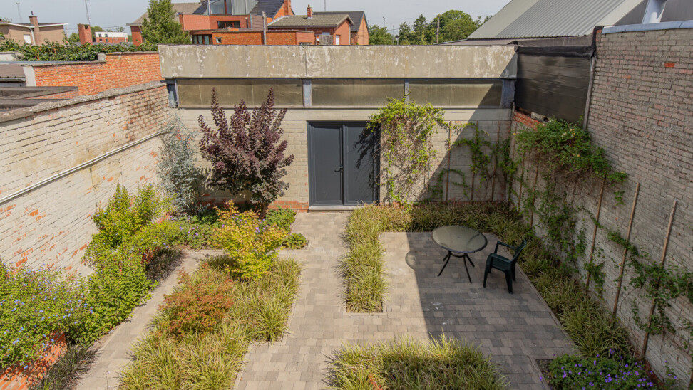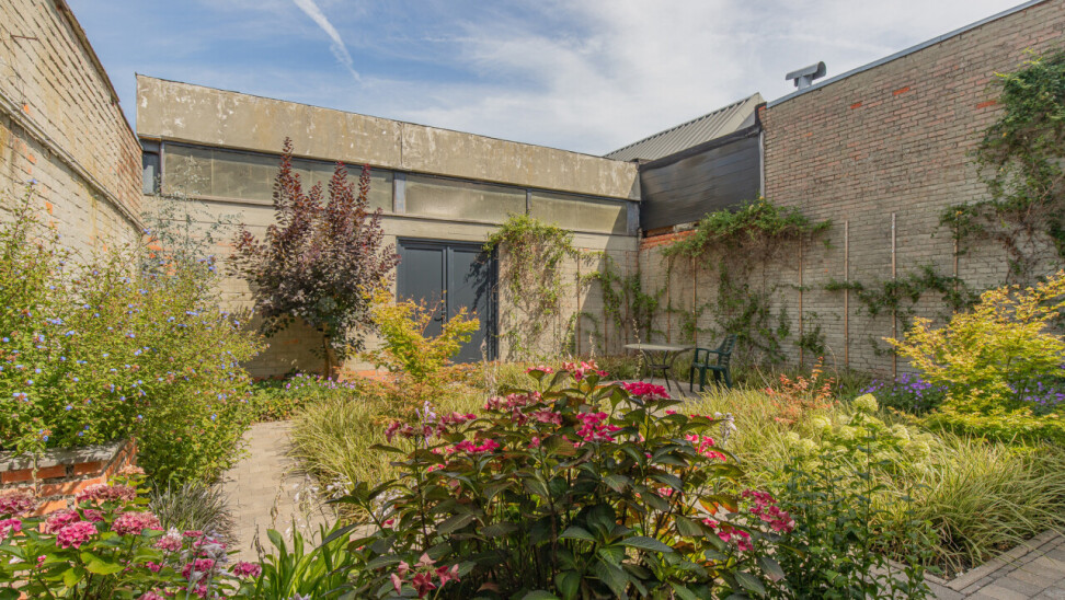 Achteraan in de tuin wacht een ruime hangar die bereikbaar is via de Meirstraat, een absolute meerwaarde voor wie nood heeft aan opslagruimte, atelier, hobbyruimte of werkplaats.
