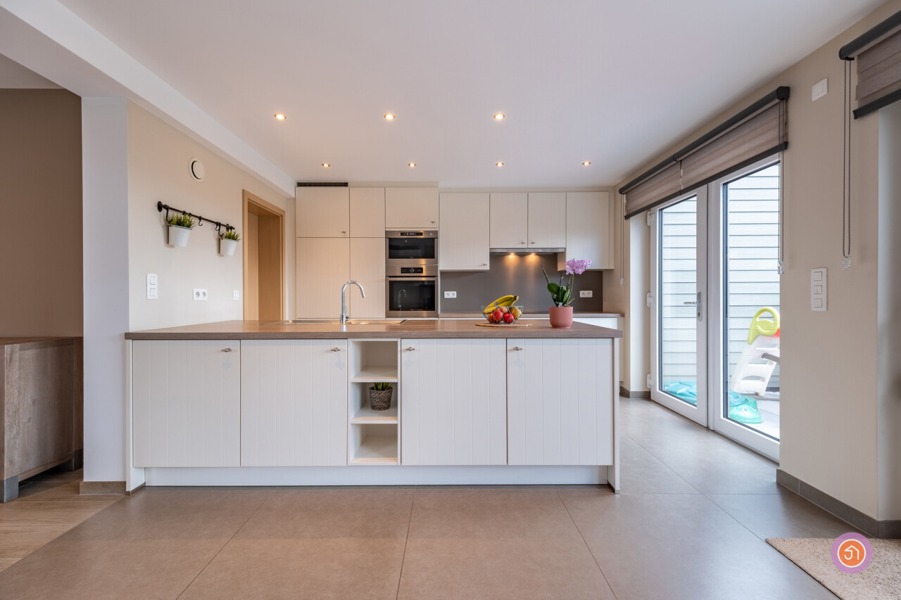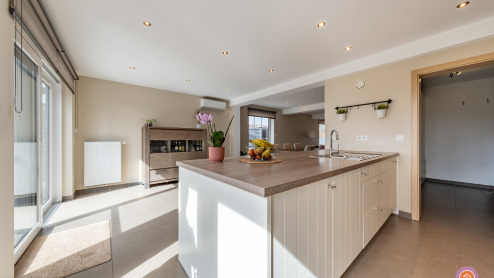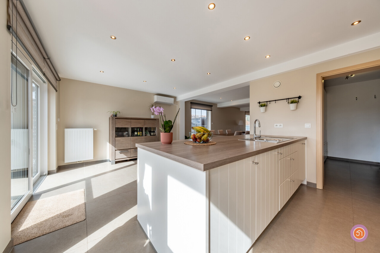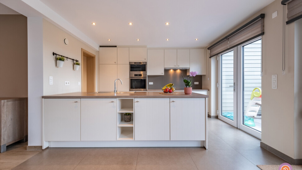We komen binnen via een inkomhal die toegang geeft tot een gastentoilet en ingemaakte kasten. Via de deur, treffen we de zit- en eetruimte met aansluitend de volledig geïnstalleerde open keuken met een prachtig zicht op de ruime tuin. Een praktische berging sluit zich aan bij de keuken waar zich de aansluiting voor was en droog bevindt.