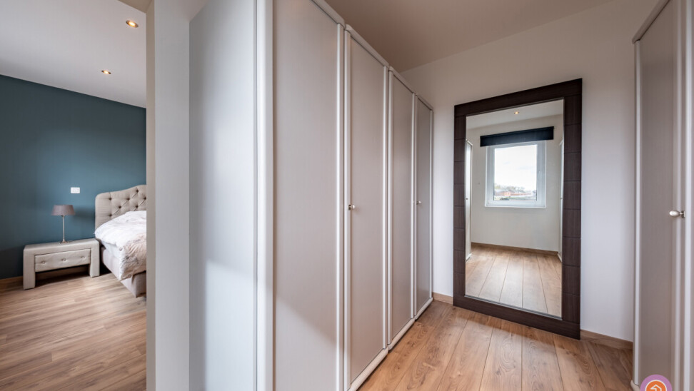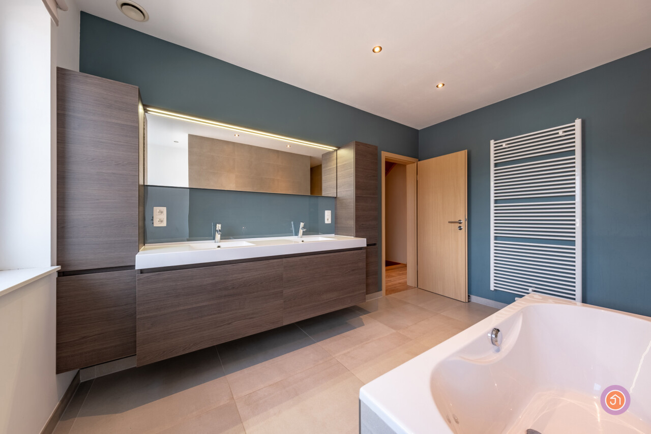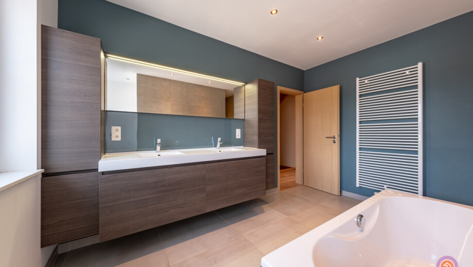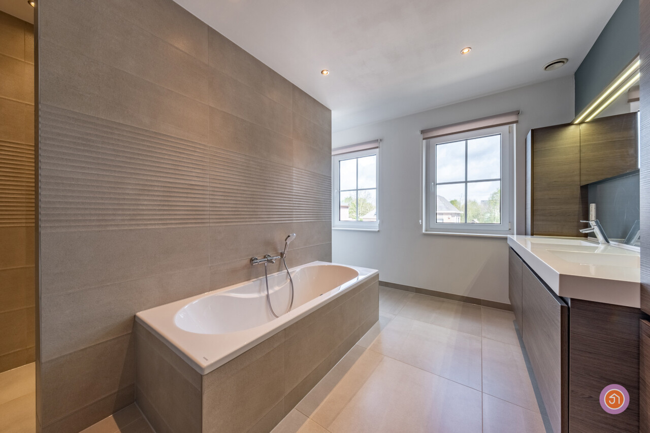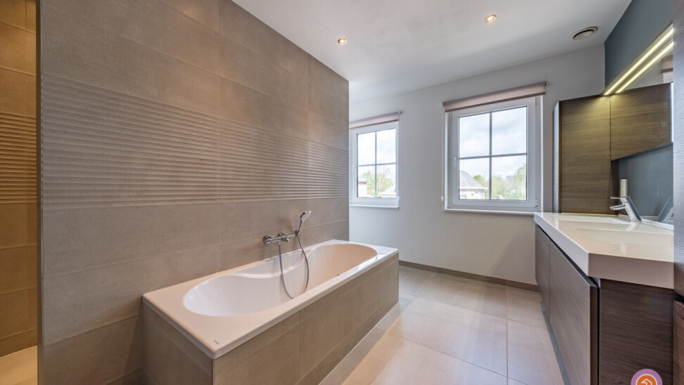 Via de trap bereiken we de eerste verdieping waar zich twee slaapkamers en een badkamer voorzien van een ligbad, inloopdouche, dubbele lavabo en toilet bevinden.