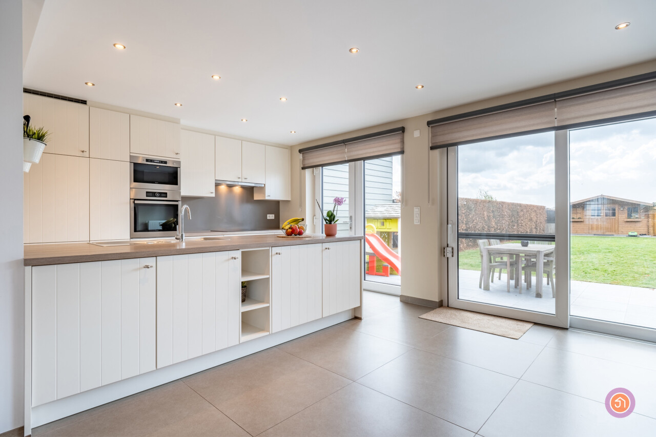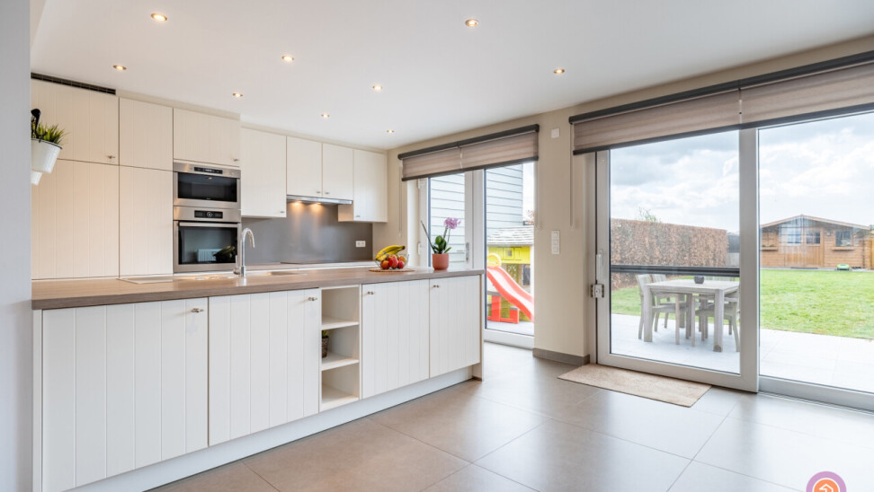 De raampartijen in de leefruimte en keuken zorgen voor voldoende lichtinval.