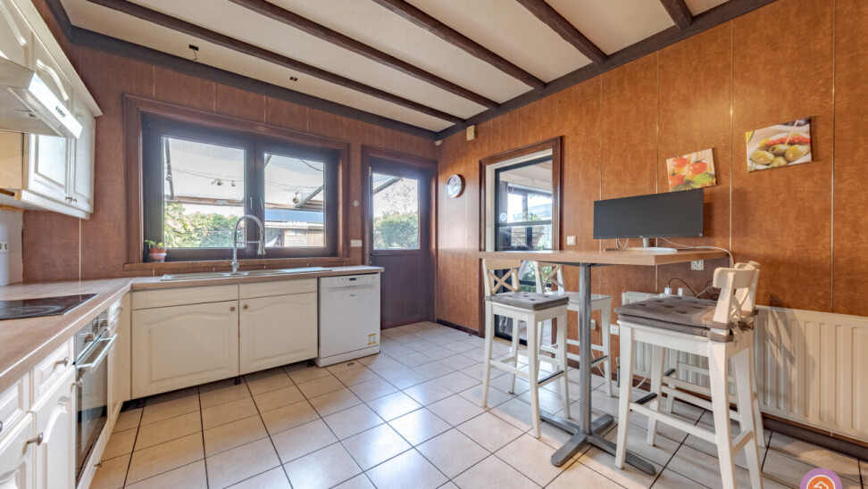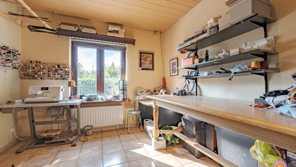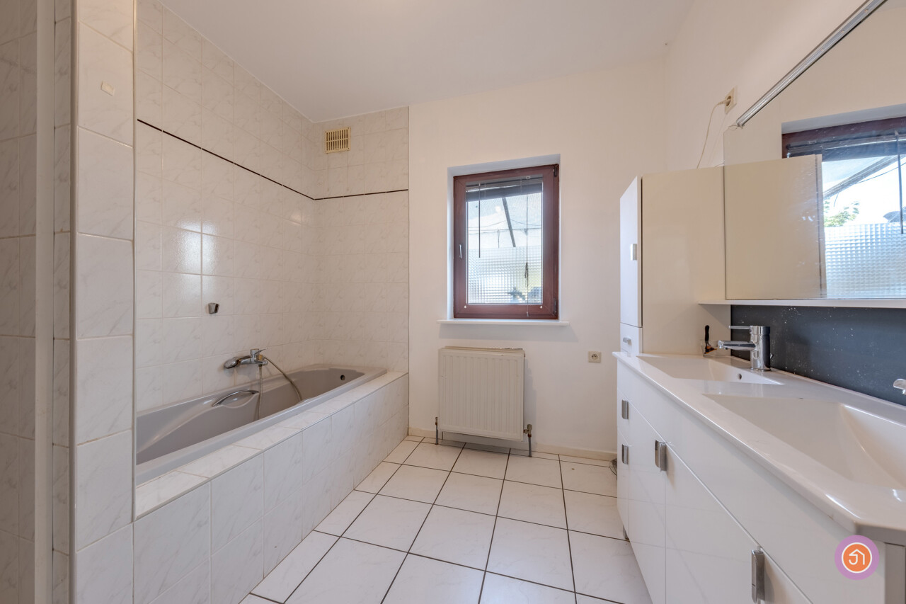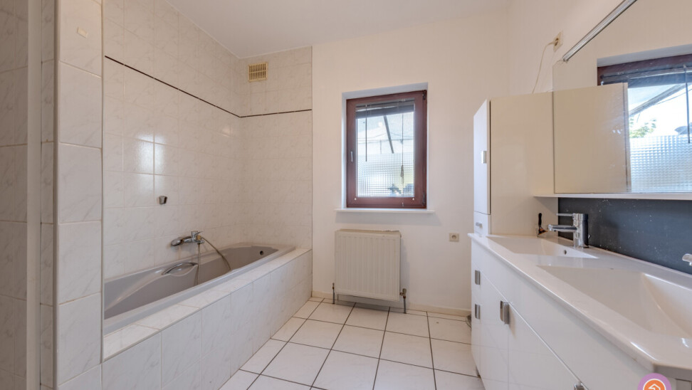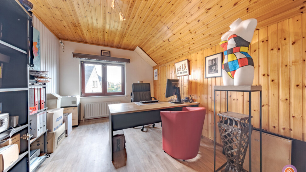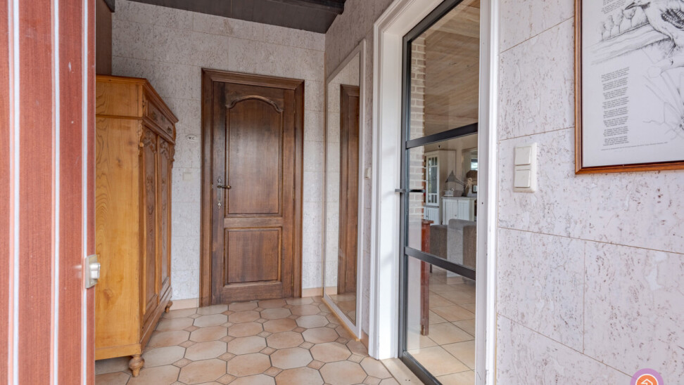 We komen binnen via de ruime inkomhal die toegang geeft tot enerzijds een bureauruimte/ slaapkamer en anderzijds de gezellige leefruimte met aansluitend de volledig geïnstalleerde keuken. Wanneer we door de keuken wandelen, komen we in de hal waar we toegang hebben tot de badkamer met dubbele lavabo, douche, ligbad en toilet. Verder vinden we op het gelijkvloers nog een gastentoilet.