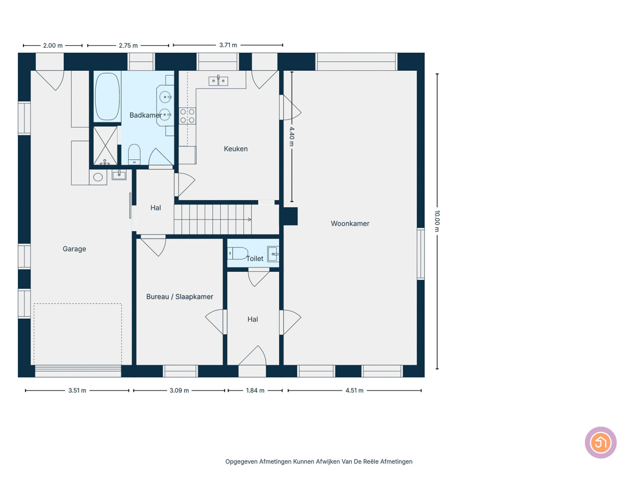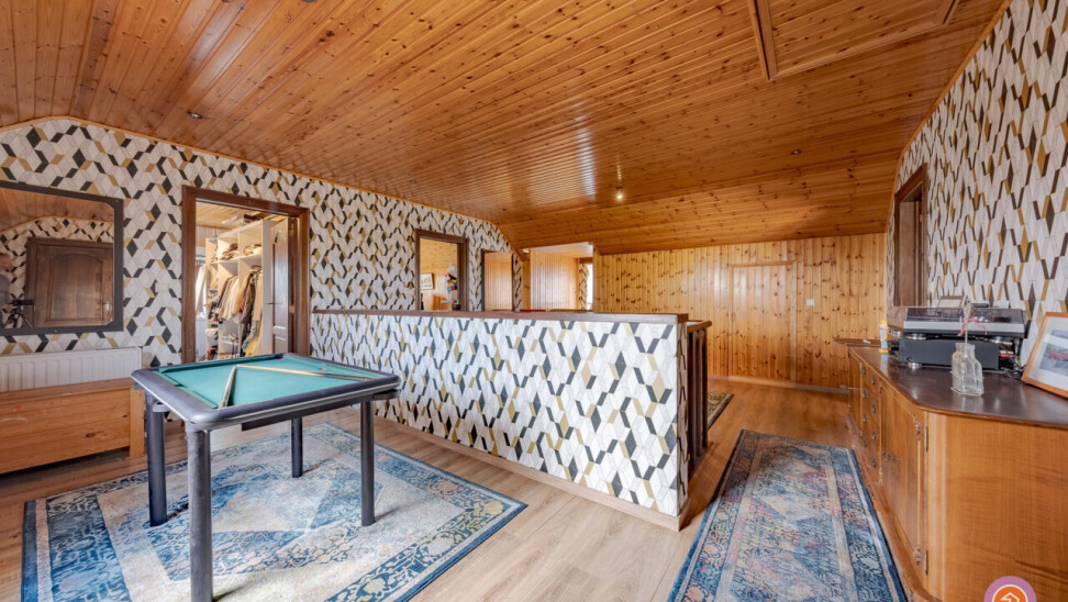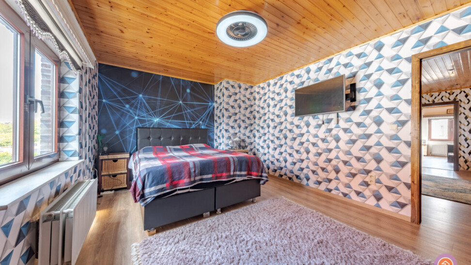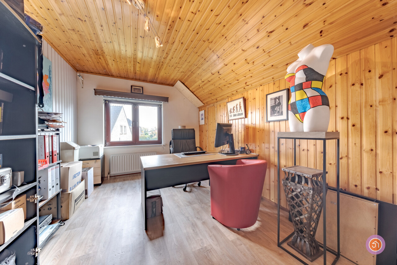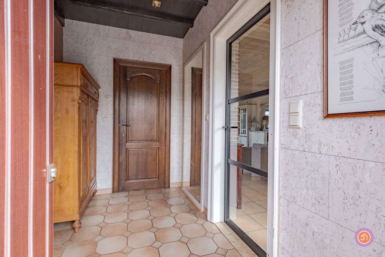 We komen binnen via de ruime inkomhal die toegang geeft tot enerzijds een bureauruimte/ slaapkamer en anderzijds de gezellige leefruimte met aansluitend de volledig geïnstalleerde keuken. Wanneer we door de keuken wandelen, komen we in de hal waar we toegang hebben tot de badkamer met dubbele lavabo, douche, ligbad en toilet. Verder vinden we op het gelijkvloers nog een gastentoilet.